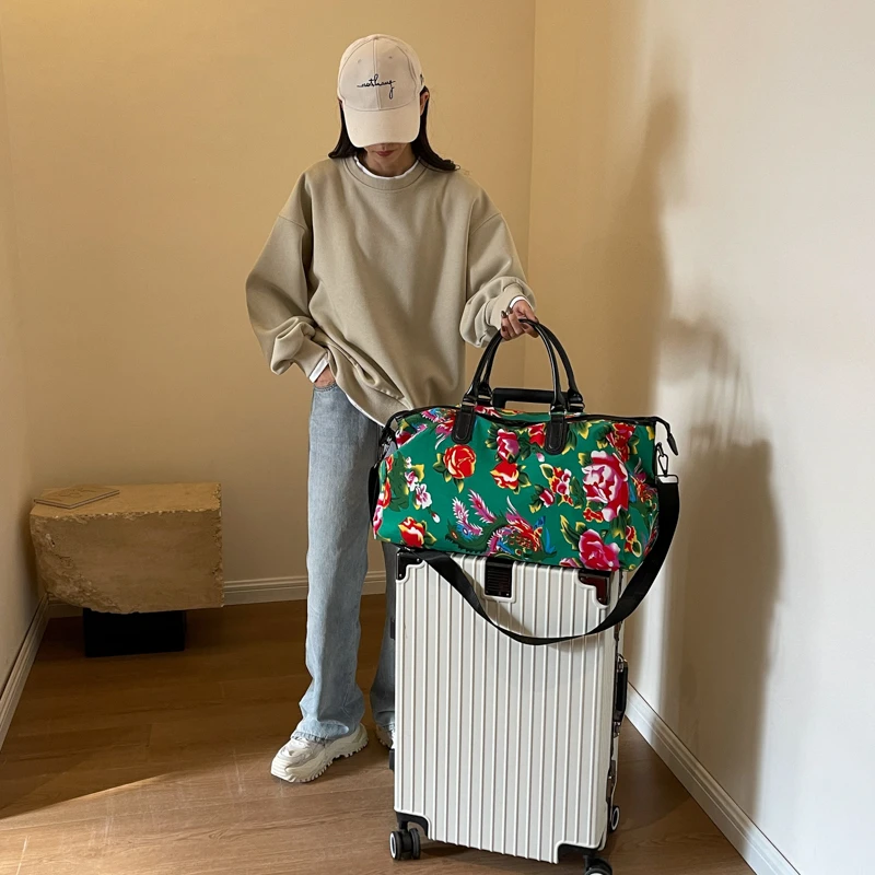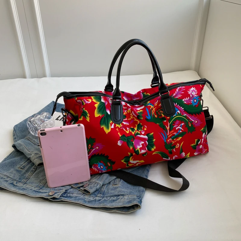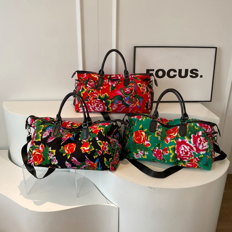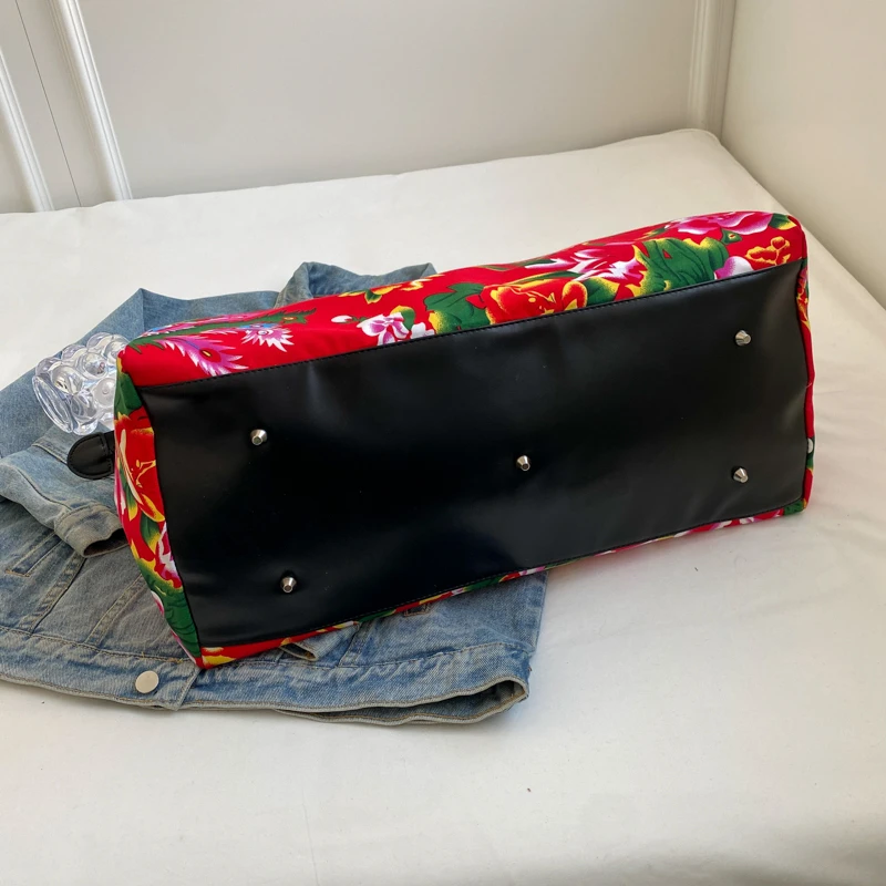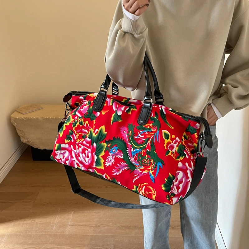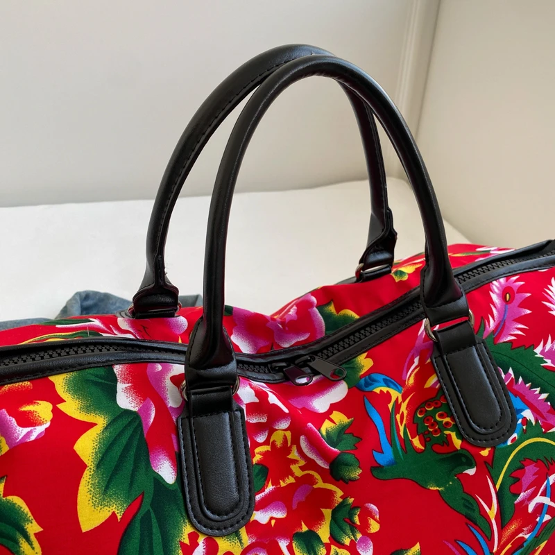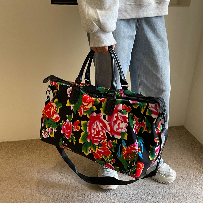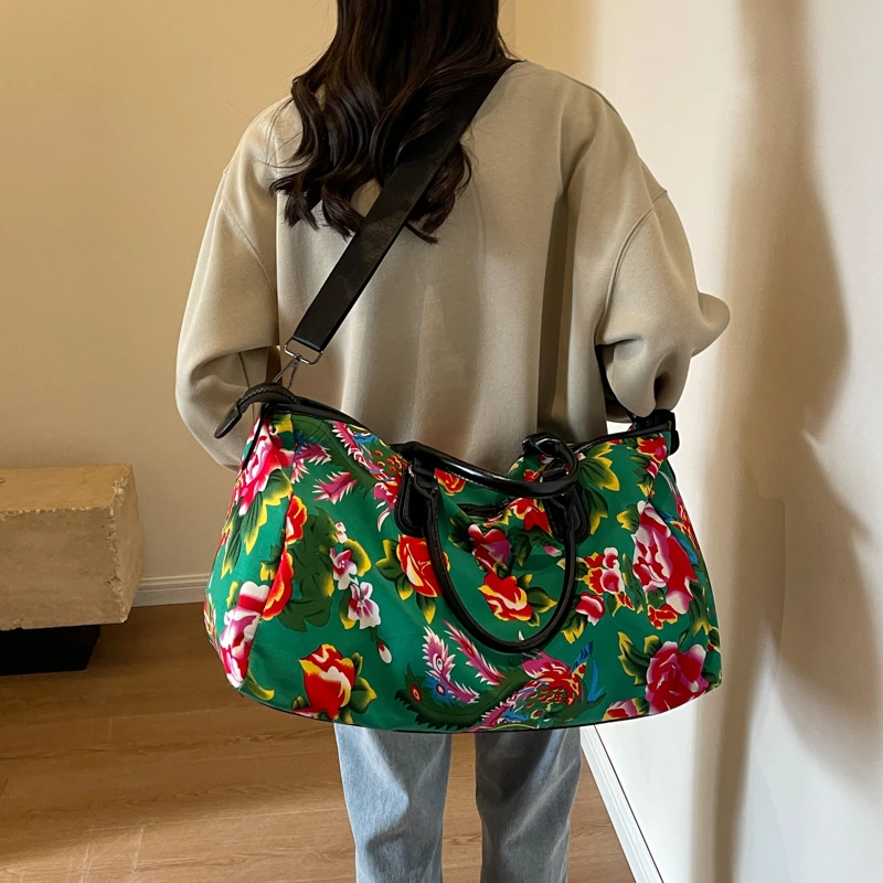 Large Capacity Shoulder Weekender Bag Trendy Ethnic Style Flower Pattern Travel Duffel Bag
