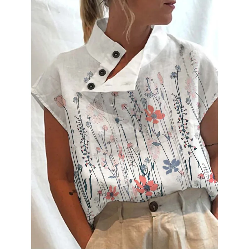 Leisure Summer Women Tops Blouse Vintage Floral Print Short Sleeve White Blouses Casual Buttons Slit Stand Neck Blouse