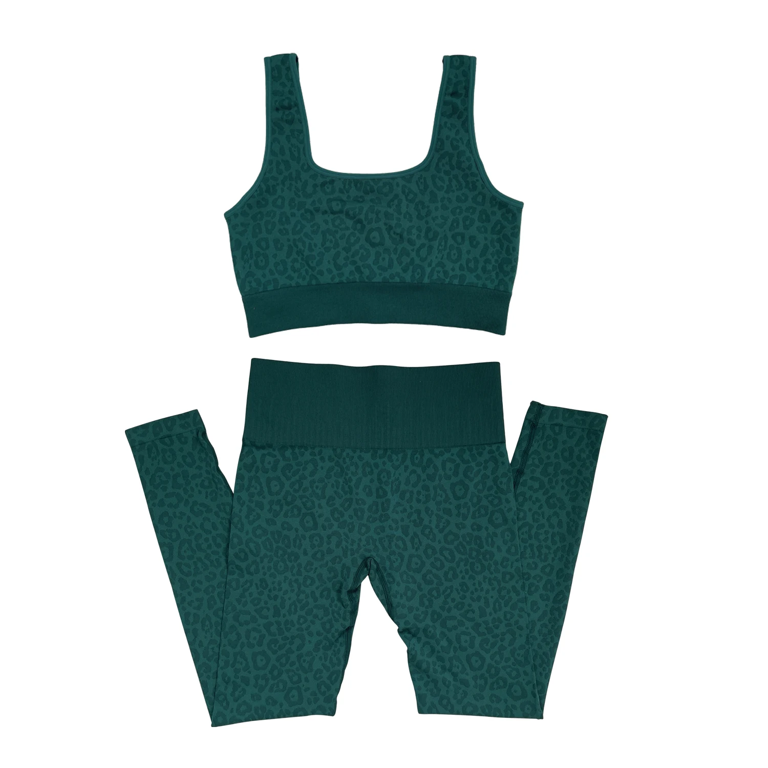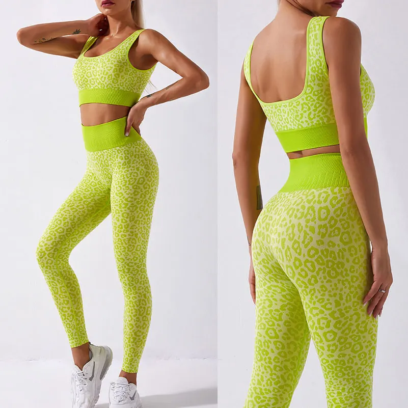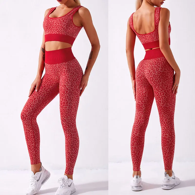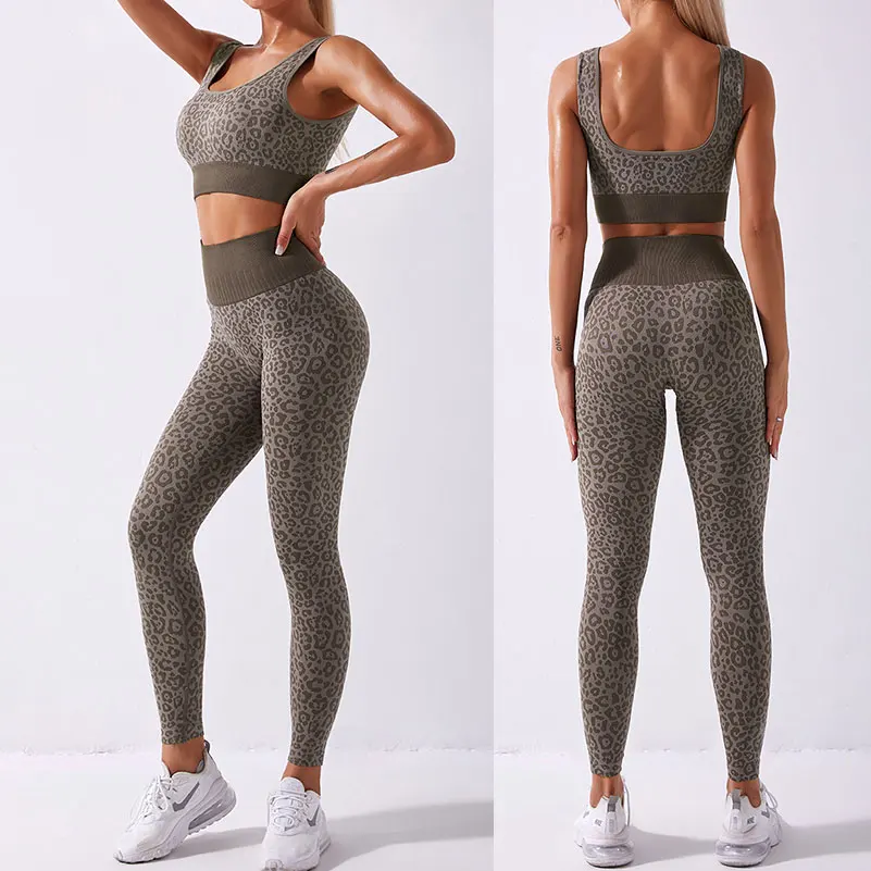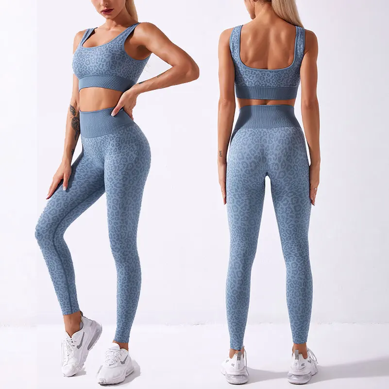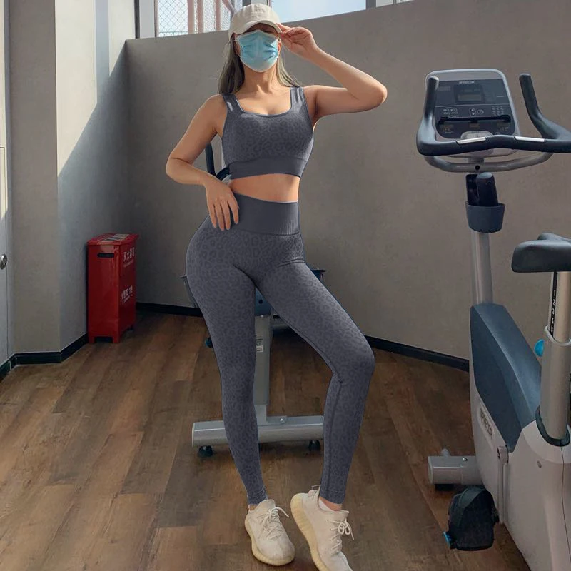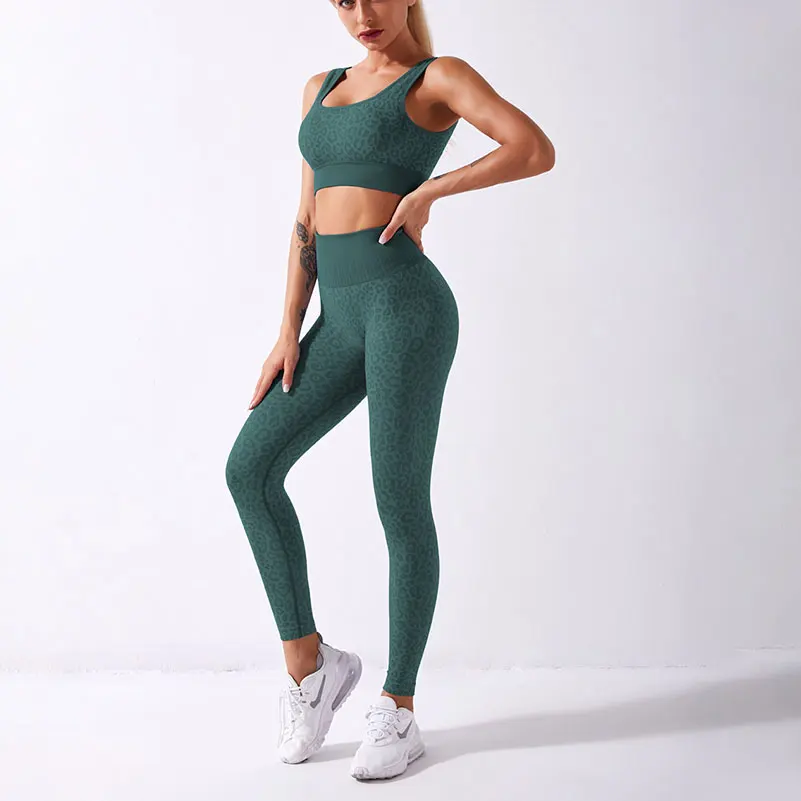 Leopard Embossed Women High Waist Sport Yoga Pants Shiny Yoga Activewear Leggings Compression Workout Sportswear Gym Fitness Set