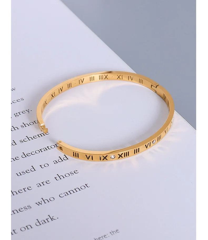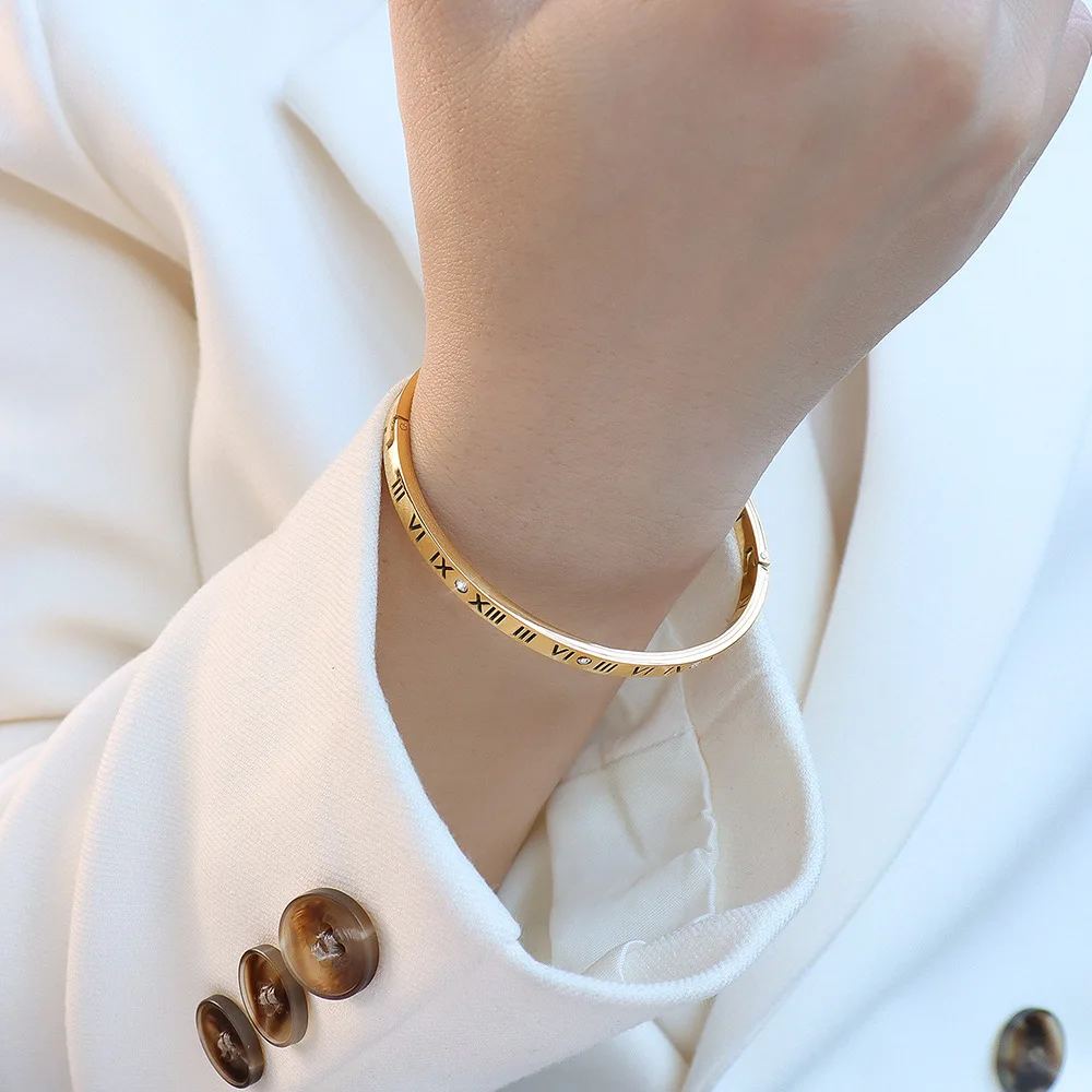 Lewell Ins Trendy Roman Numerals Bracelet Gold Cuff Bangle 18K Gold PVD Plated Stainless Steel Bangle For Women