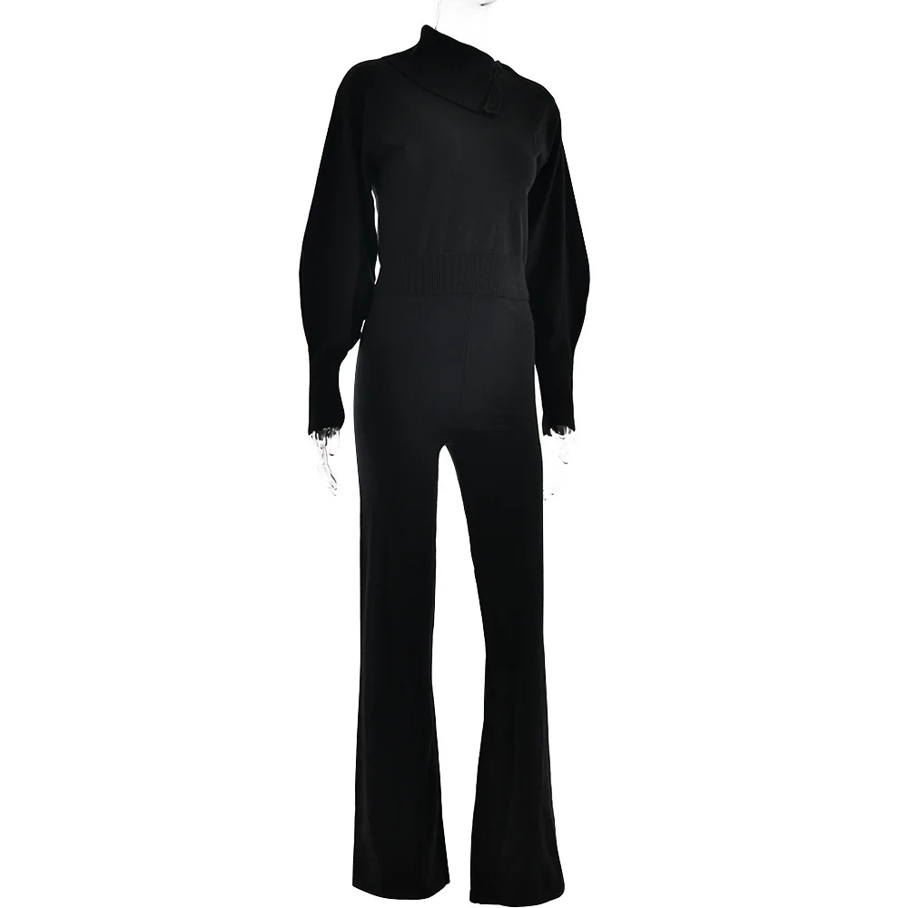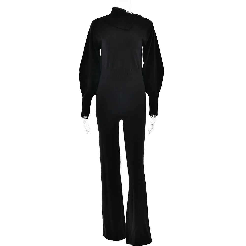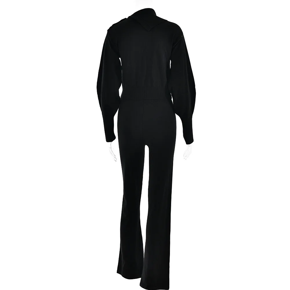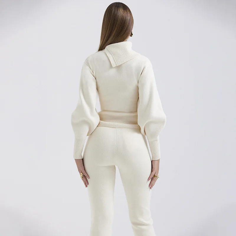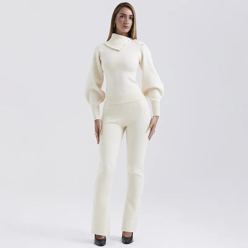 Liu Ming Hot Trending Products 2024 Women Fall Winter Knitted Two Piece Irregular Button Lapel Sweater Flare Pants Matching Set