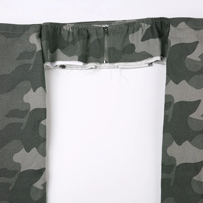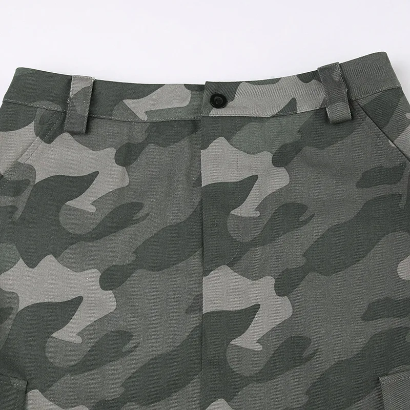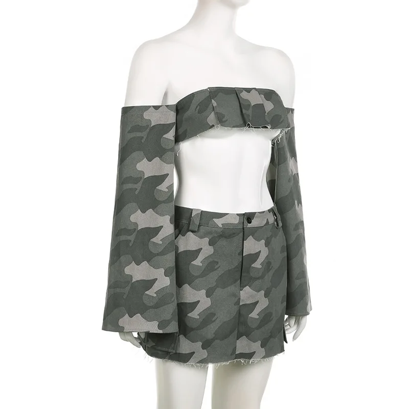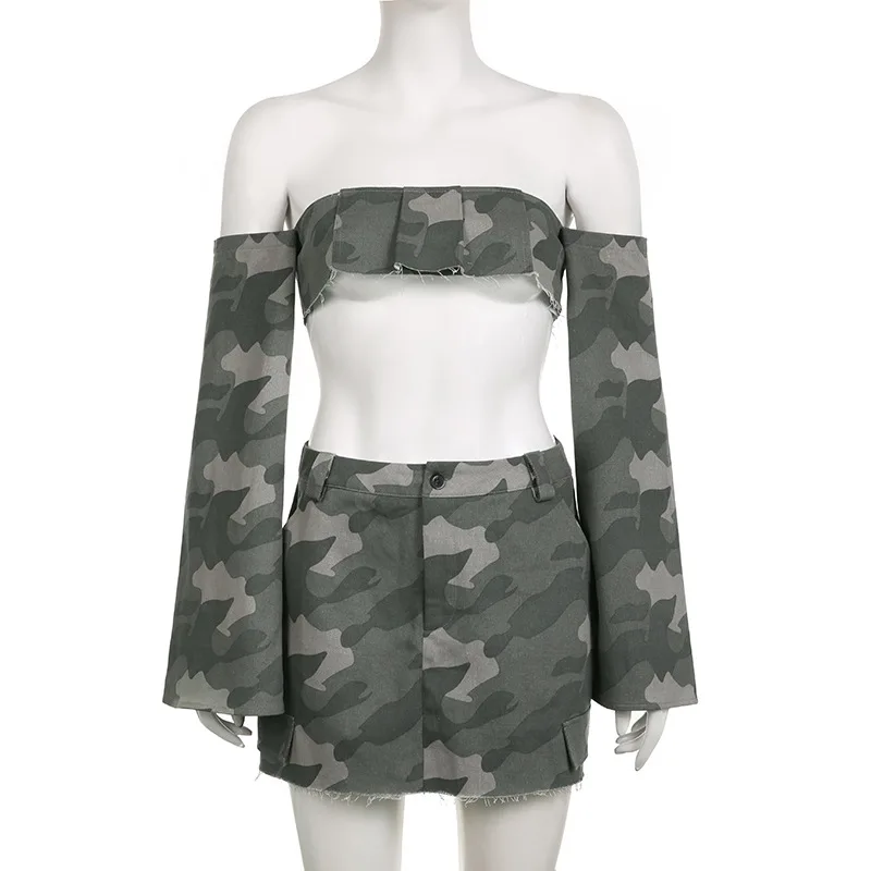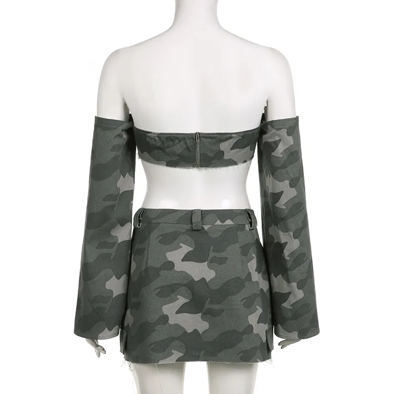 Liu Ming New Autumn 2024 Trending Streetwear Women Sexy Off Shoulder Crop Tops Camouflage Printed Cargo Mini Skirt Set