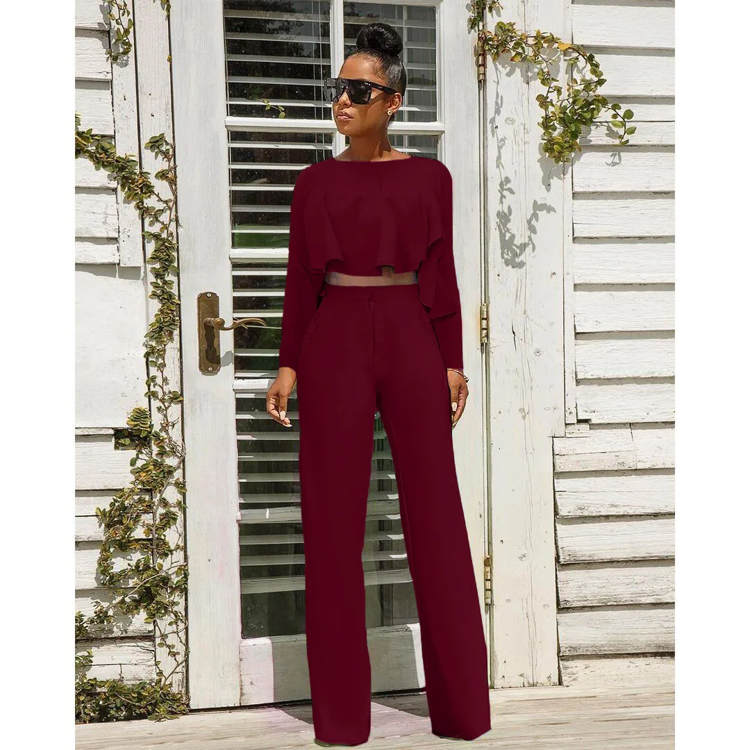 Liu Ming Popular Women Casual Custom Printed Long Sleeve O Neck Two Piece Tops Wide Leg Long Pants Set