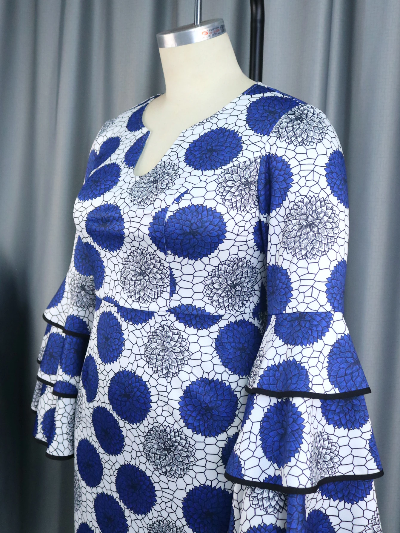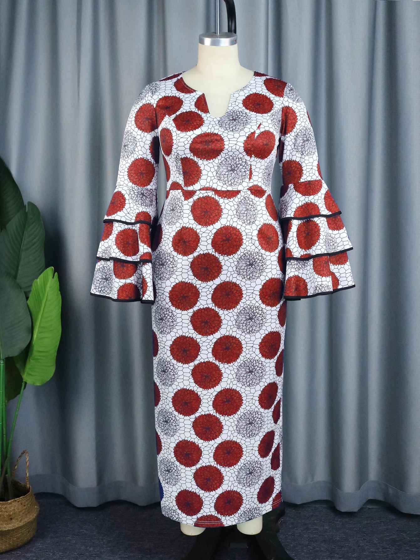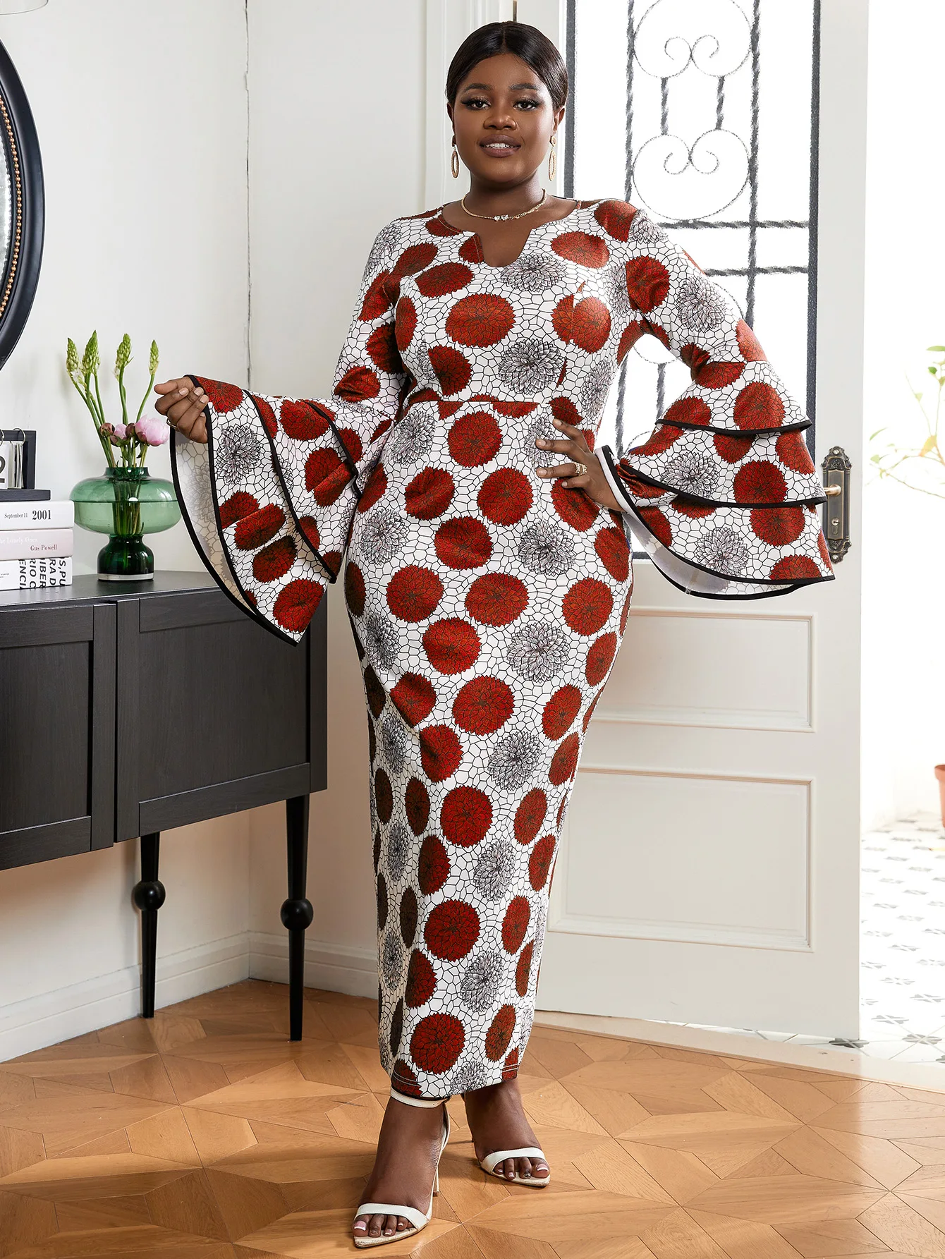 Long Flare Sleeves Autumn Maxi Print Large Size Women Cocktail Dresses