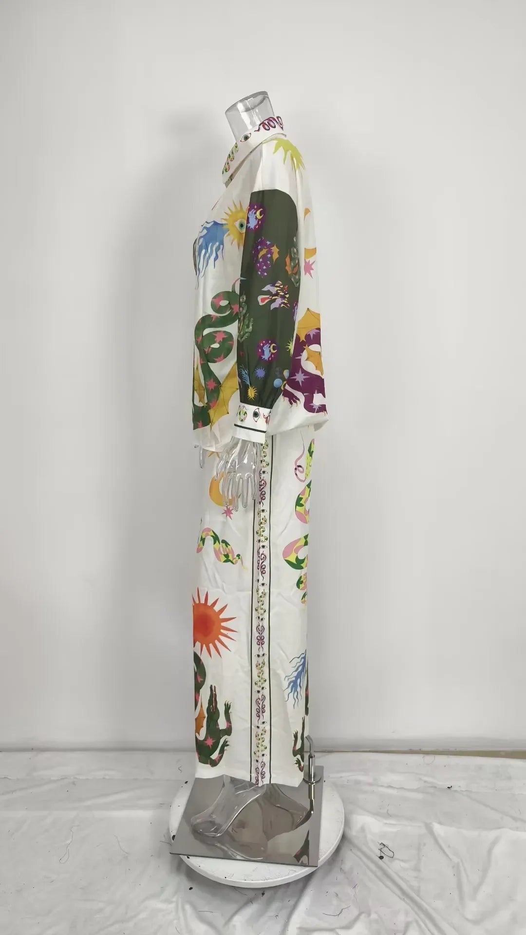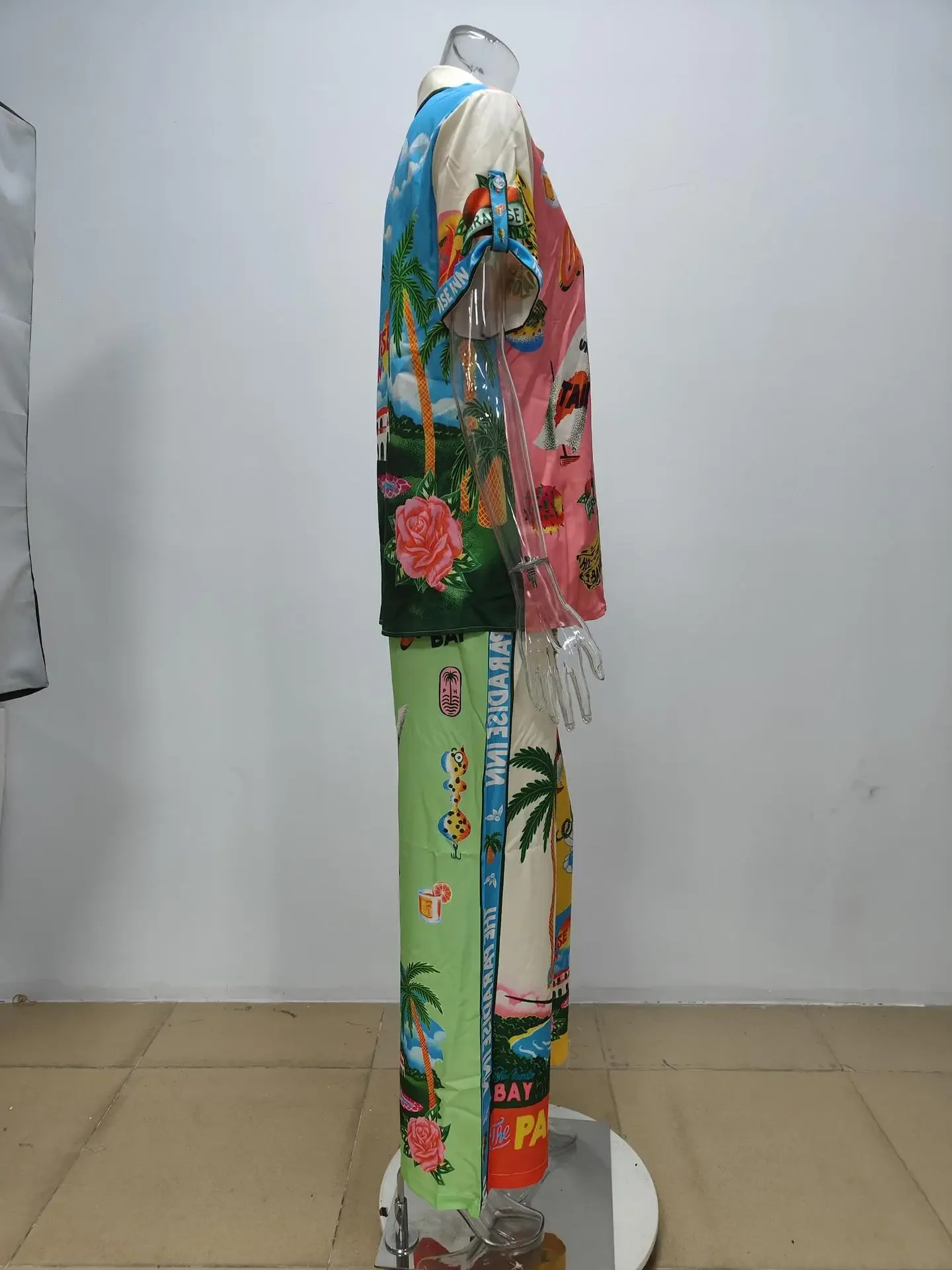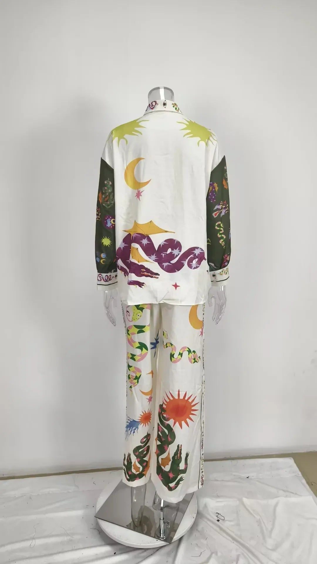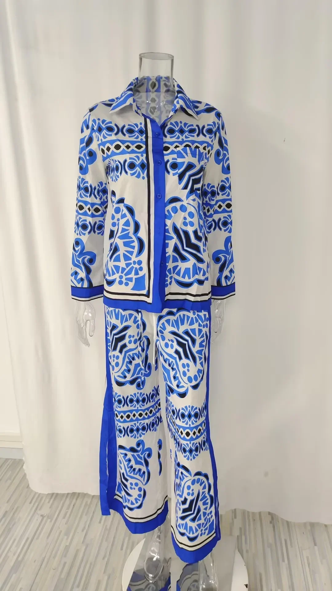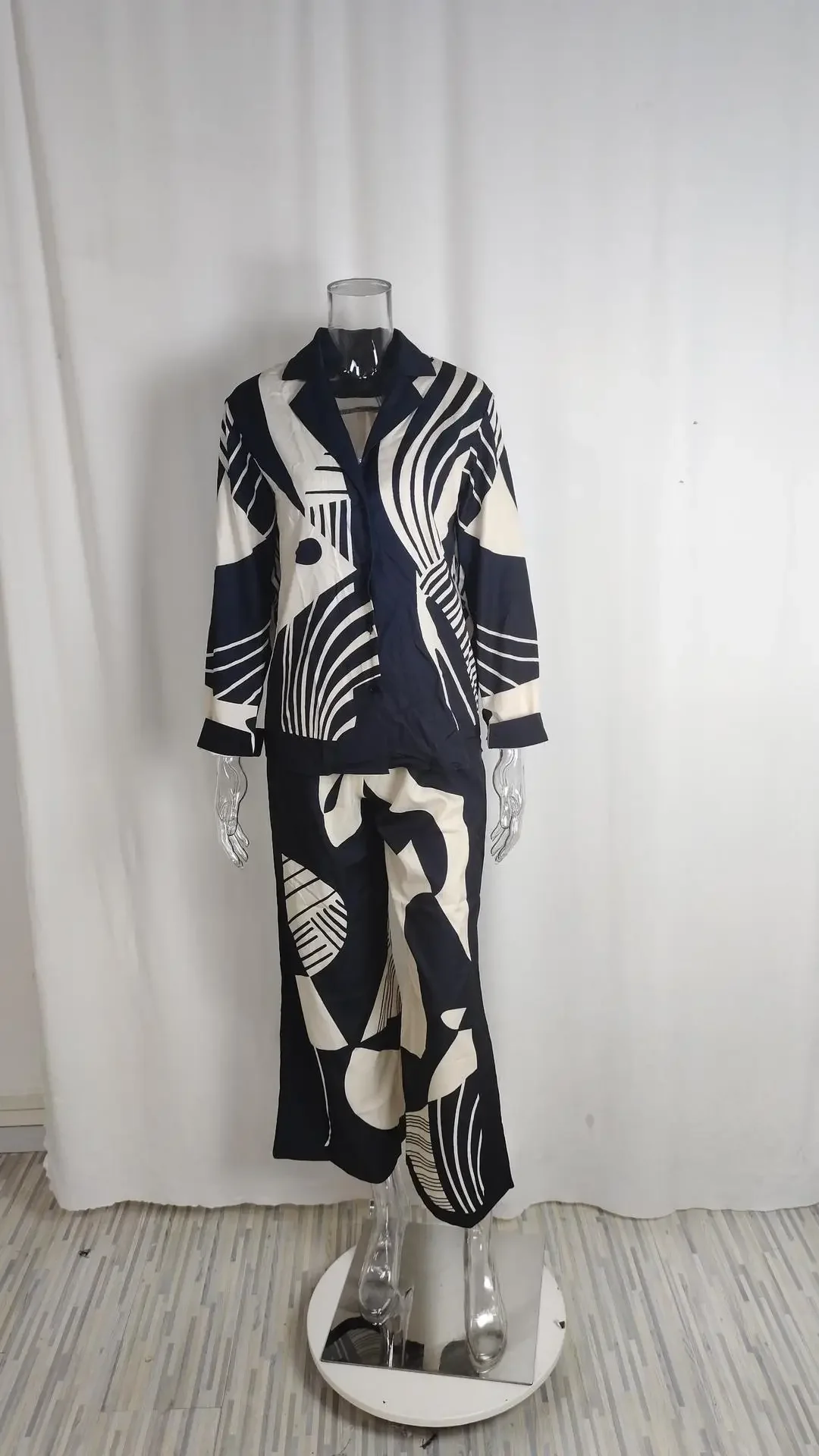 Long Sleeve Long Pant Sets Women Retro Lapel Single Breasted Blouses Trousers 2 Piece Set Printed Color-blocking Elastic Waist