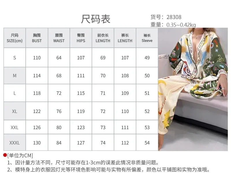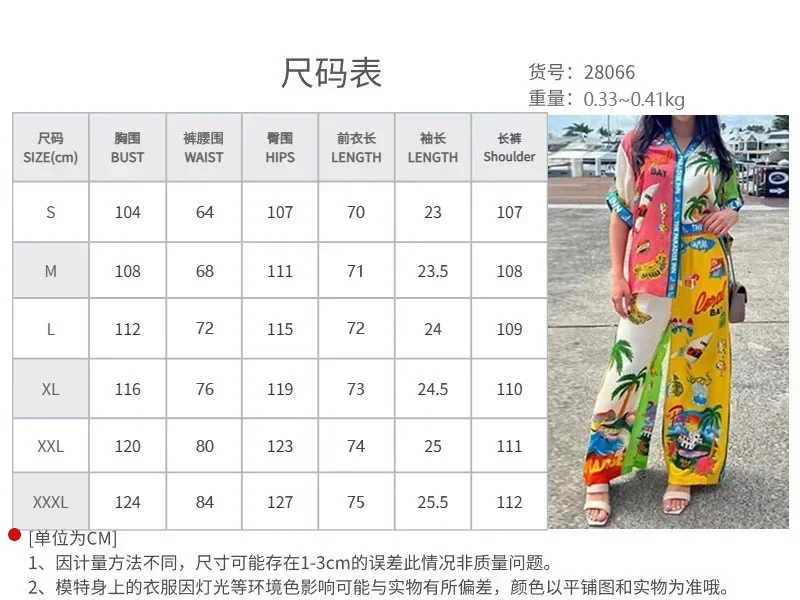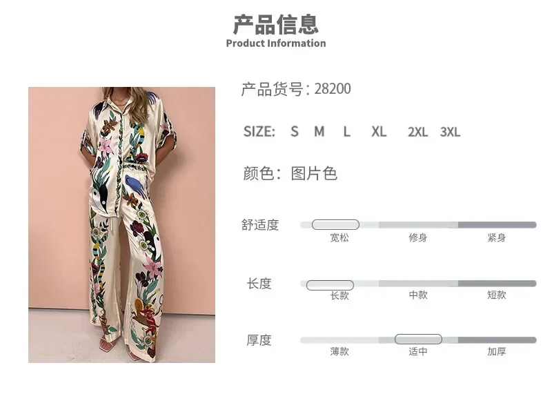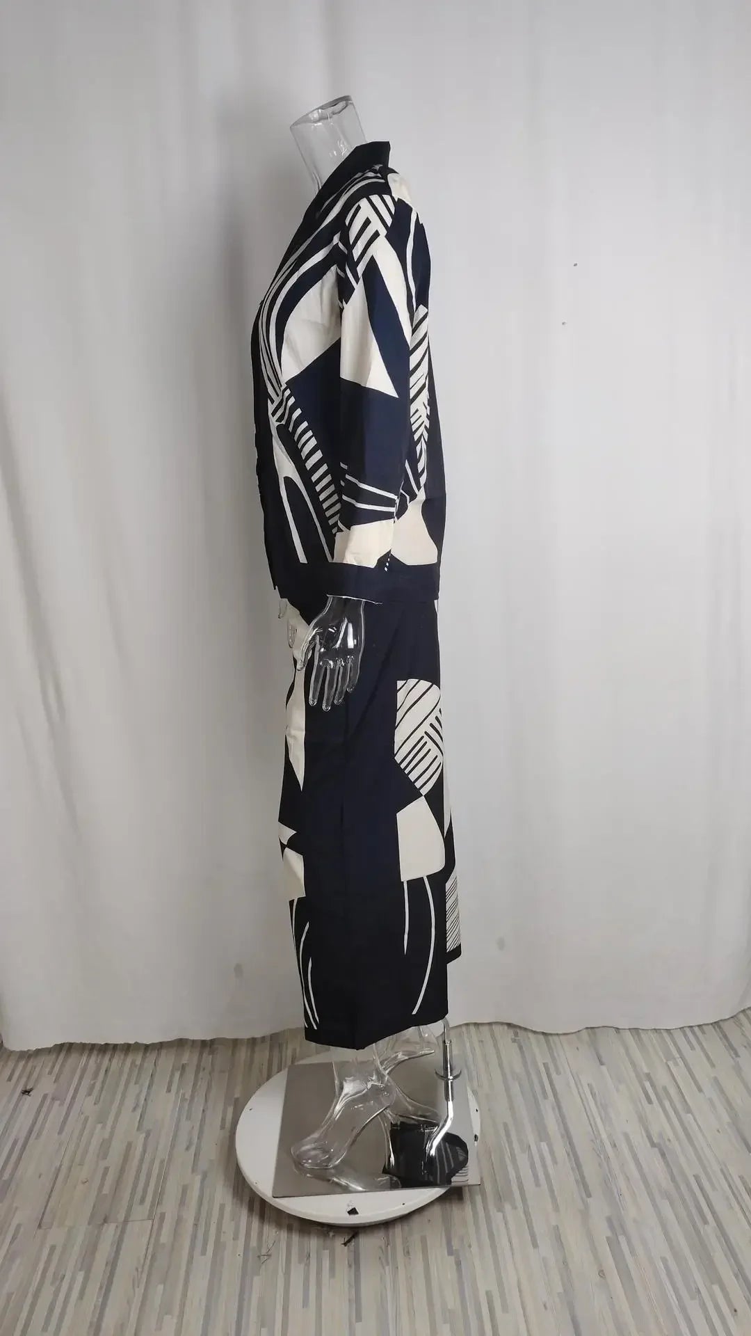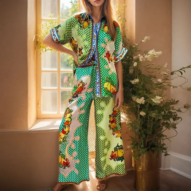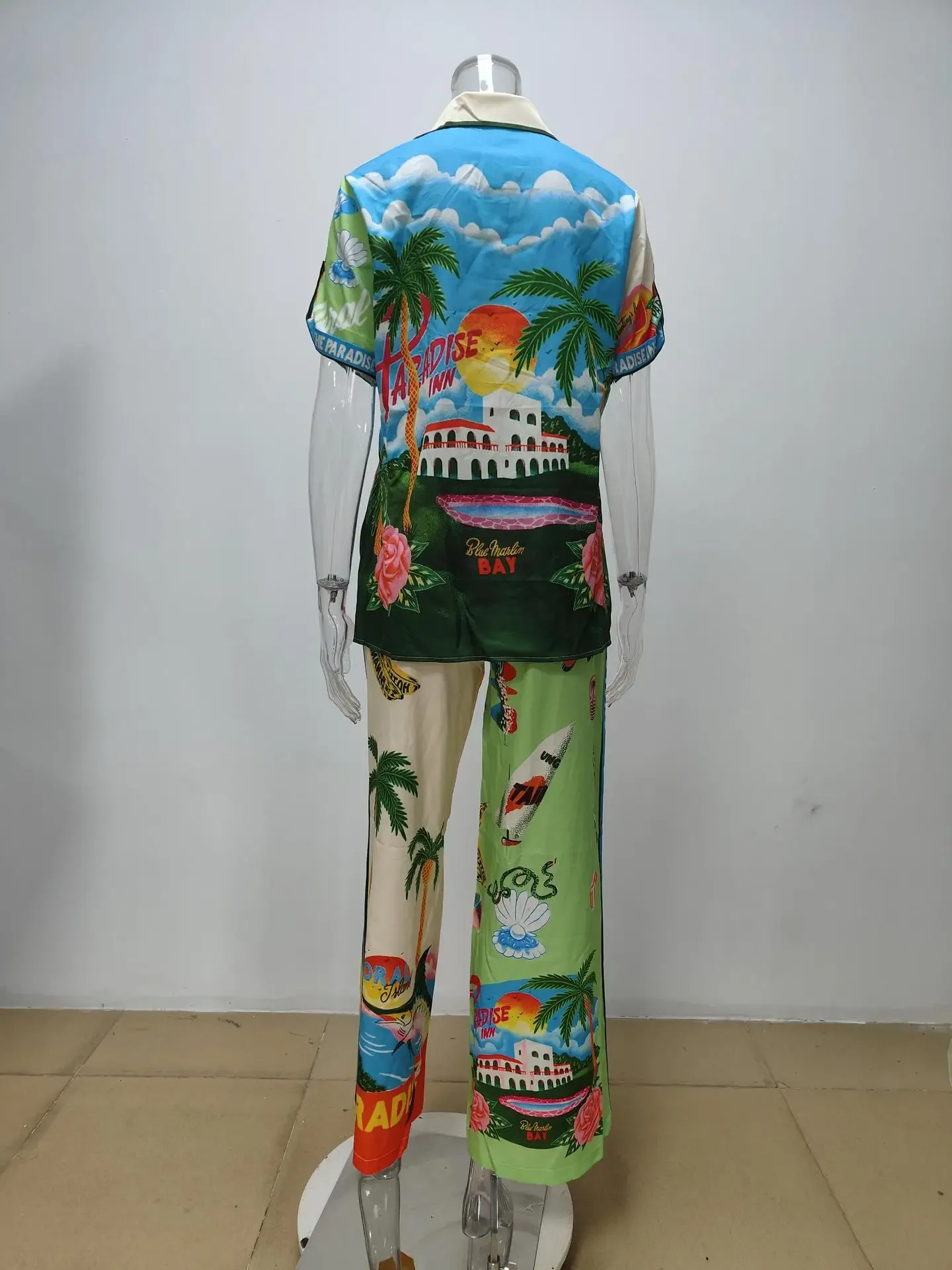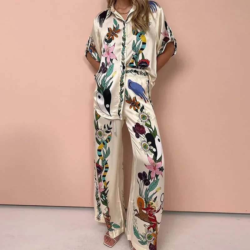 Long Sleeve Long Pant Sets Women Retro Lapel Single Breasted Blouses Trousers 2 Piece Set Printed Color-blocking Elastic Waist