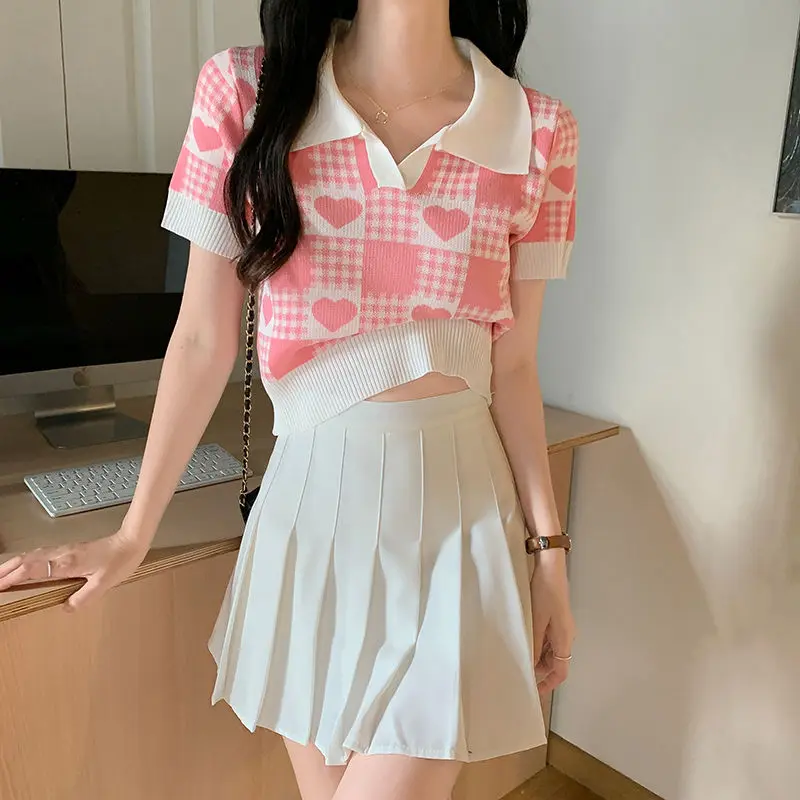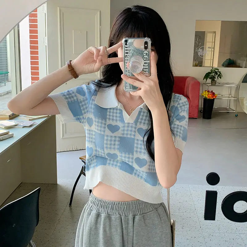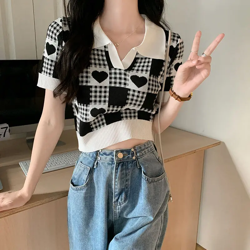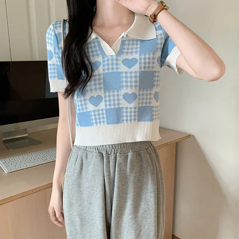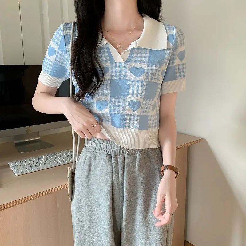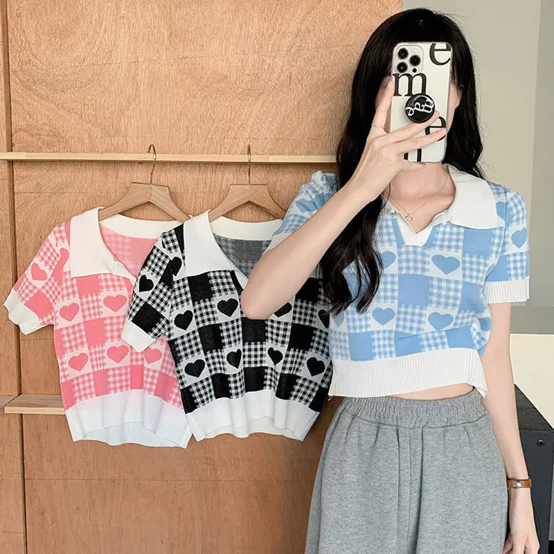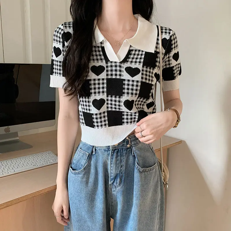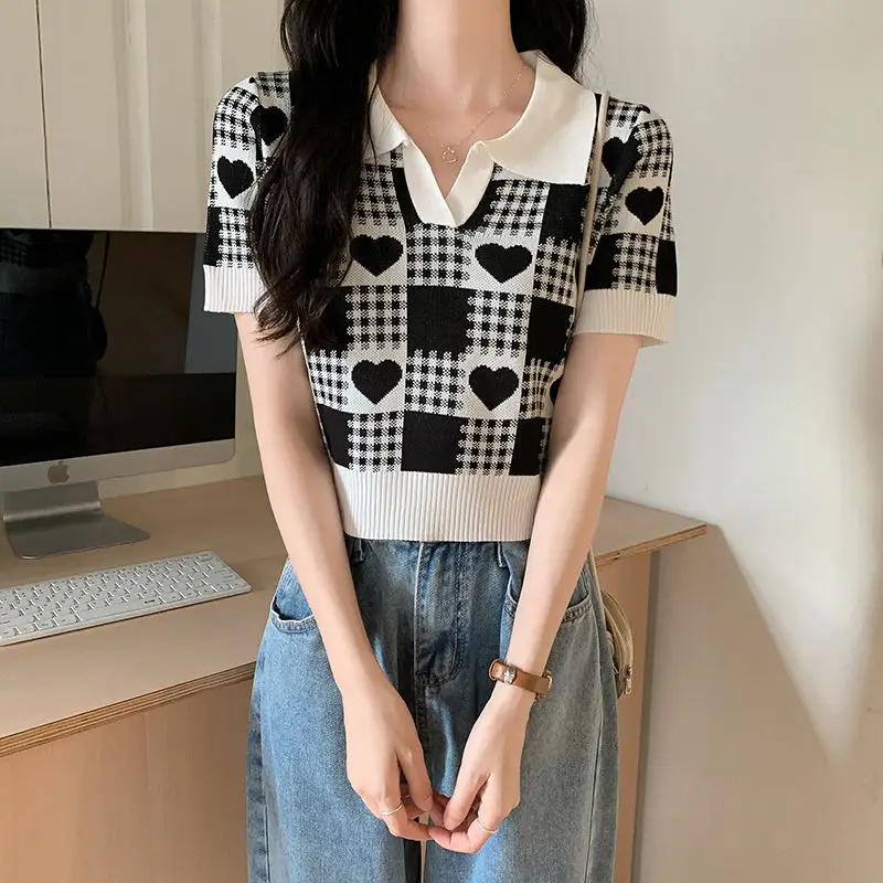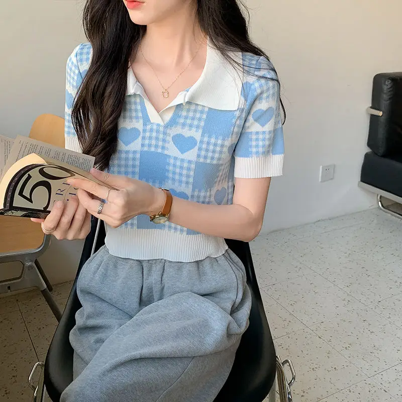 Love Colorblock Knitted Short-Sleeved T-Shirt Women'S Summer 2022 New Design Lapel Top T Shirt Fashion