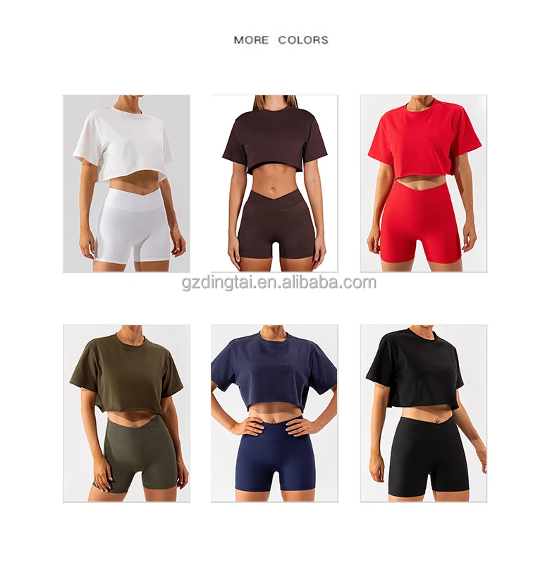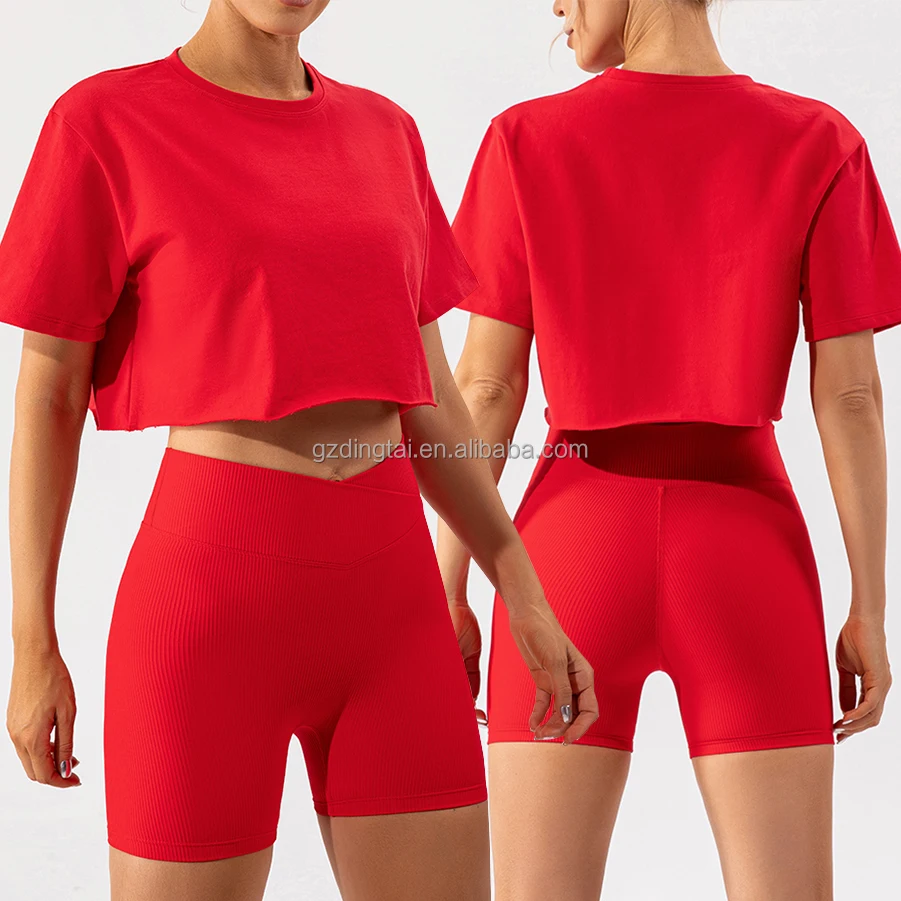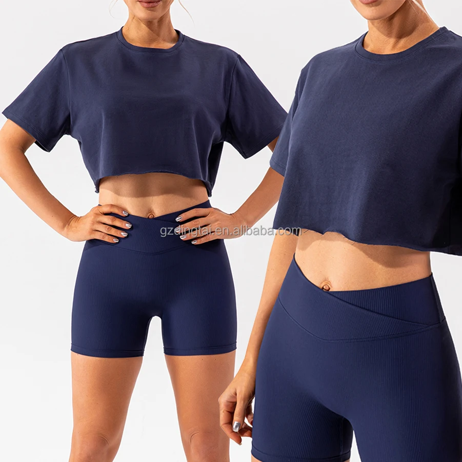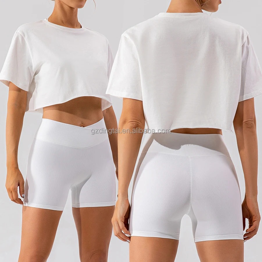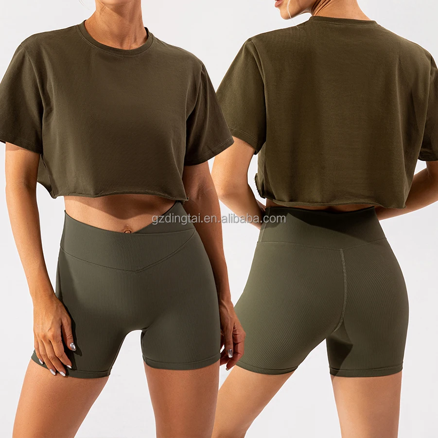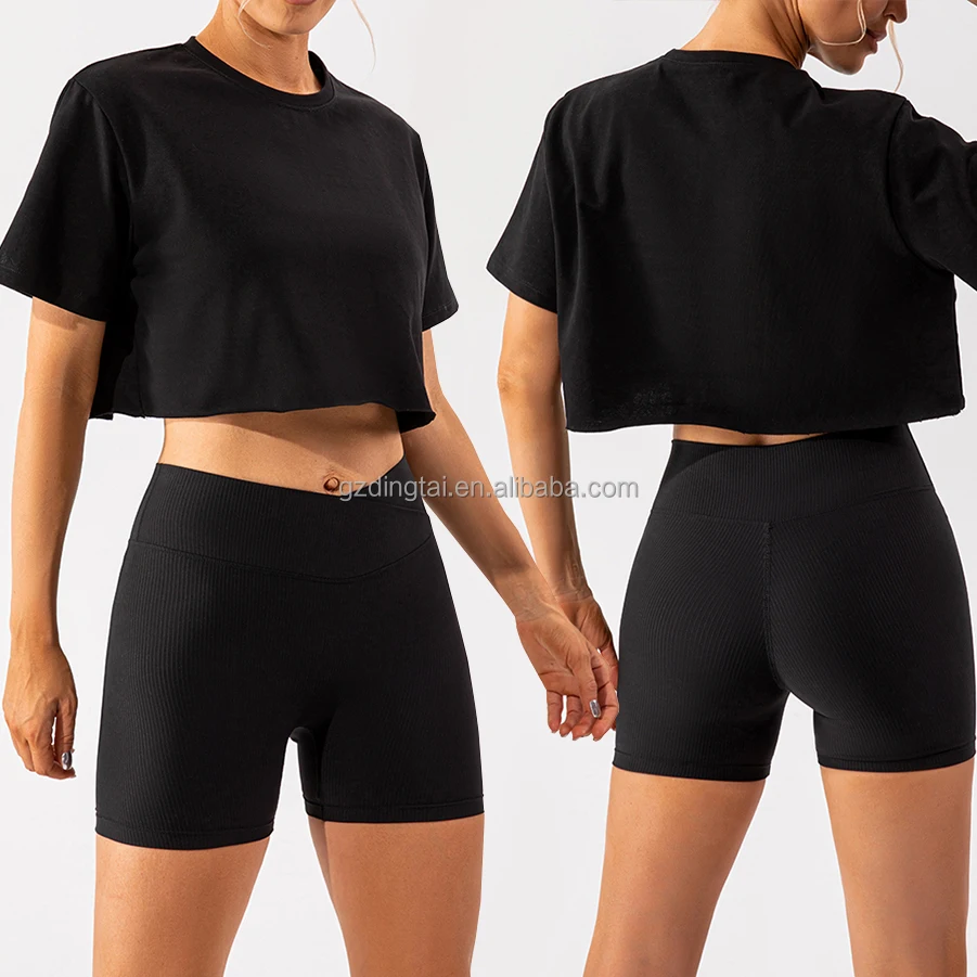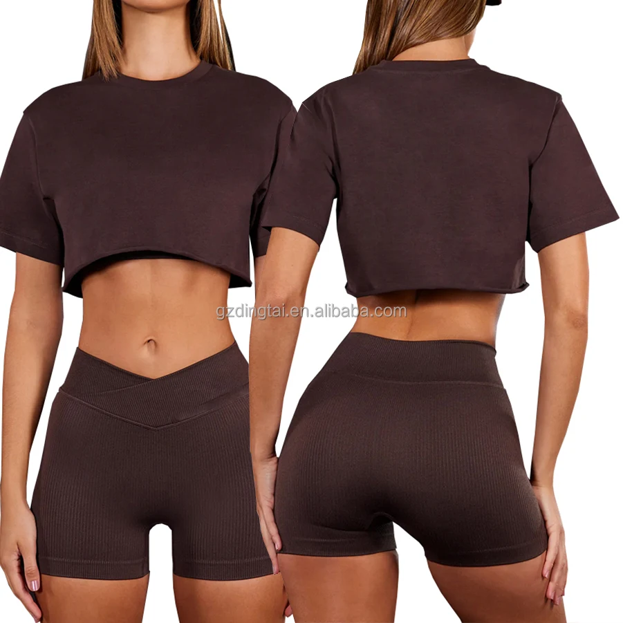 Low Moq High Quality Women 2 Pcs 2 Piece Short Sleeve Crop Top Gym Set Yoge Fitness Sport Casual Set