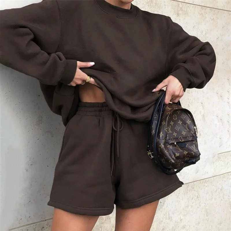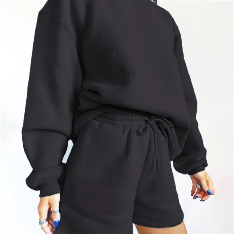 Lqxf001 Wholesale Ladies 2 Piece Loose Versatile Long Sleeve Sweater Pack Hip Shorts Set