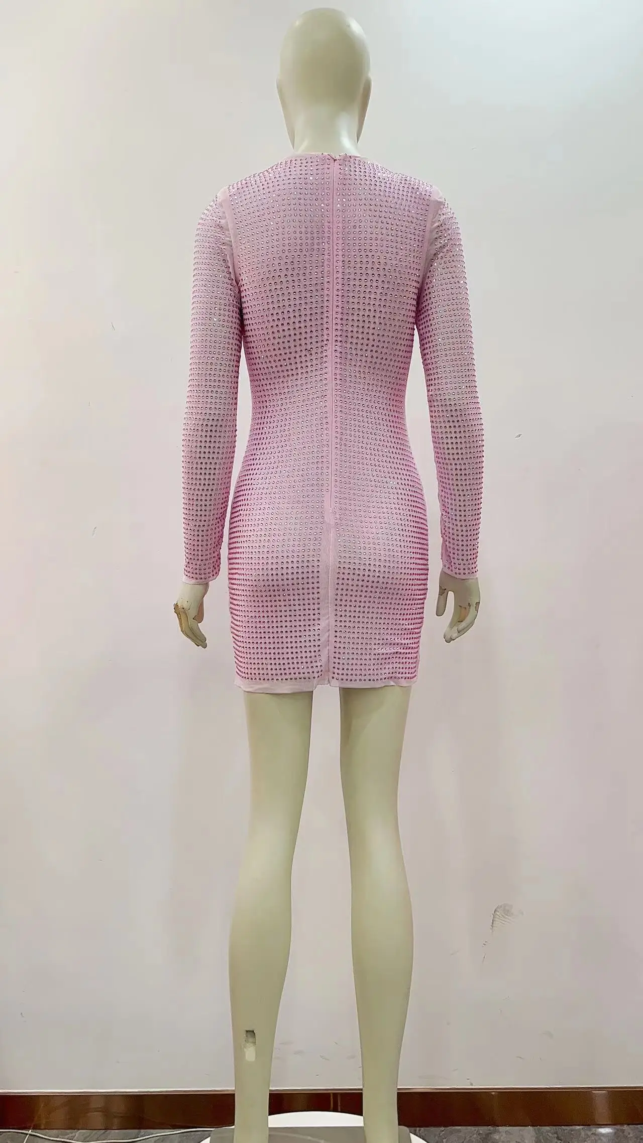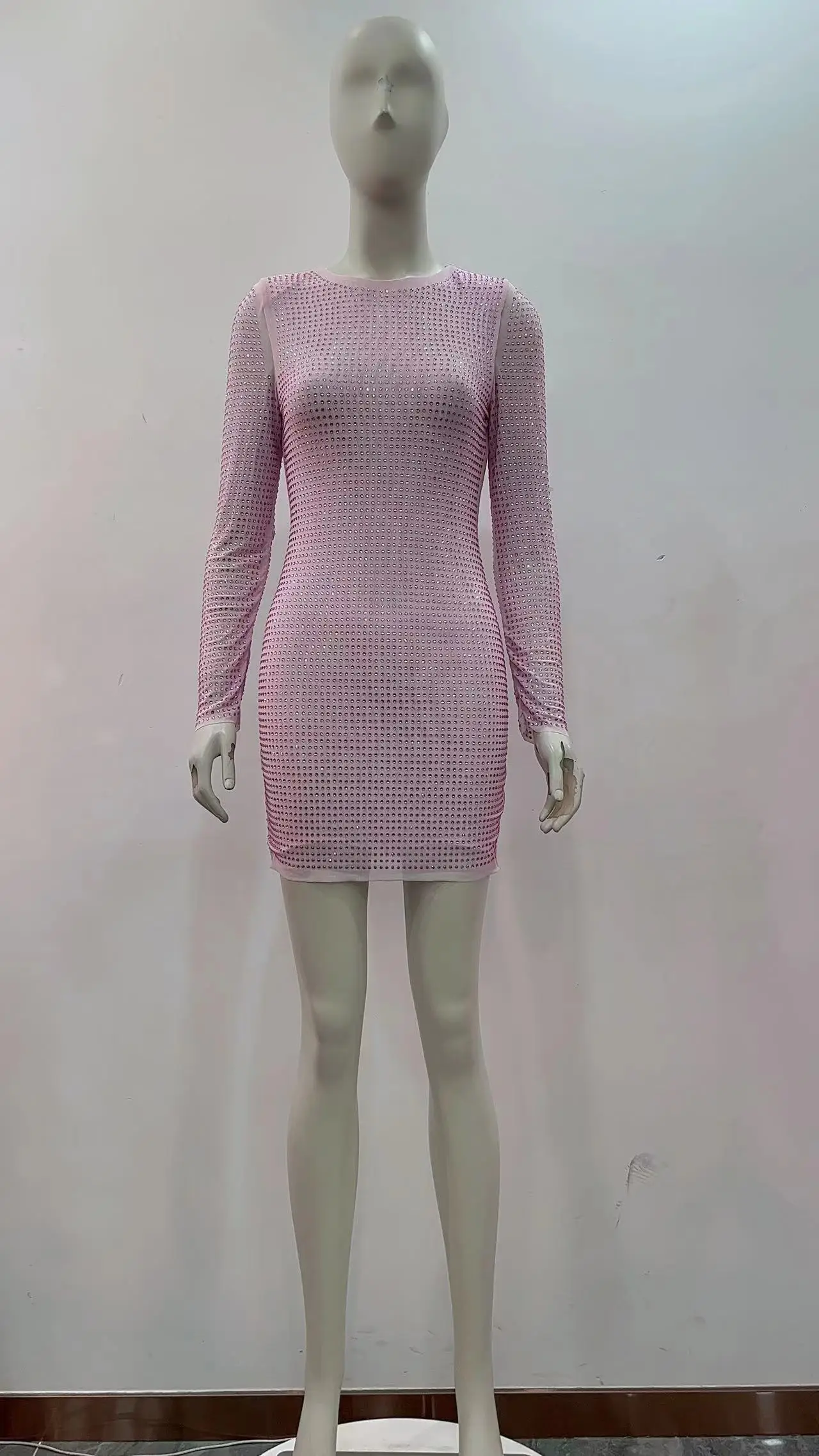 LS2278 High Quality Sparkly Rhinestones Long Sleeve Dress Sexy Mesh See Through Slim Mini Short Dress