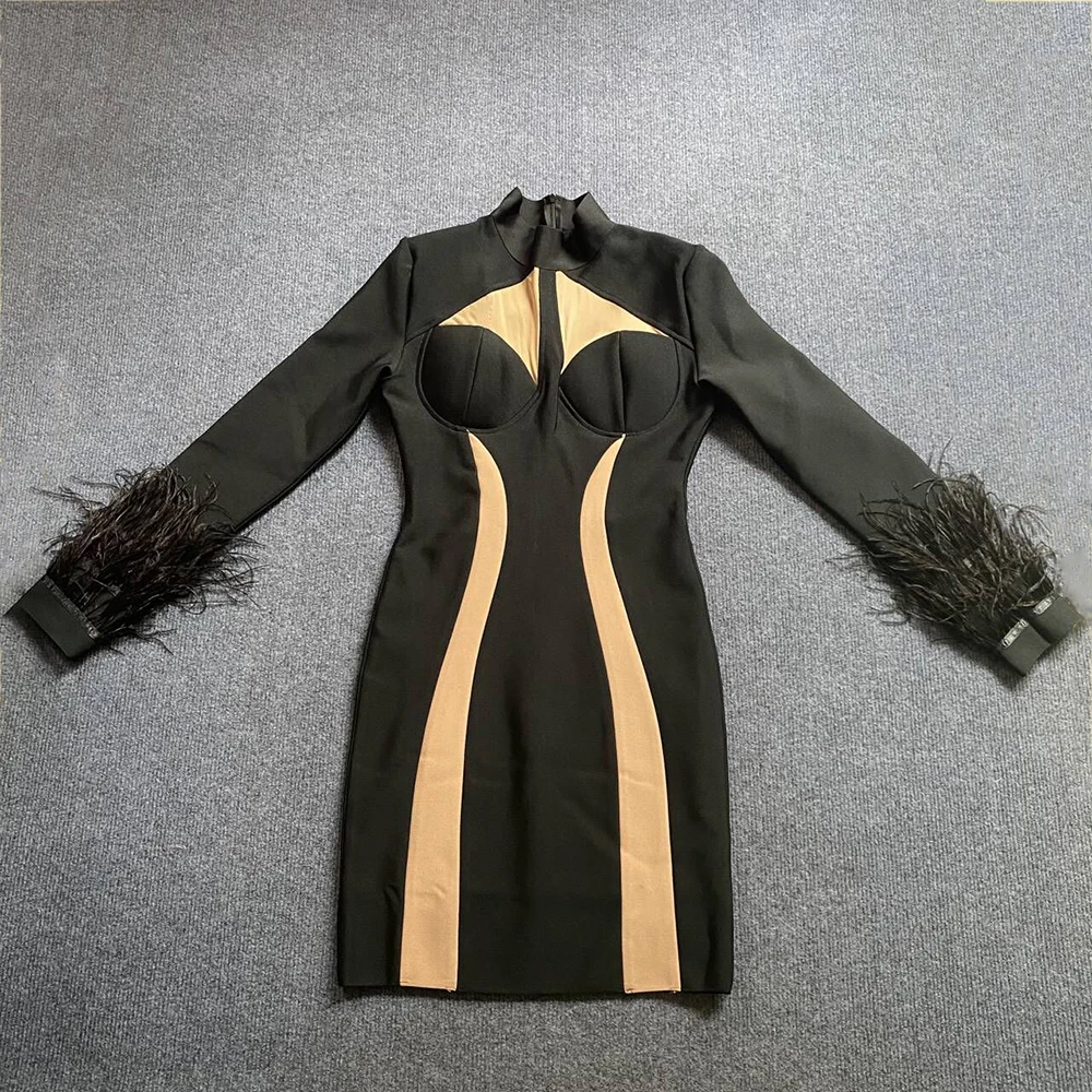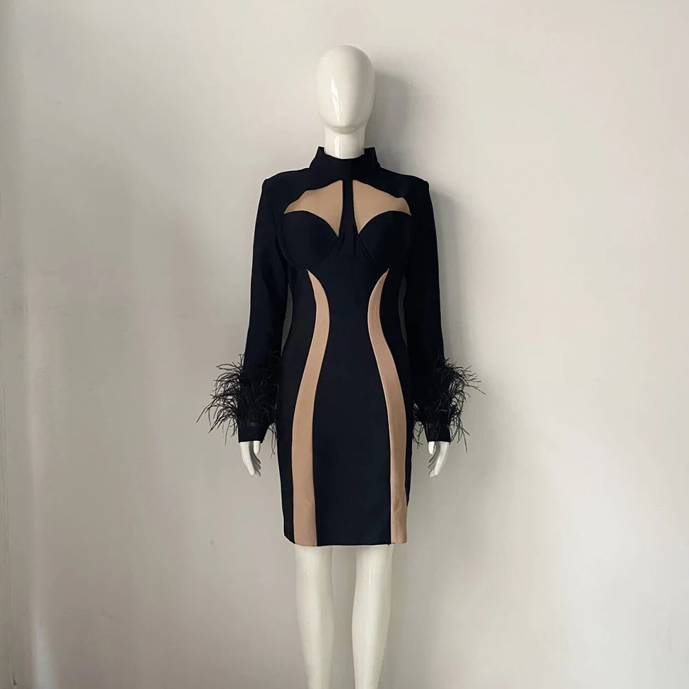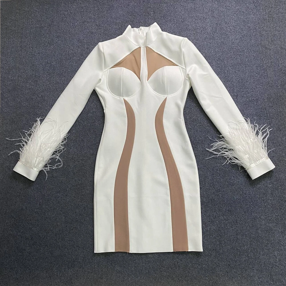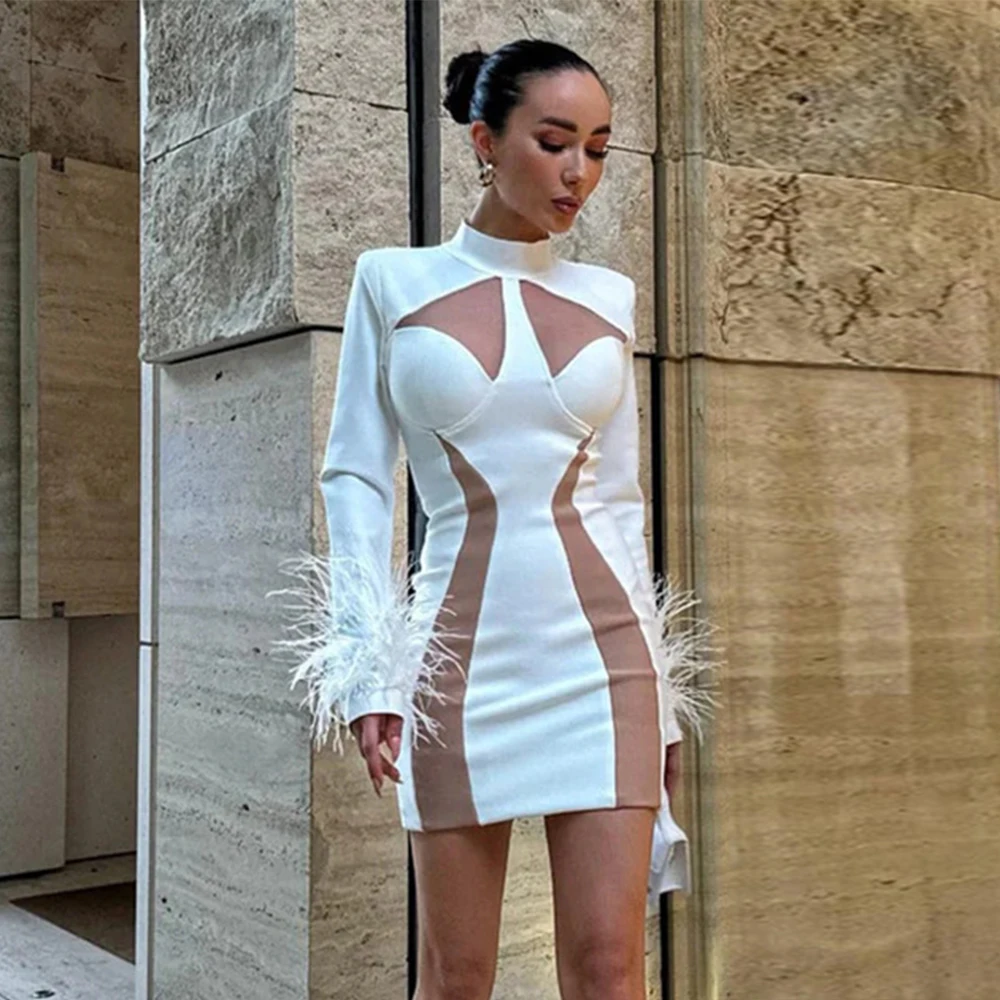 LS2321 Bandage Elegant Feather Dresses Hot Sexy Night Club Mini Dress Transparent Bandage Elegant Feather Dress