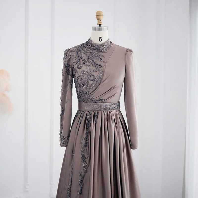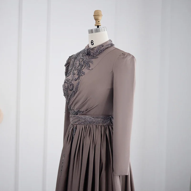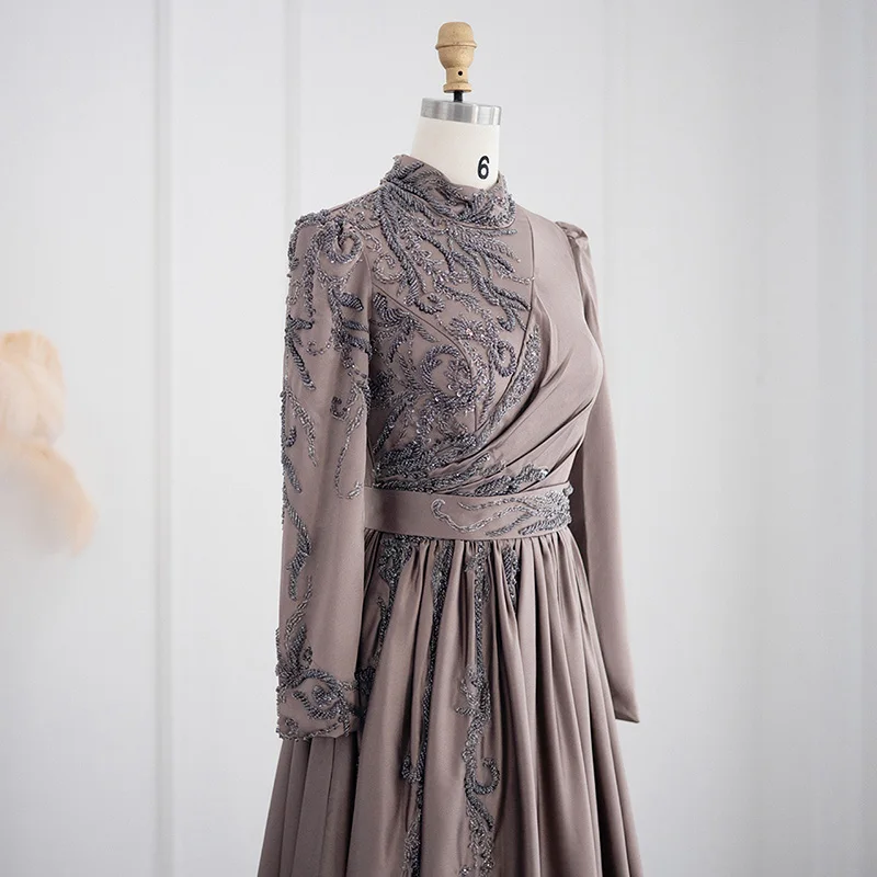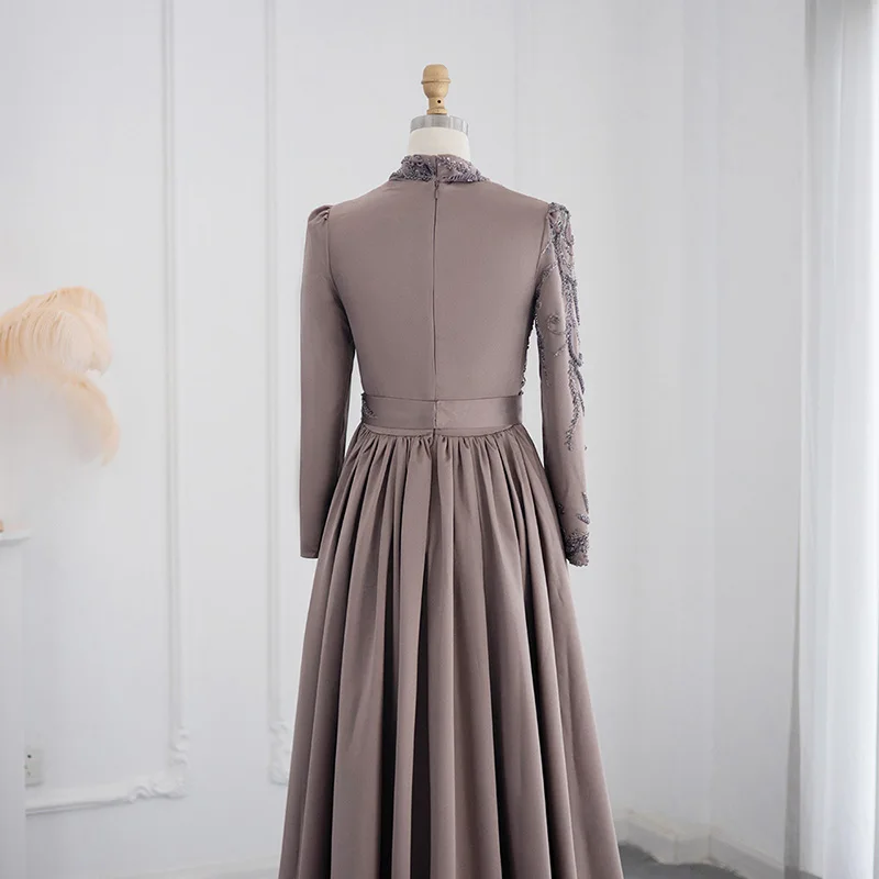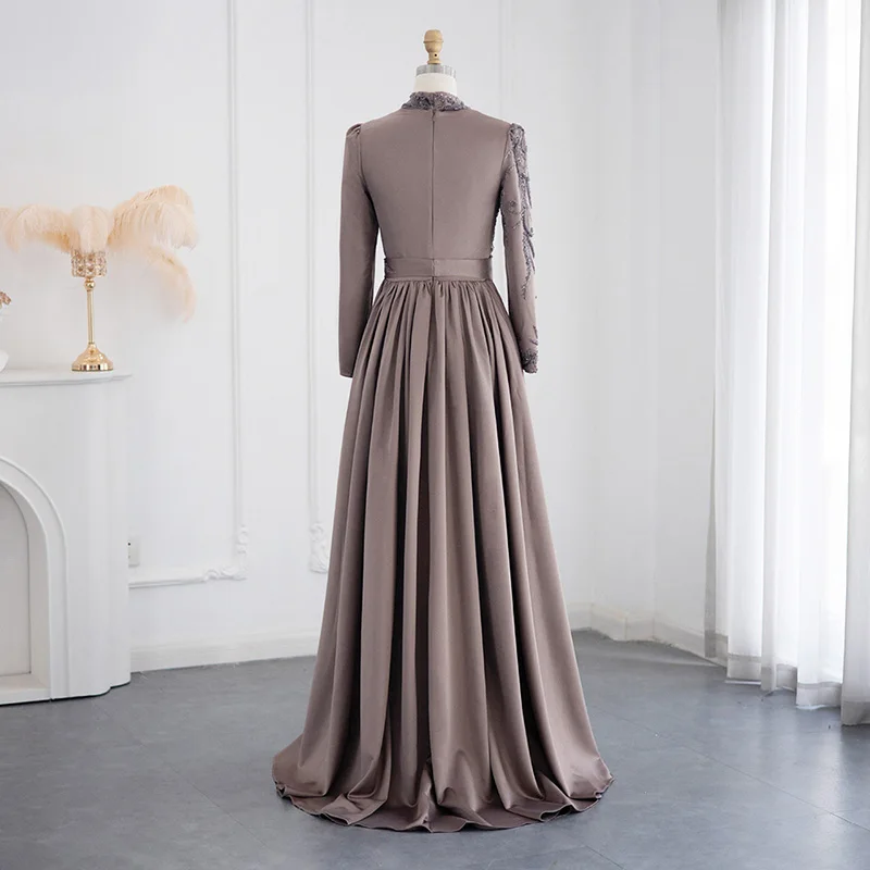 Lscz173 Brown Long Sleeve Muslim Evening Dresses Luxury Dubai Beading Arabic Formal Dress For Women Wedding Party Gown