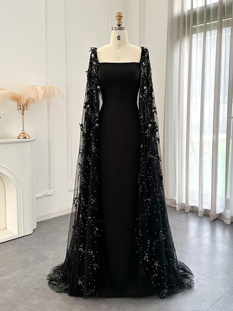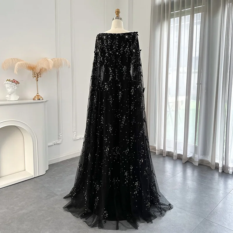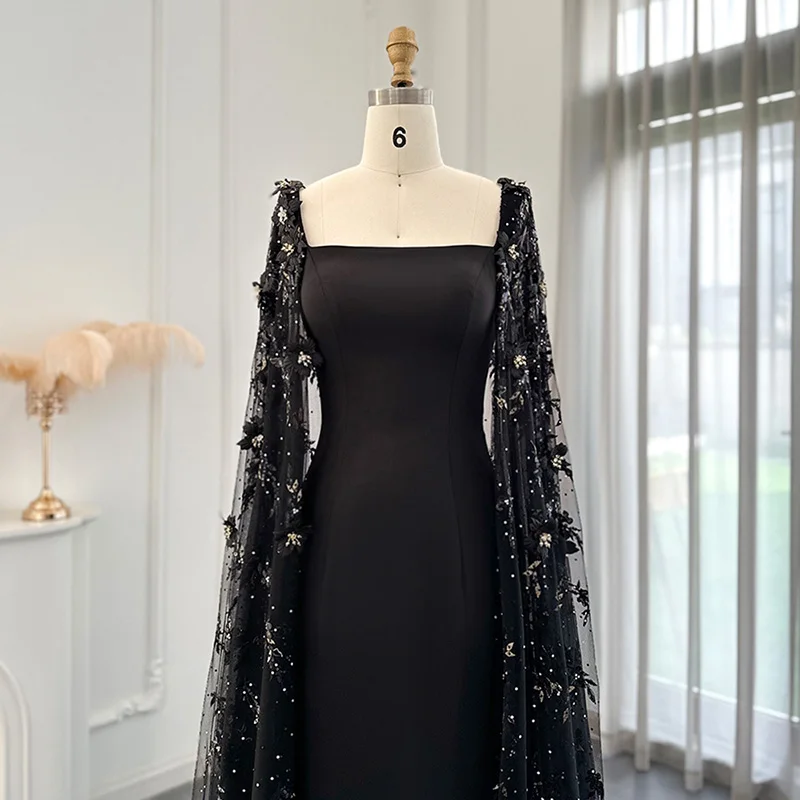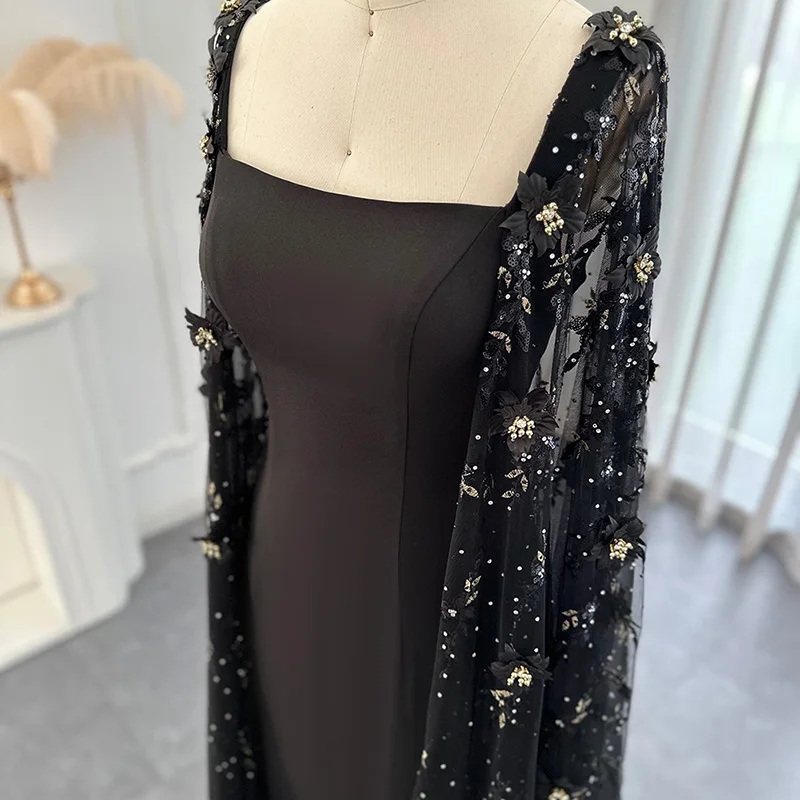 Lscz192 Luxury 3D Flowers Black Satin Arabic Evening Dress With Cape Elegant Mermaid Long Women Formal Party Gowns