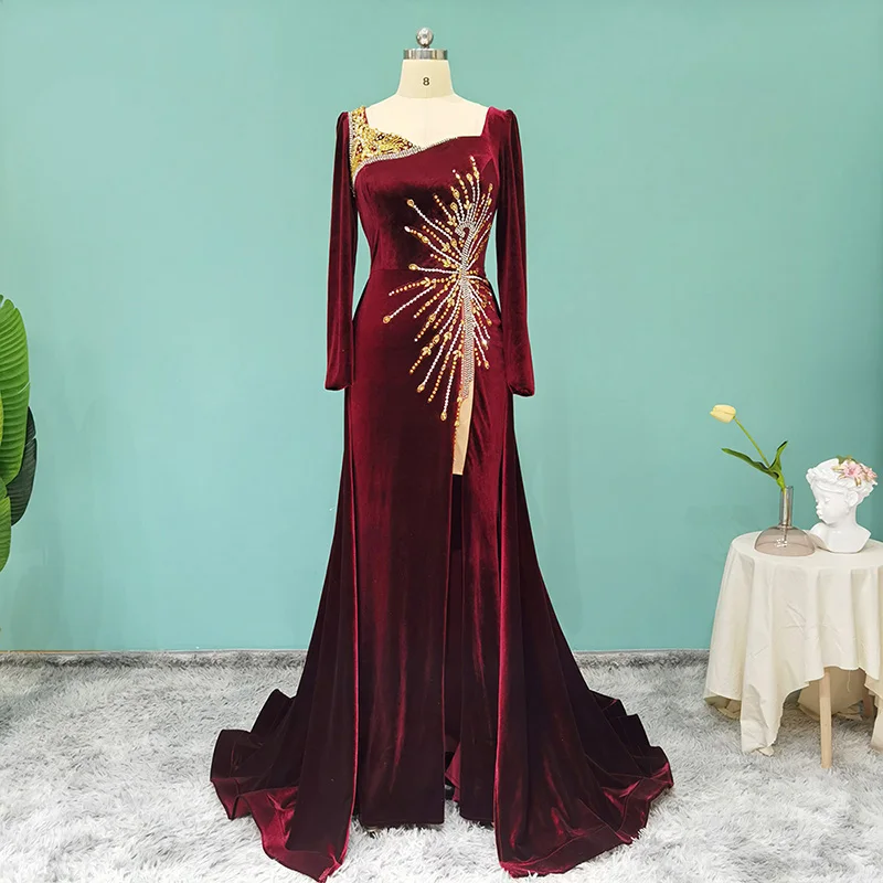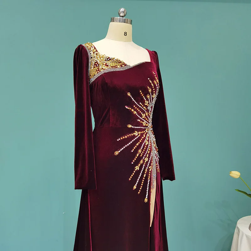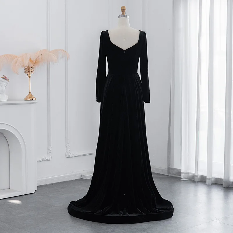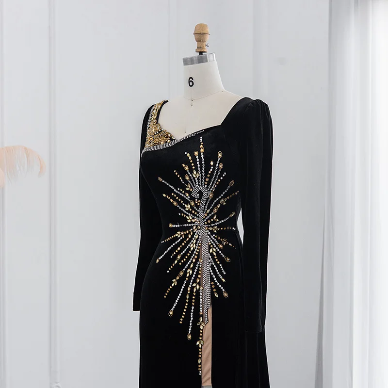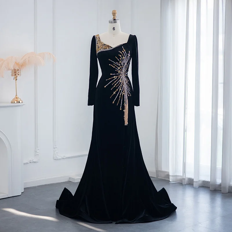 Lscz222 Luxury Crystal Black Velvet Dubai Evening Dresses With Overskirt Long Sleeve Formal Party Dress For Wedding