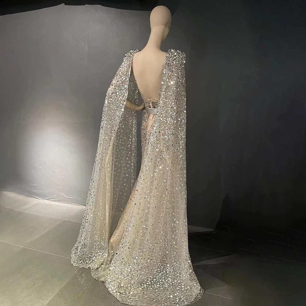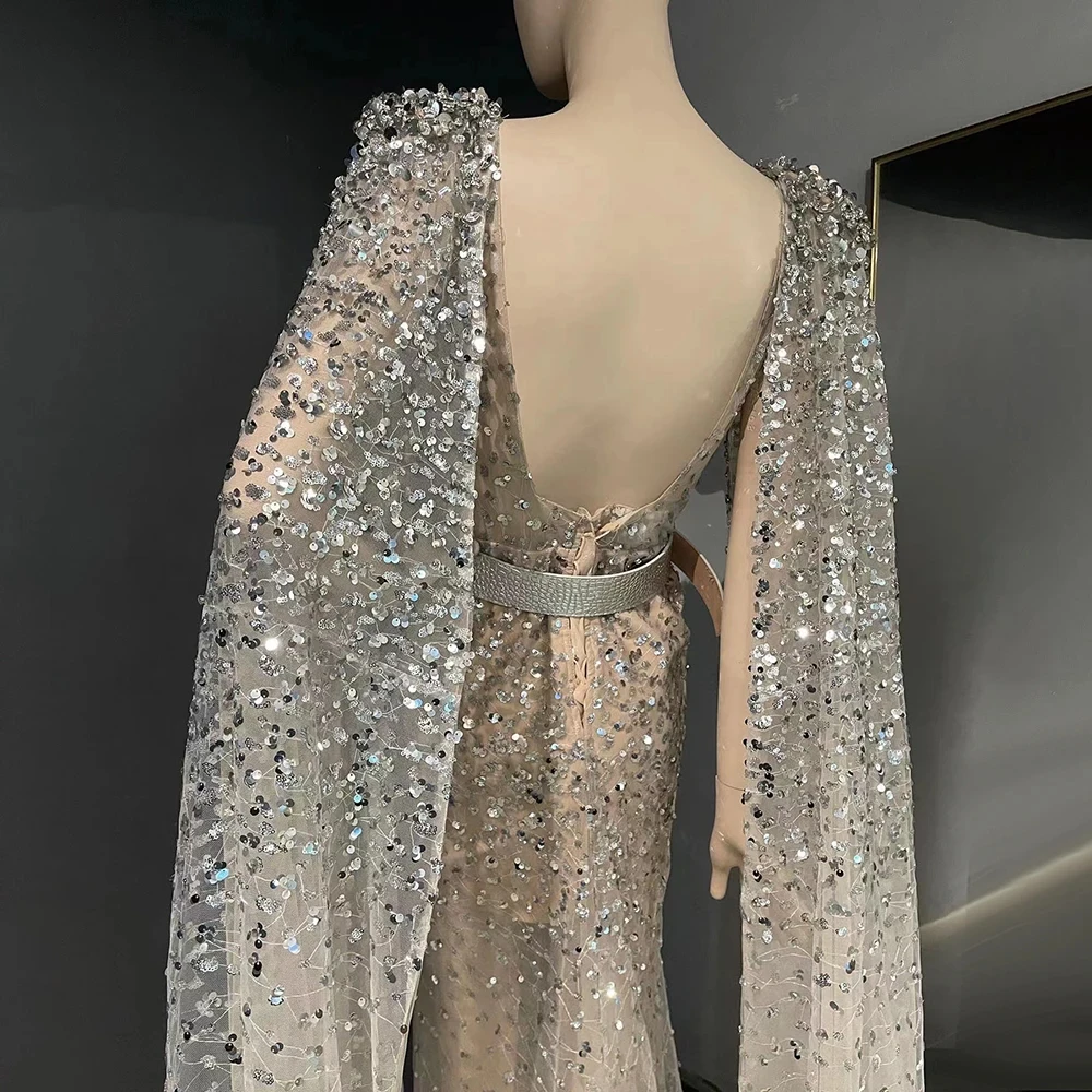Luxury Beaded Mermaid Long Evening Dresses With Cape Sleeve Elegant Dubai Women Formal Dress For Wedding Party Sz556