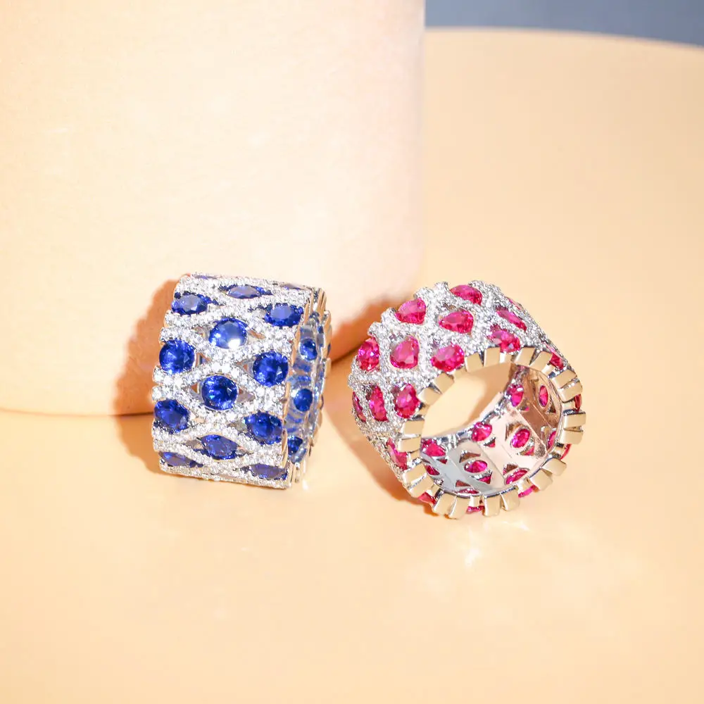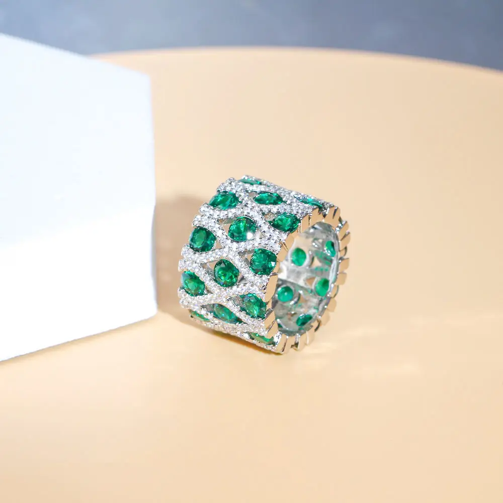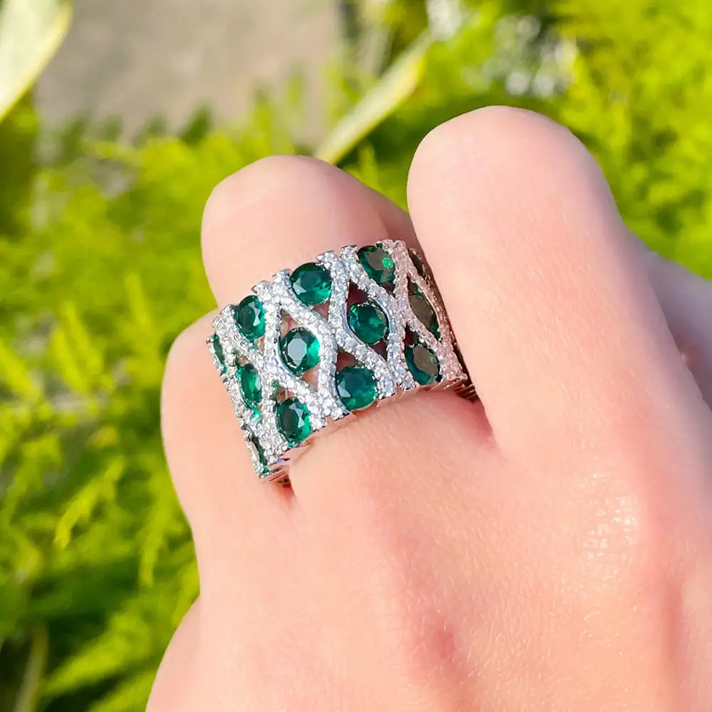 Luxury Design Jewelry Green Cubic Zircon Crystal Inlaid Silver Plated Wedding Bridal Big Wide Chunky Ring for Women Party