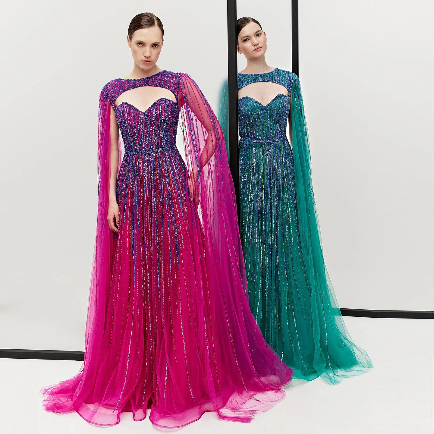 Luxury Dubai Fuchsia Evening Dress With Cape Sleeves 2024 Emerald Green Arabic Women Wedding Party Dresses Sz386
