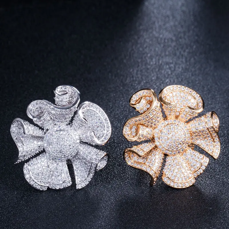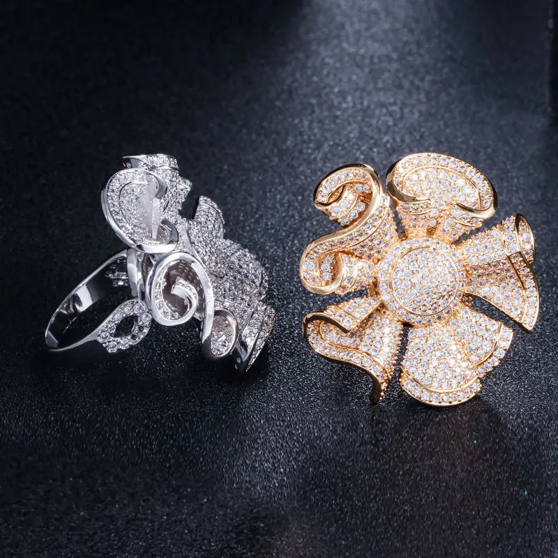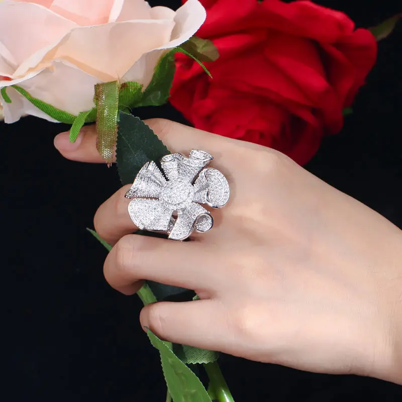 Luxury Engagement Prom Cubic Zirconia Fine Jewelry Nigerian Dubai Gold Plated Statement Extra Large Flower Finger Ring For Women