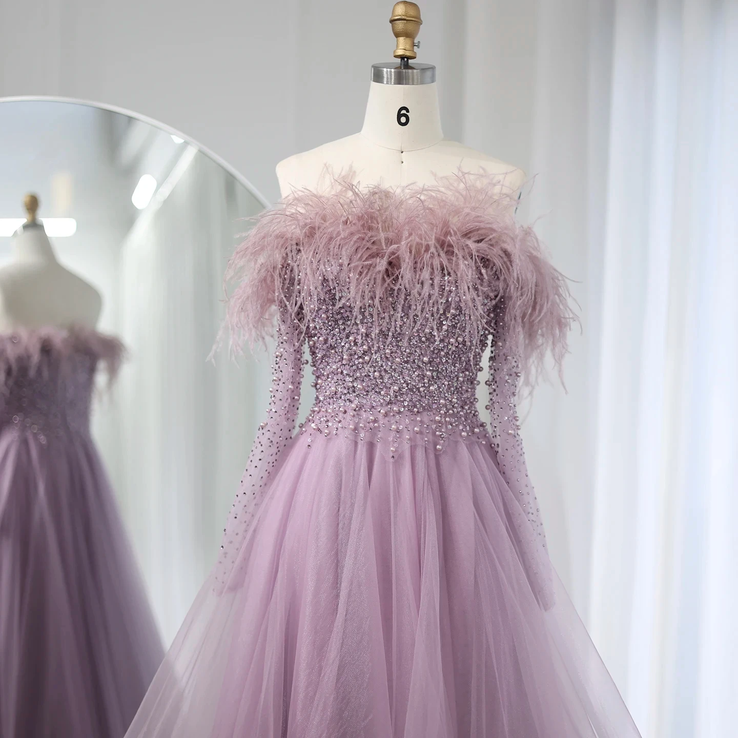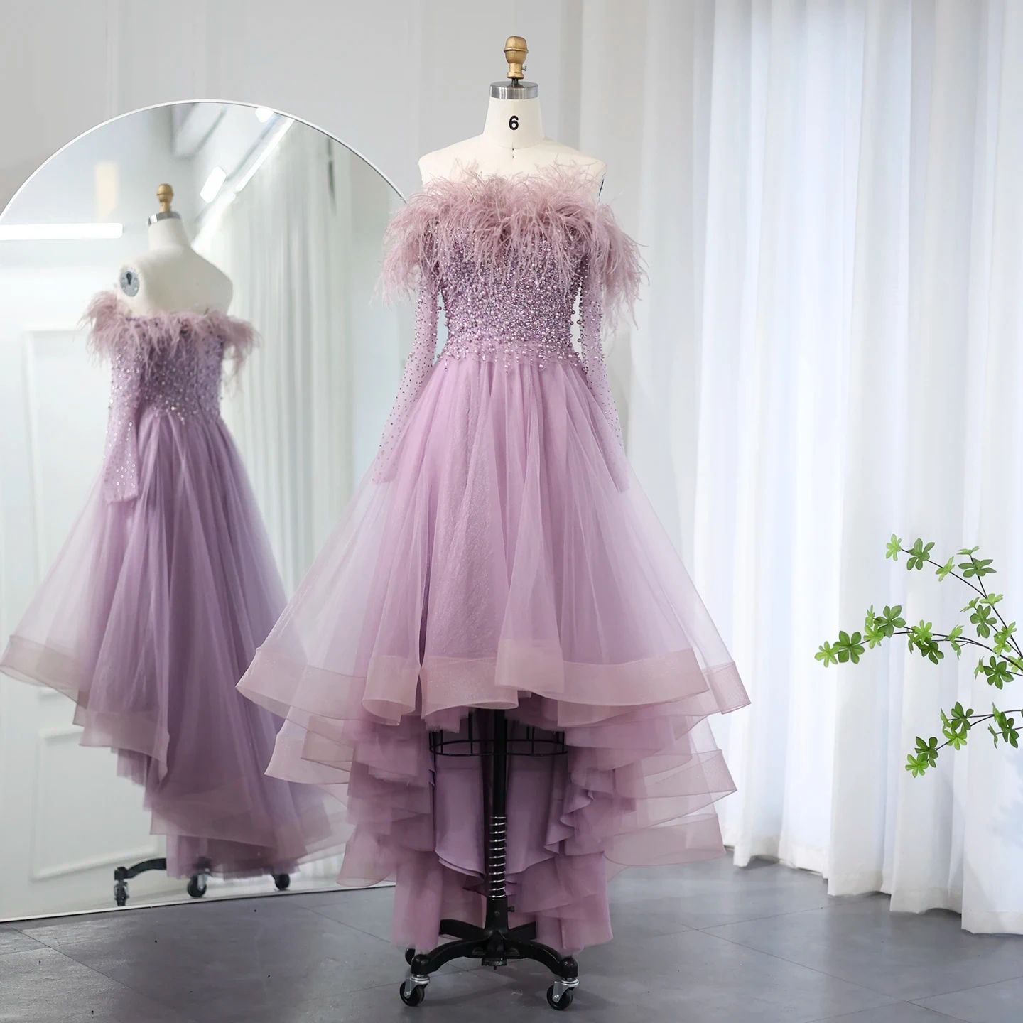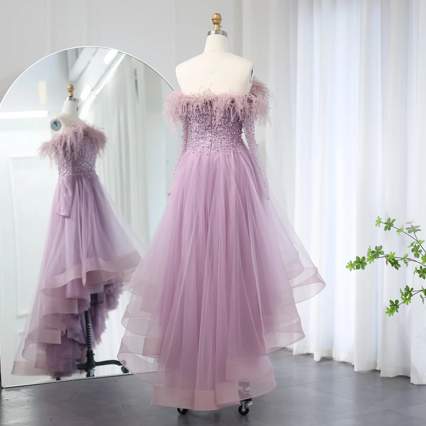 Luxury Feathers Dubai Purple High Low Evening Dresses Elegant Off Shoulder Arab Women Wedding Party Prom Dress Sz465