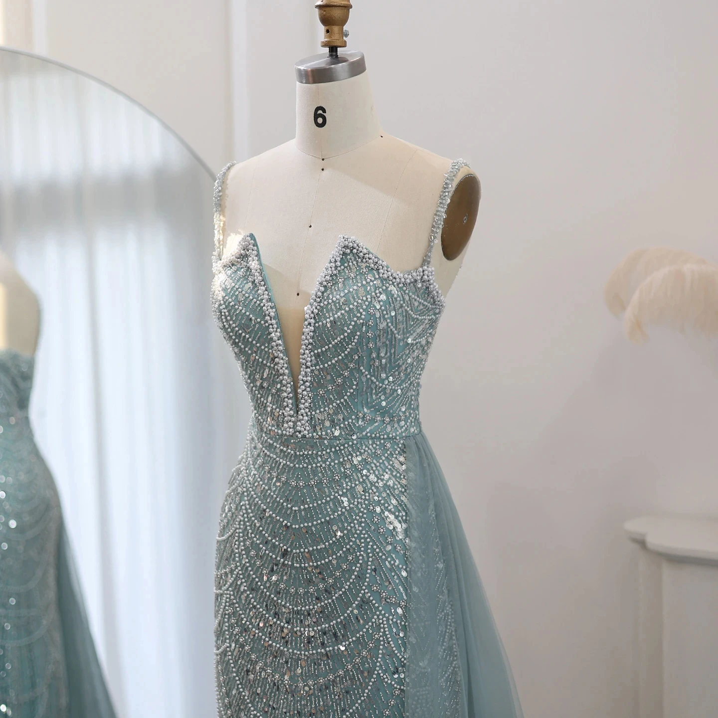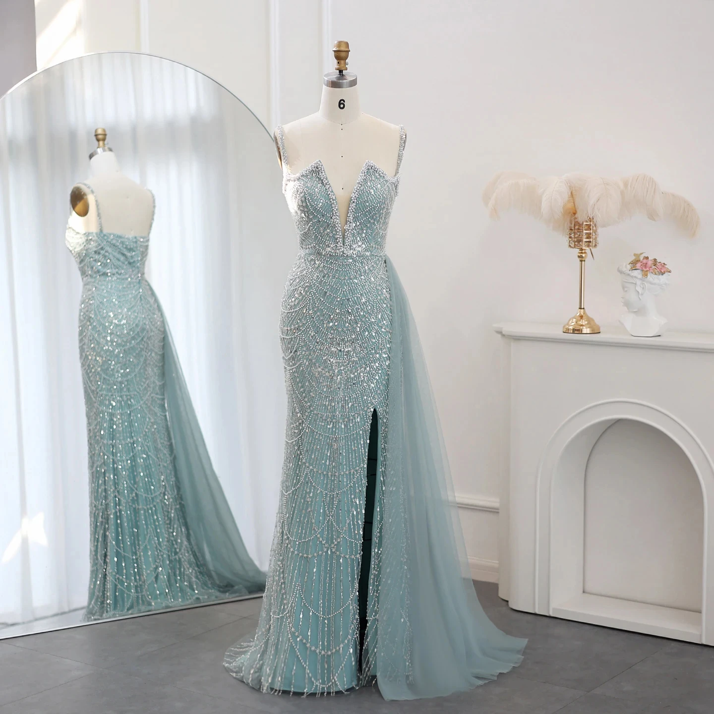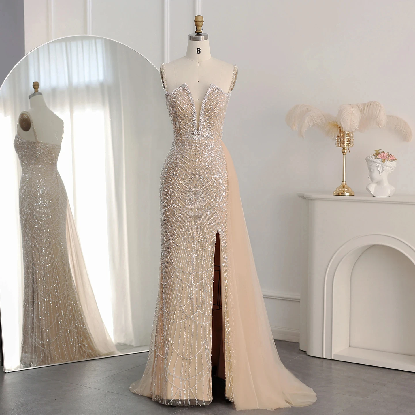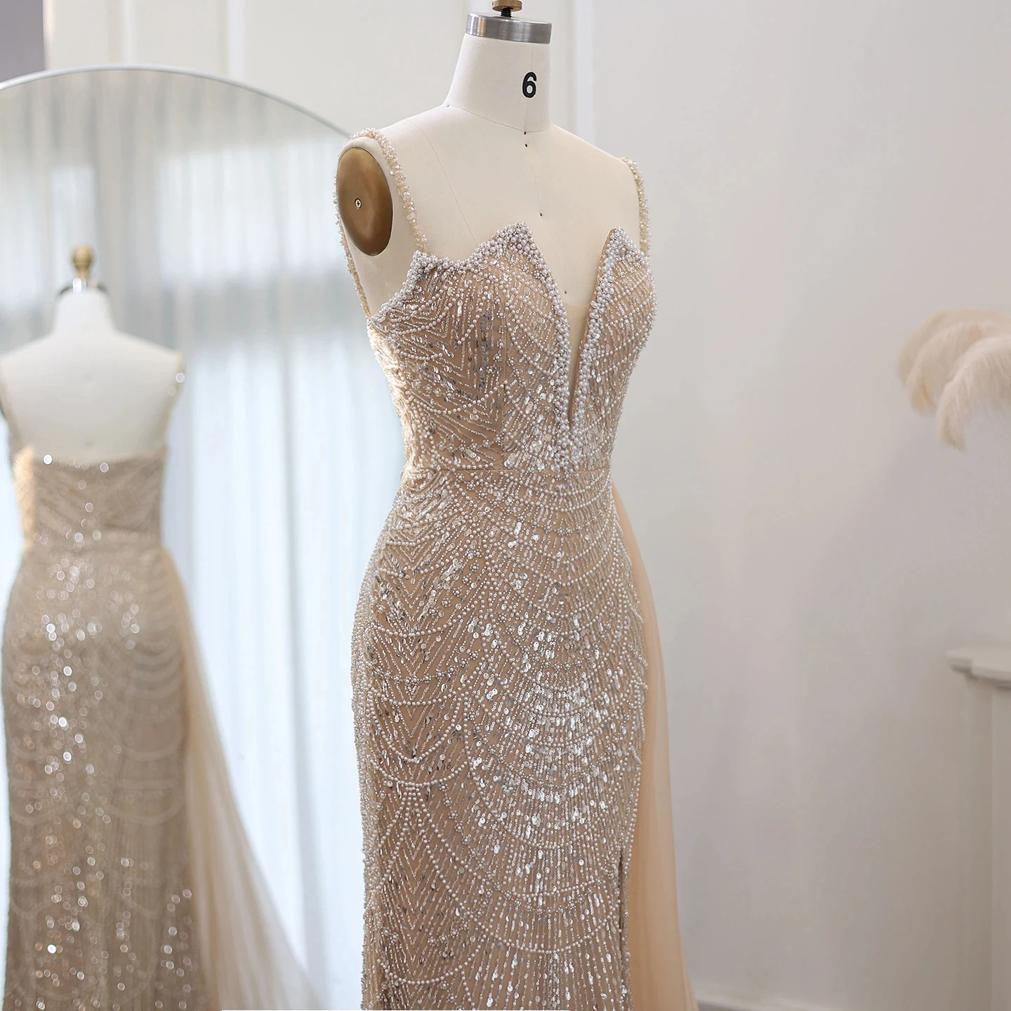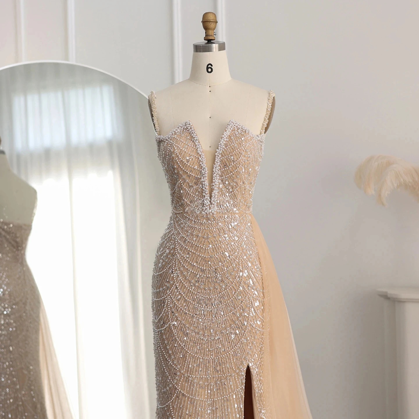 Luxury Nude Spaghetti Straps Mermaid Arabic Long Evening Dress with High Slit Overskirt for Wedding Party Gown SZ311