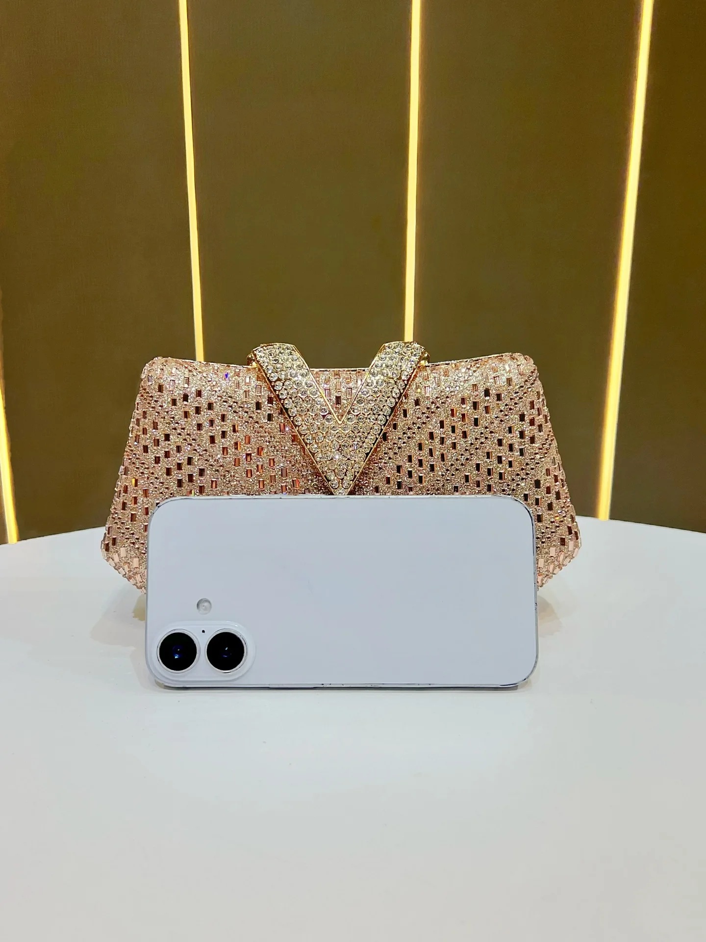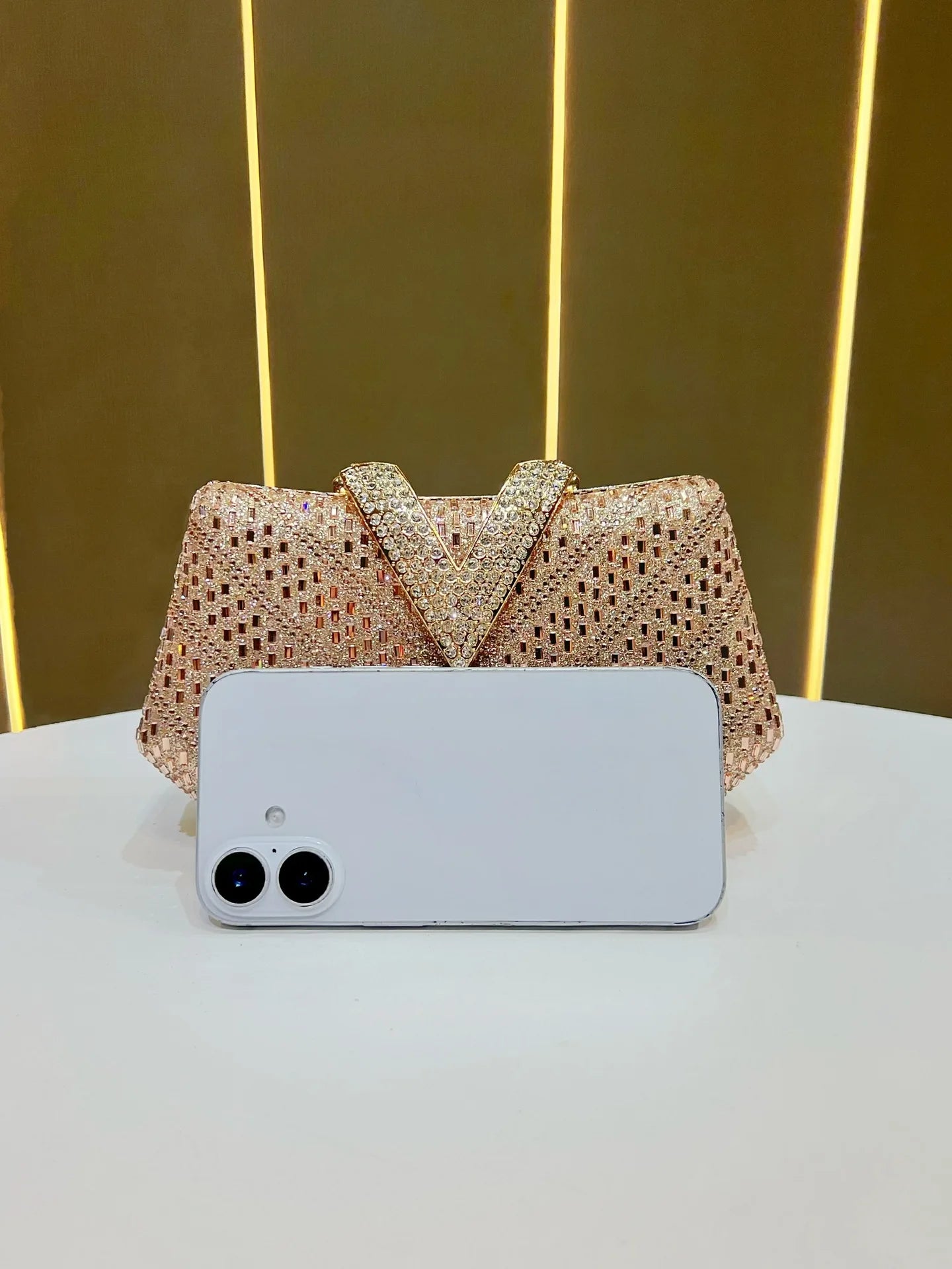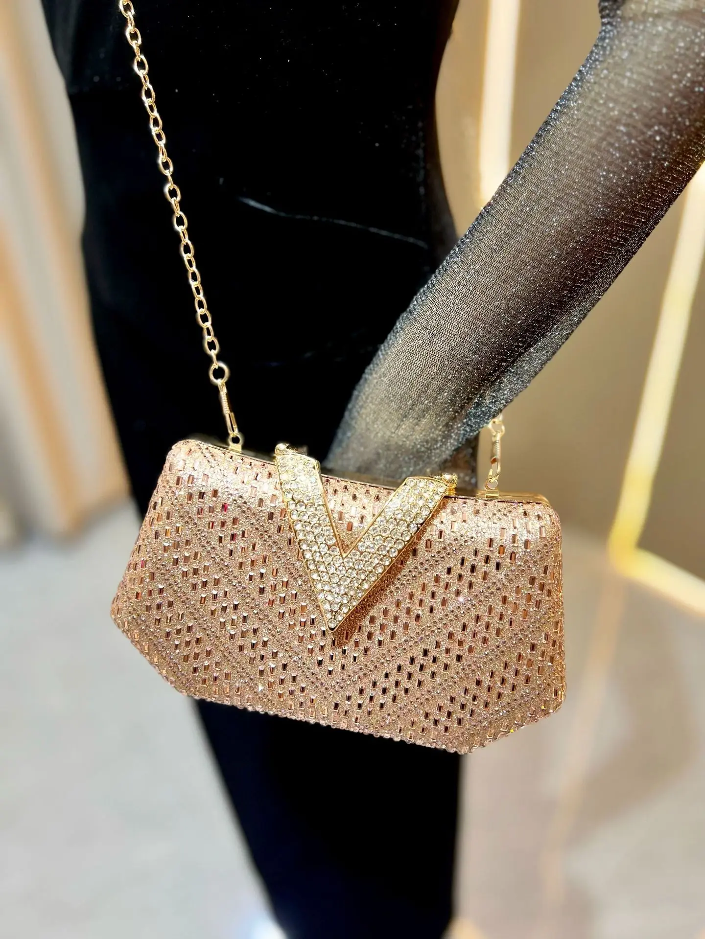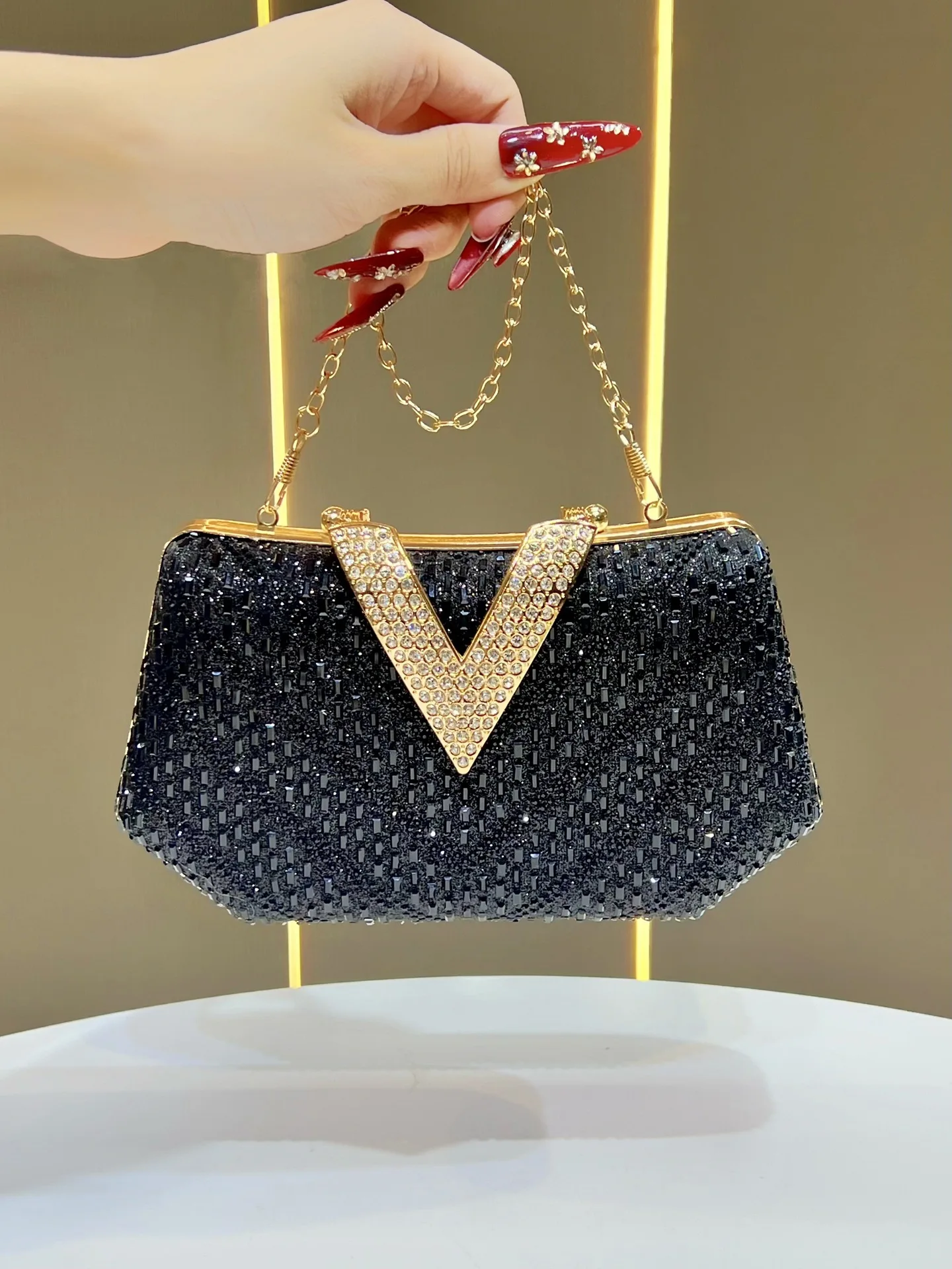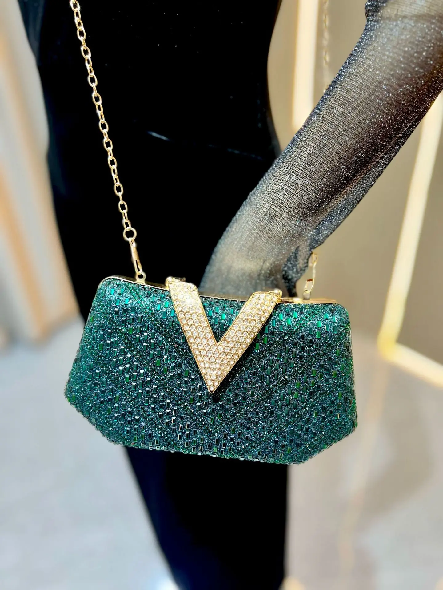 Luxury Shiny Diamond Studded V Letter Evening Dress Bag for Women Brand Rhinestone Handbag Lady Elegant Cheongsam Bag Wedding Purse