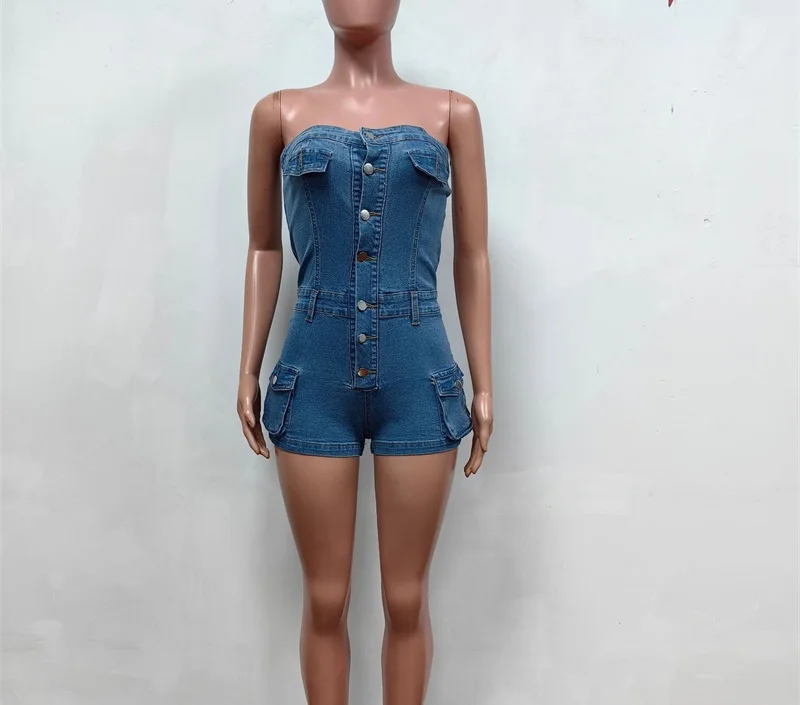 luxury women ladies hot sexy skinny girls tight solid blue strapless denim jean shorts overall romper jumpsuit outfit for women