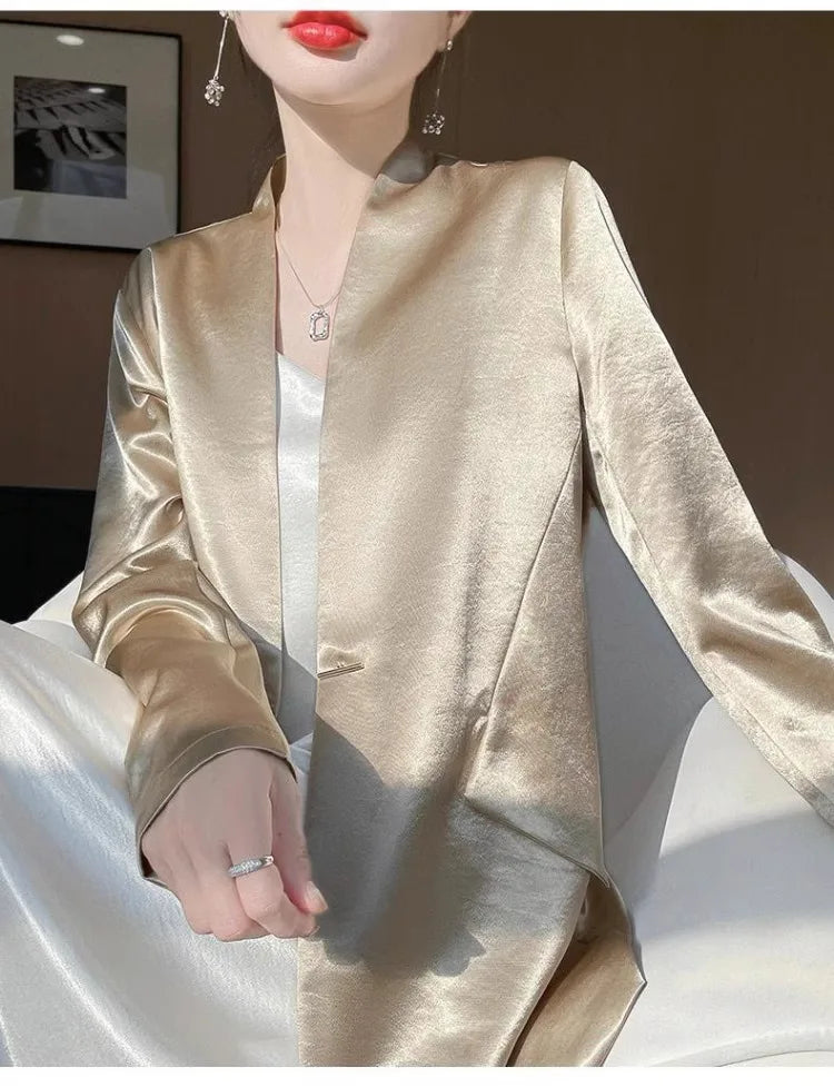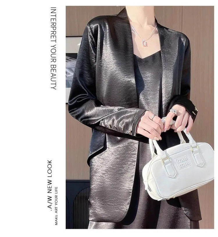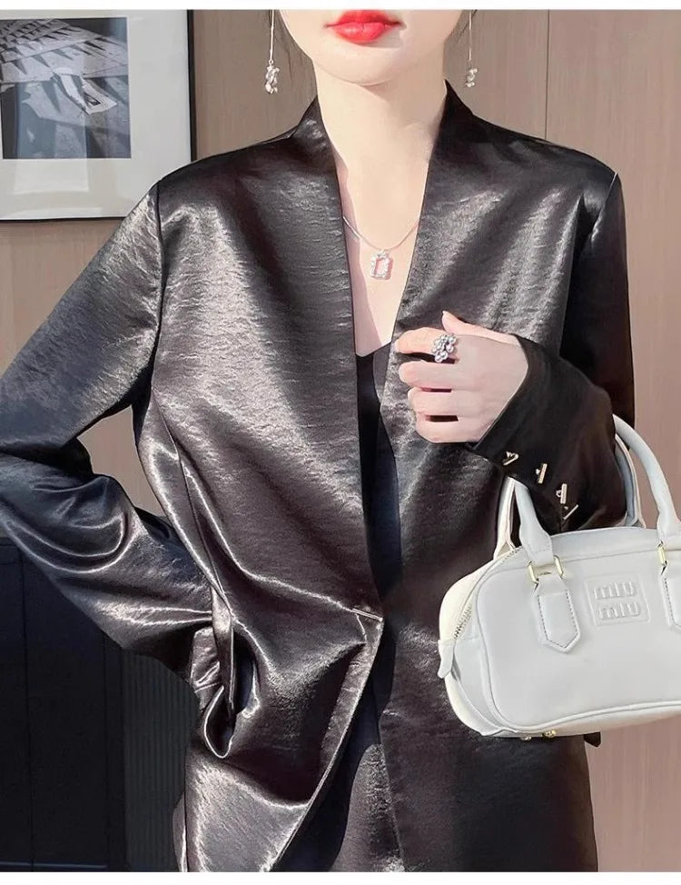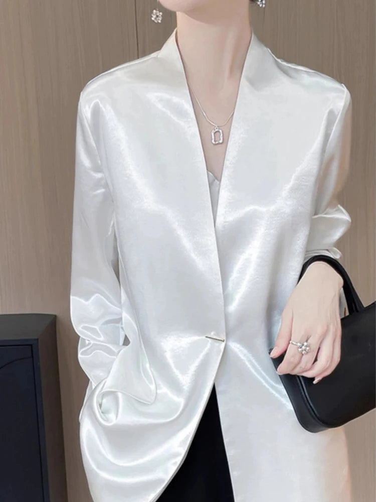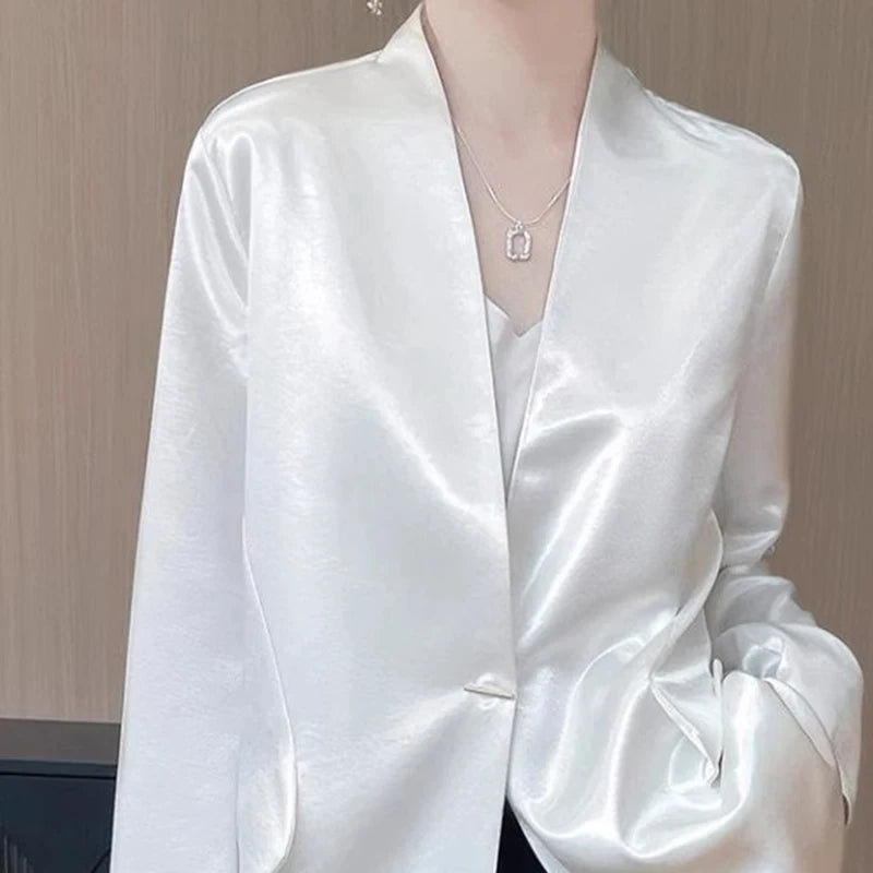 Luxury Women's 2025 Spring One-Button Satin Blazer White Office Tailored Shoulder Slim Suit Jacket Silky Smooth Formal Workwear