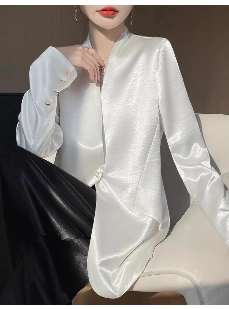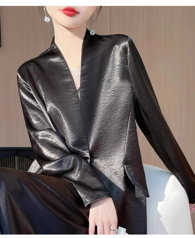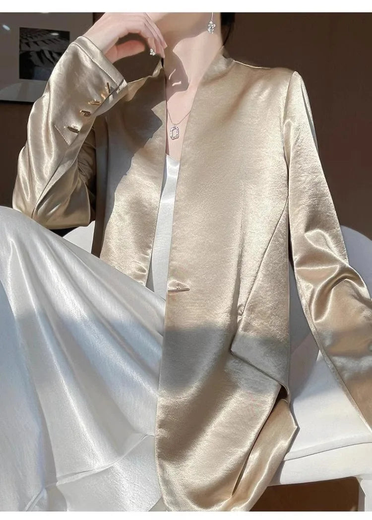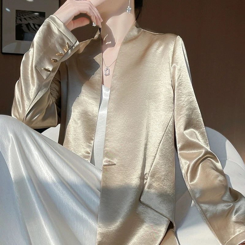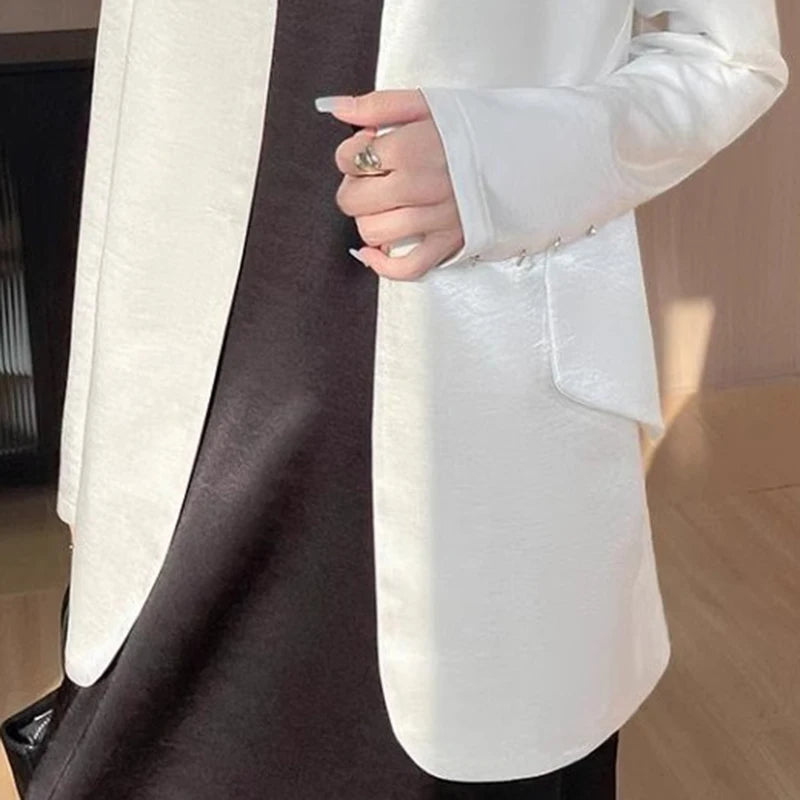 Luxury Women's 2025 Spring One-Button Satin Blazer White Office Tailored Shoulder Slim Suit Jacket Silky Smooth Formal Workwear