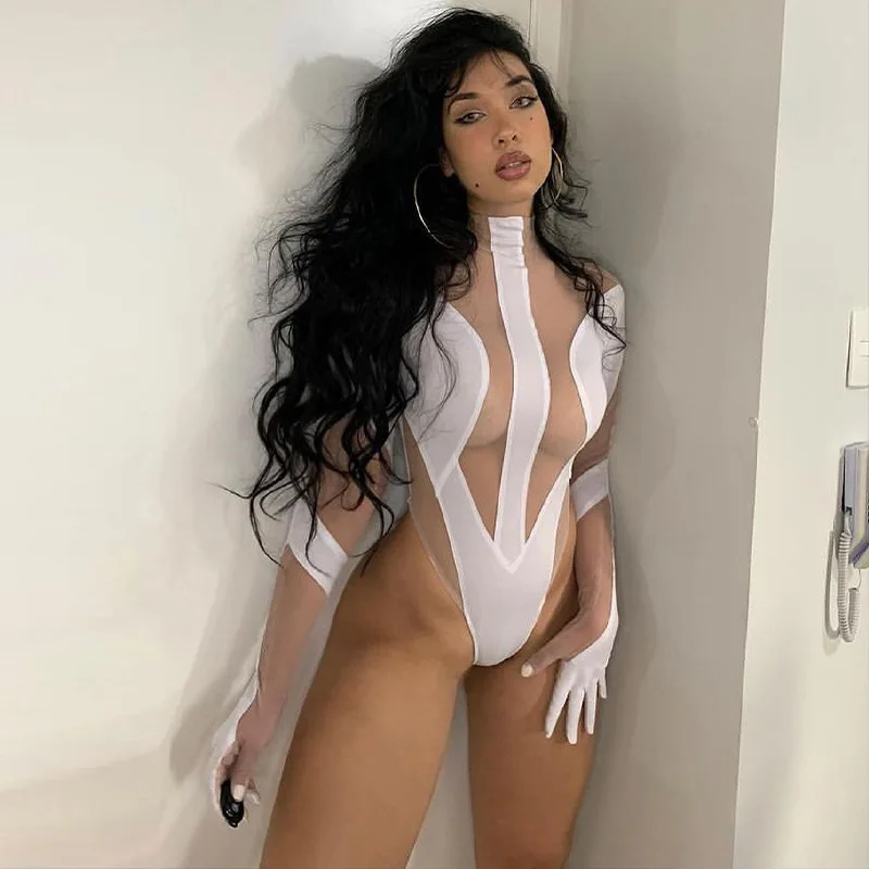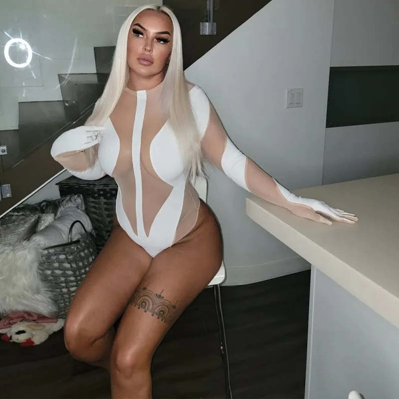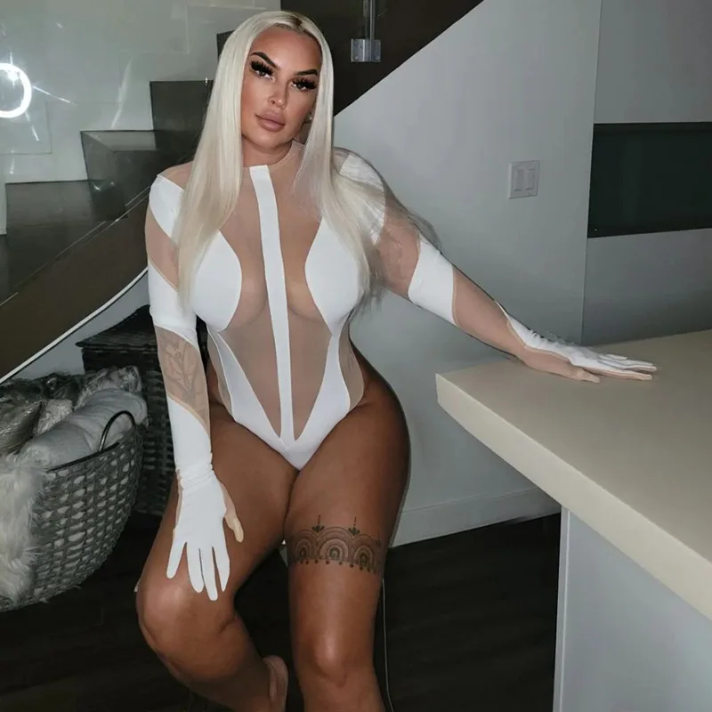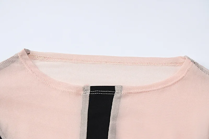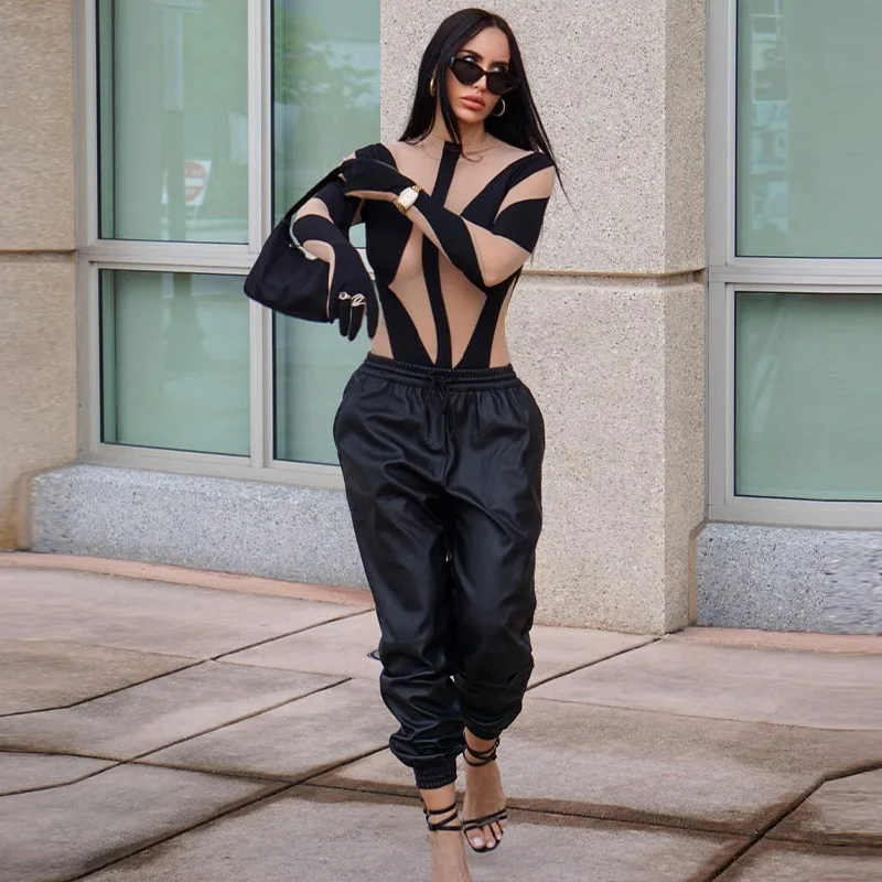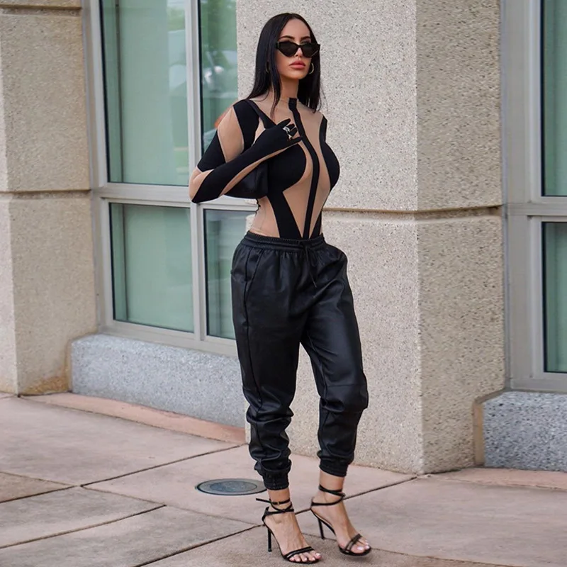 Lygens 10446 Mesh Spliced See Through Long Sleeve O Neck Stretchy Bodysuit 2022 New Sexy Wholesale Clothes