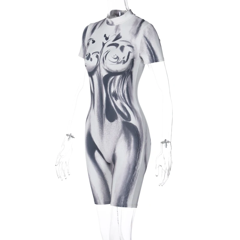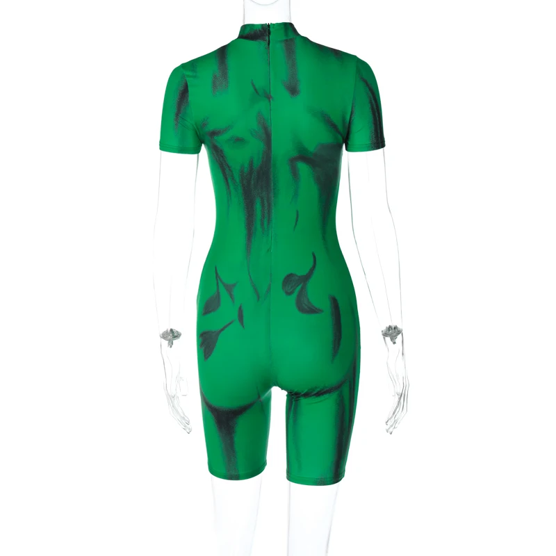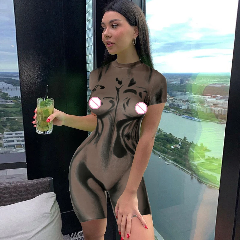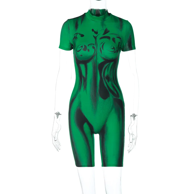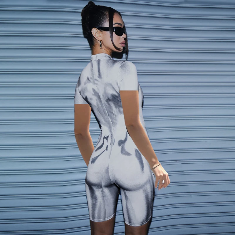 Lygens 2175 Tie Dye Print Stretchy Short Sleeve One Piece Rompers 2023 Summer Casual Streetwear Club Jumpsuits Women Clothes