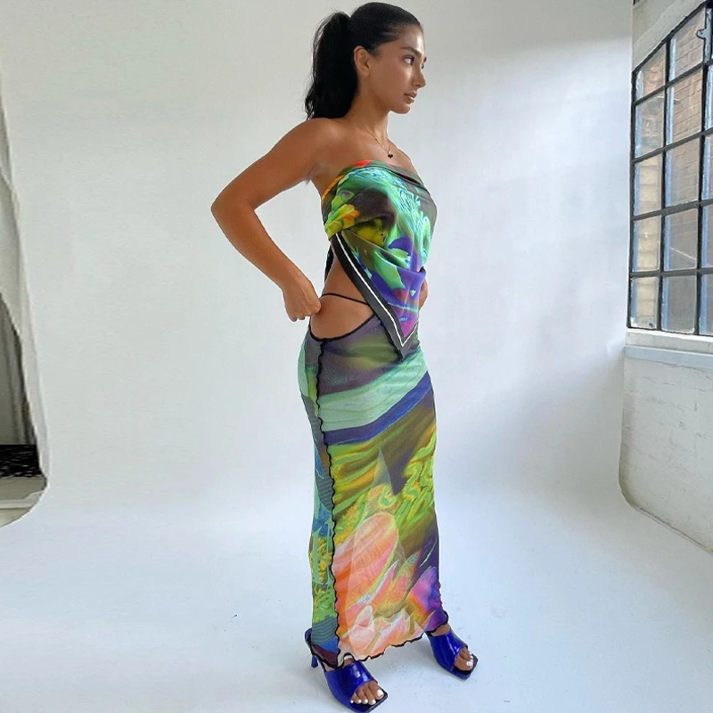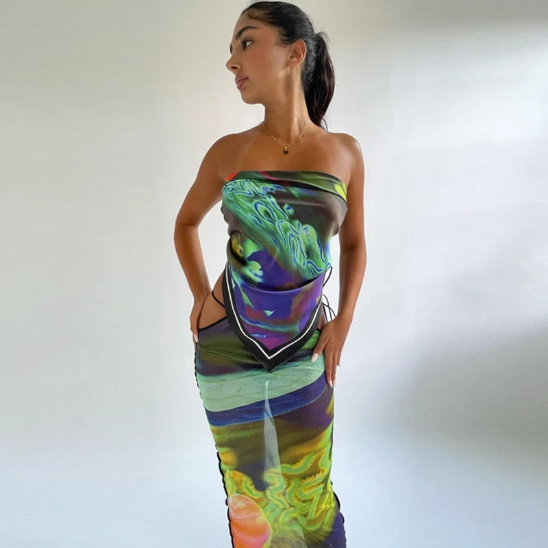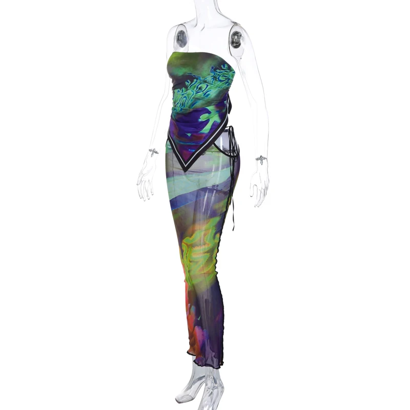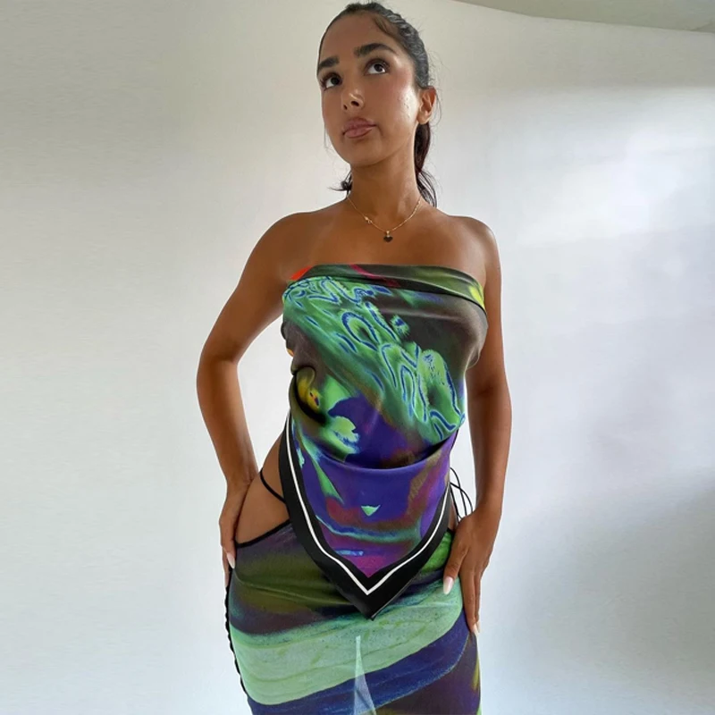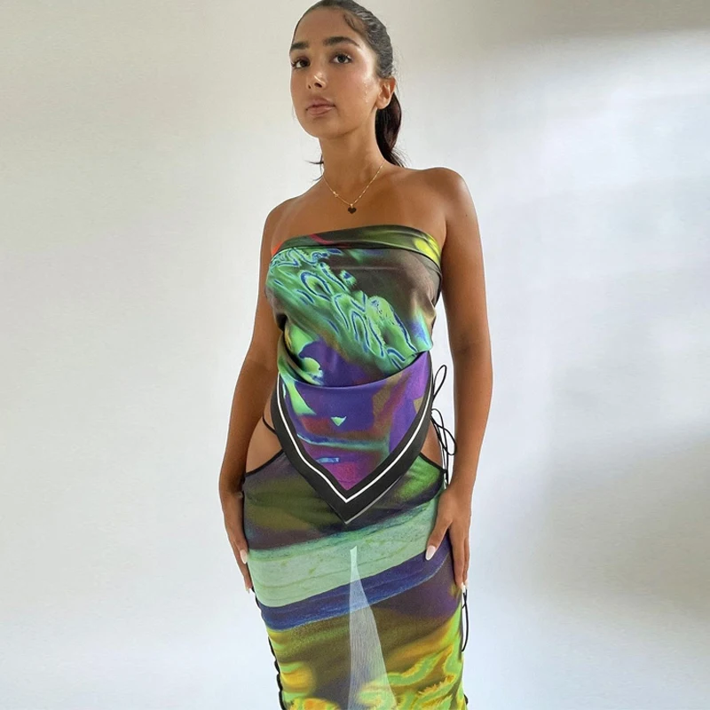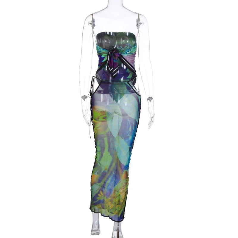Lygens 2186 Tie Dye Print Backless Camis Crop Top Hollow Out Skirt Women'S Sets 2023 New Summer Casual Beach Vacation Clothes