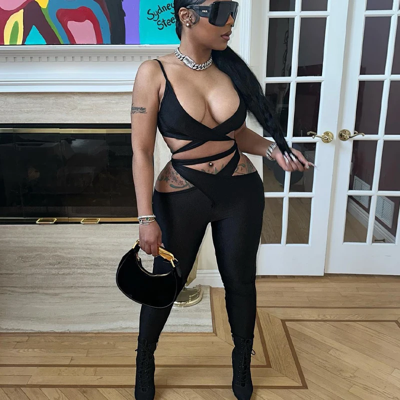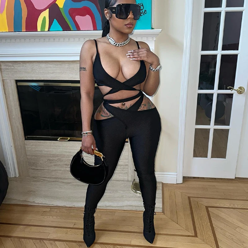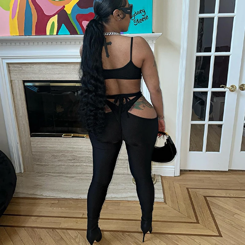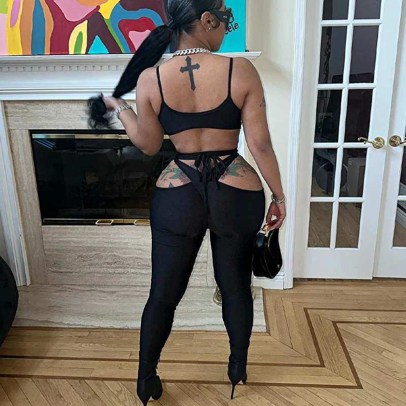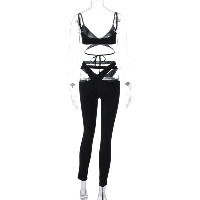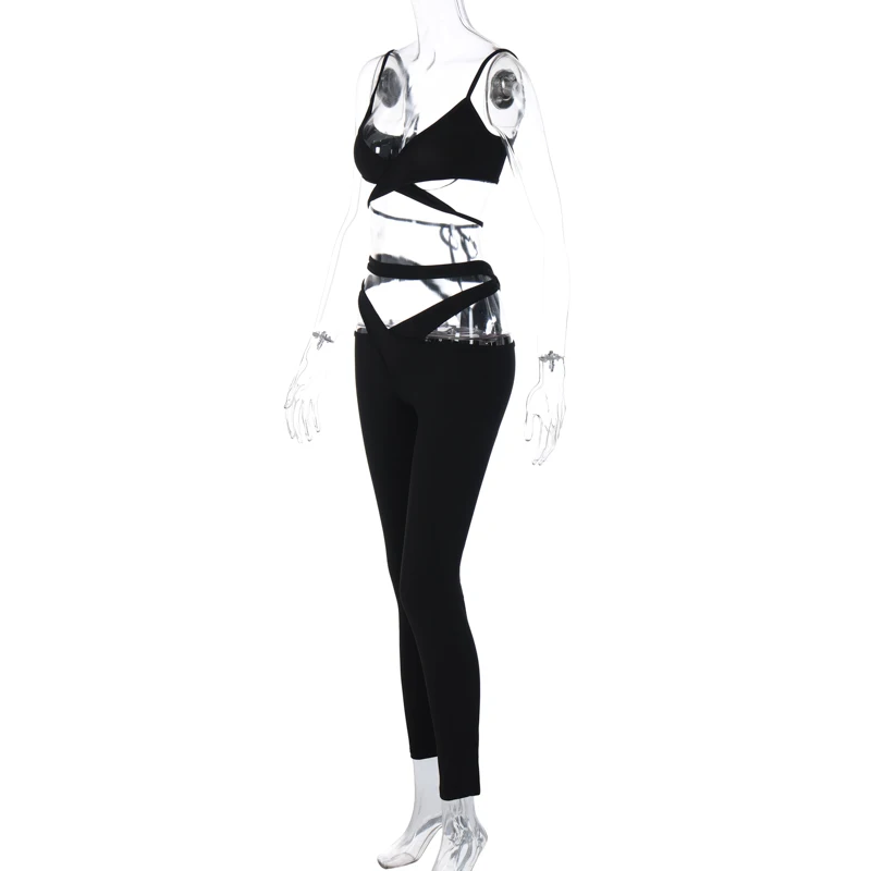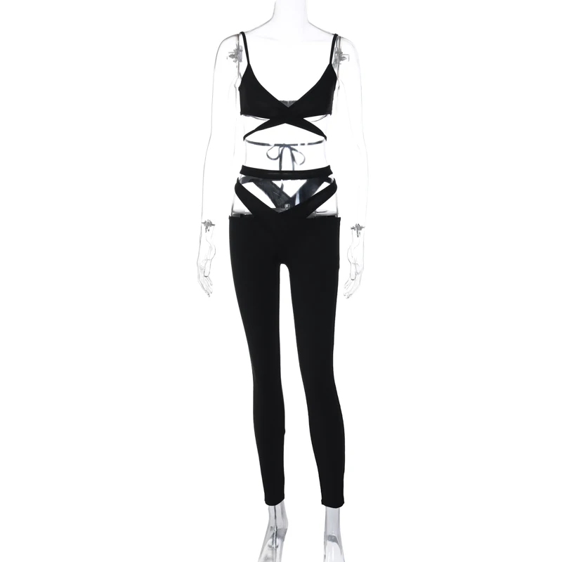 Lygens 2647 Y2K Lace Up Hollow Out High Waist Tank Crop Top Long Pants Women'S Sets Summer Casual Evening Club Women'S Clothes