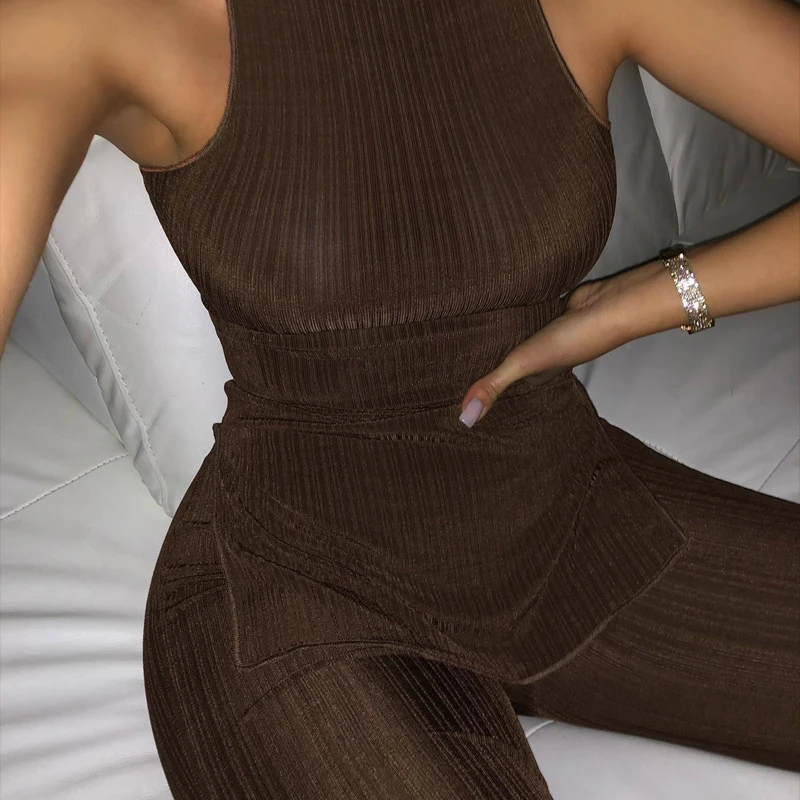 Lygens 8064 Ribbed Knit Summer See Through 2 Two Piece Set Sleeveless Long Top Pants Women 2022 Clothing New Arrival Elegant