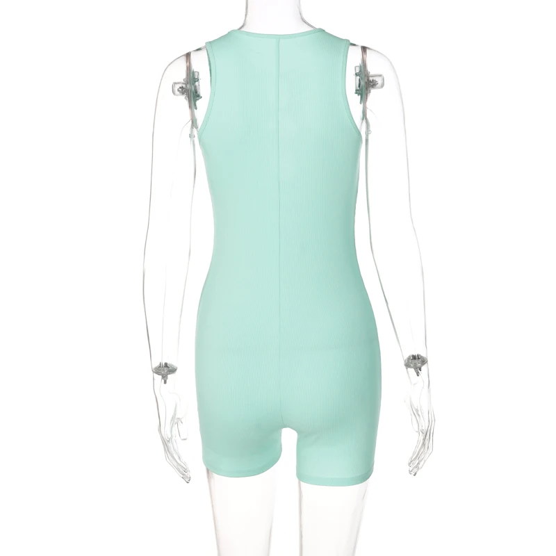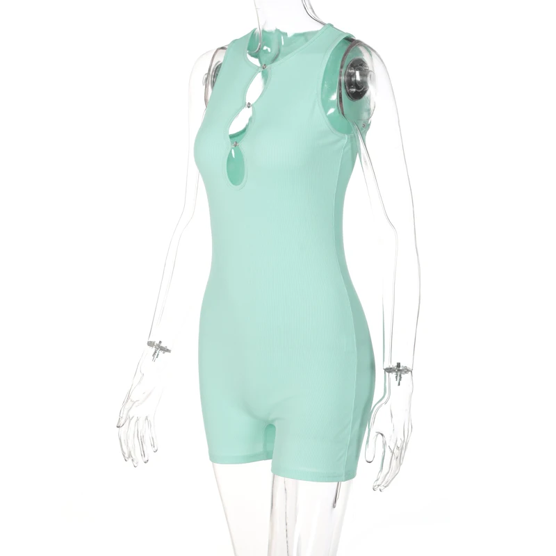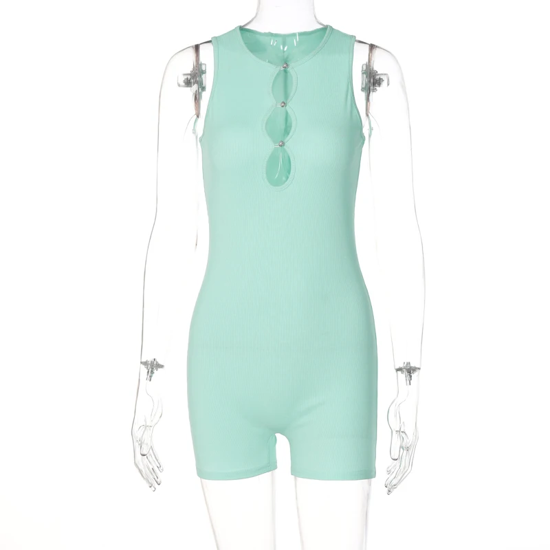 Lygens 8644 Hollow Out Sleeveless Button Short Sportswear Women Bodycon Jumpsuit Casual 2022 New Solid Fashionable Romopers