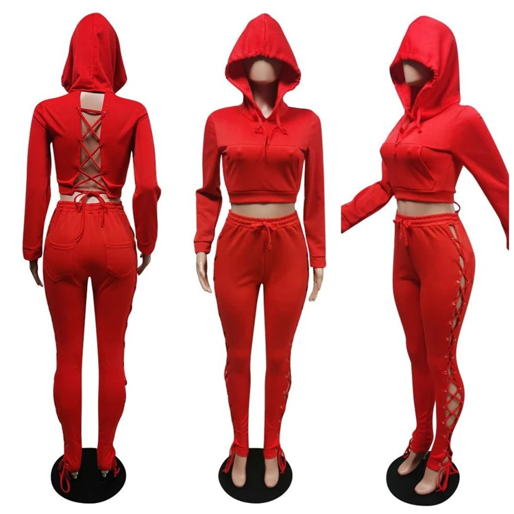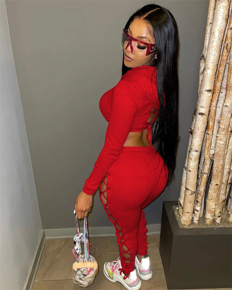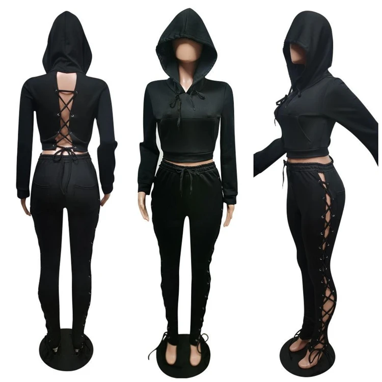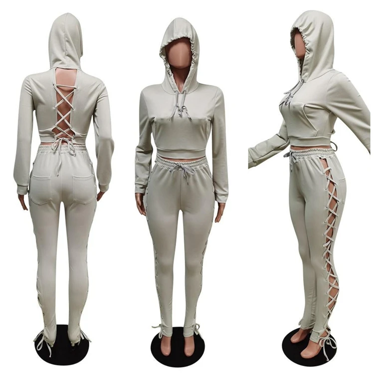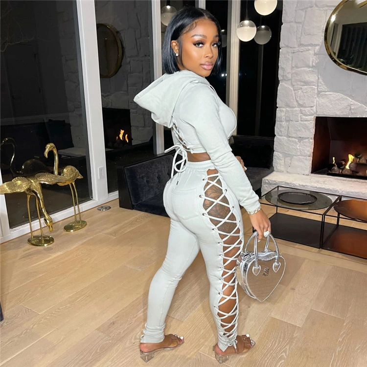 MD-2023 new090605 Trendy Ladies 2 PCS Outfits Eyelet Bandage Hoodies Autumn Women Clothes Two Piece Pants Set
