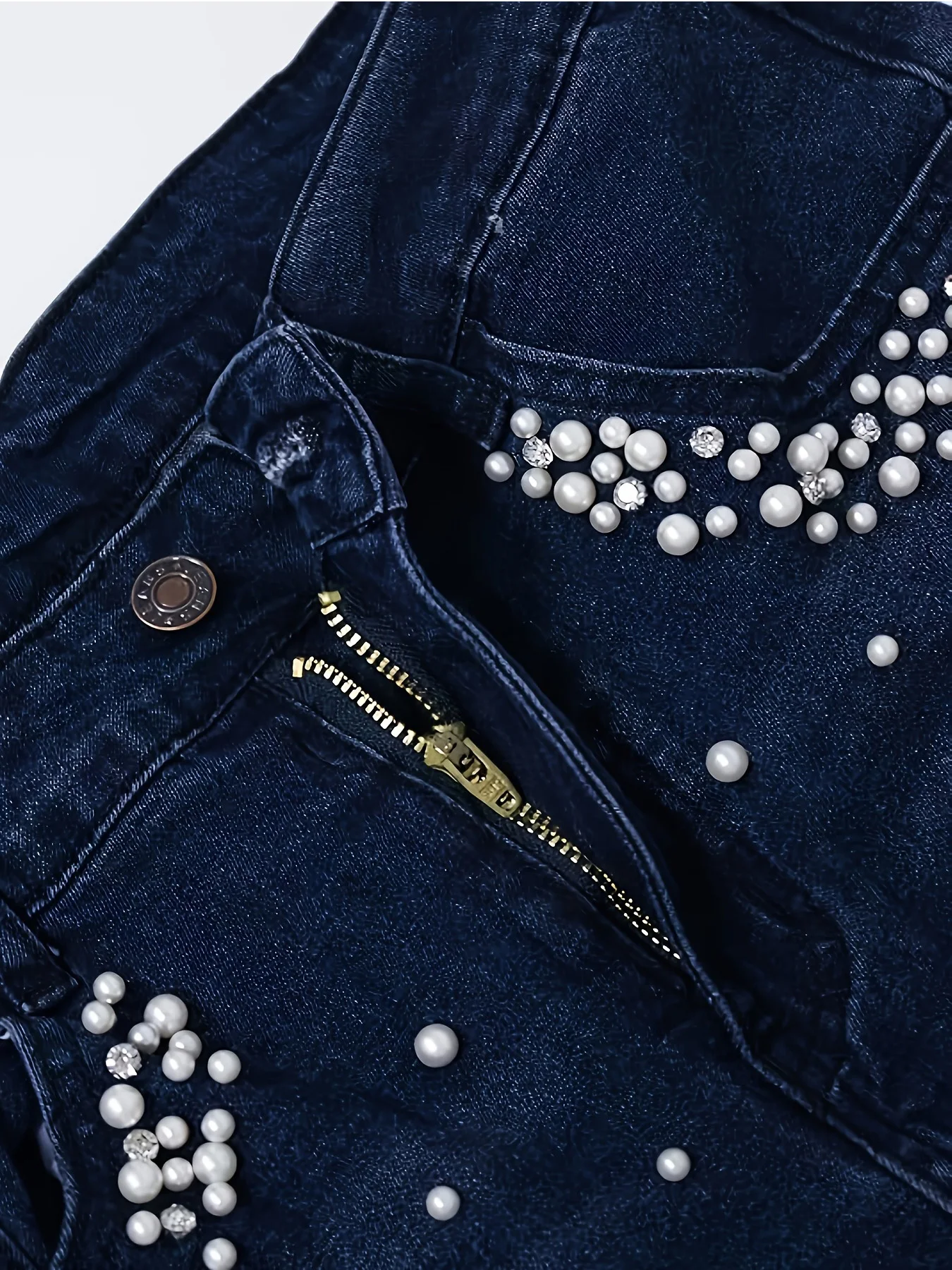 Mid-waist fashionable sequin and diamond embroidered with deep blue denim pencil pants, ladies' skinny jeans, suitable for all s