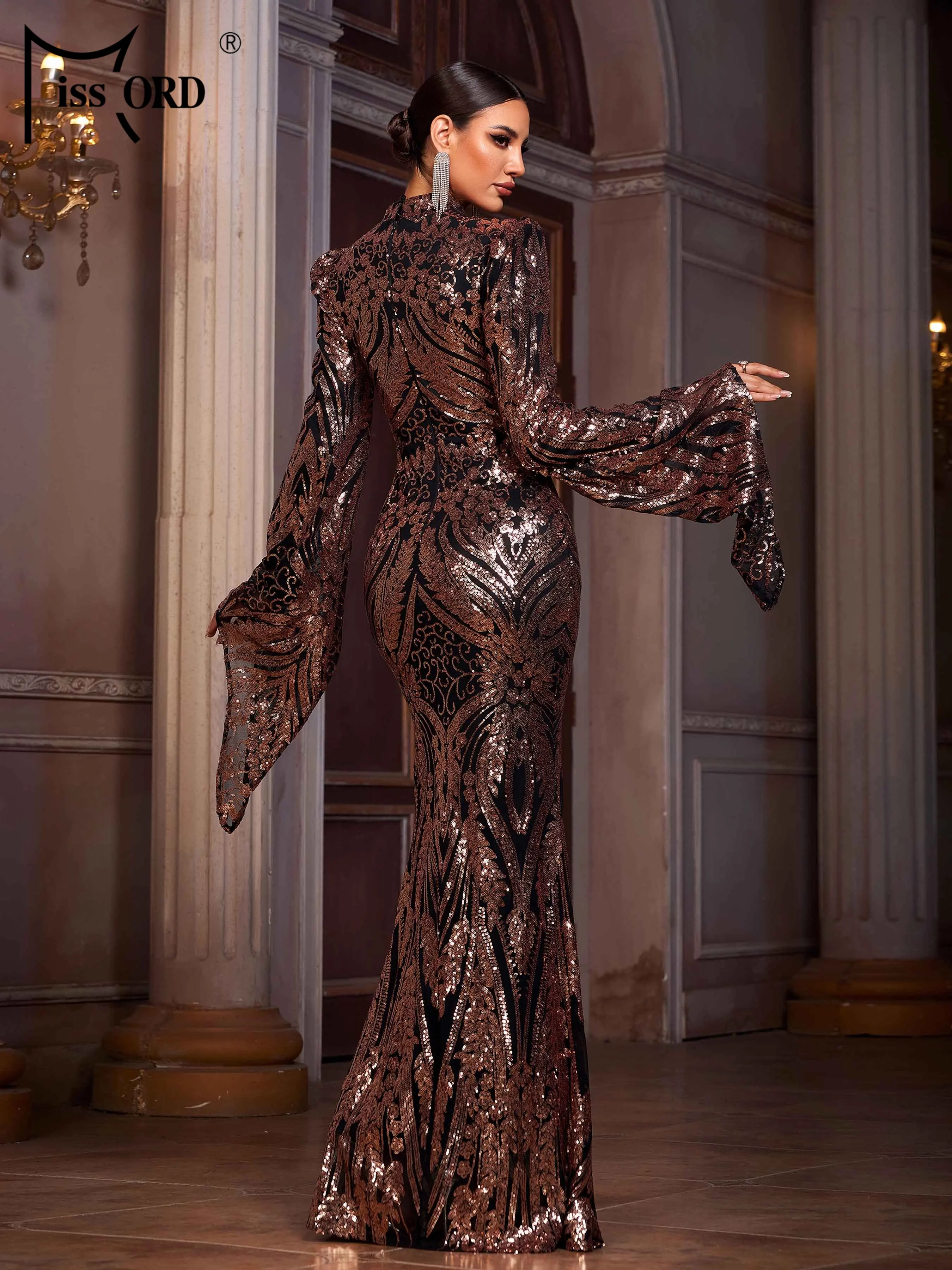 Missord New Round Neck Flare Sleeve Sequin Mermaid Evening Gown Geometry Wedding Birthday Party Formal Occasion Maxi Dresses