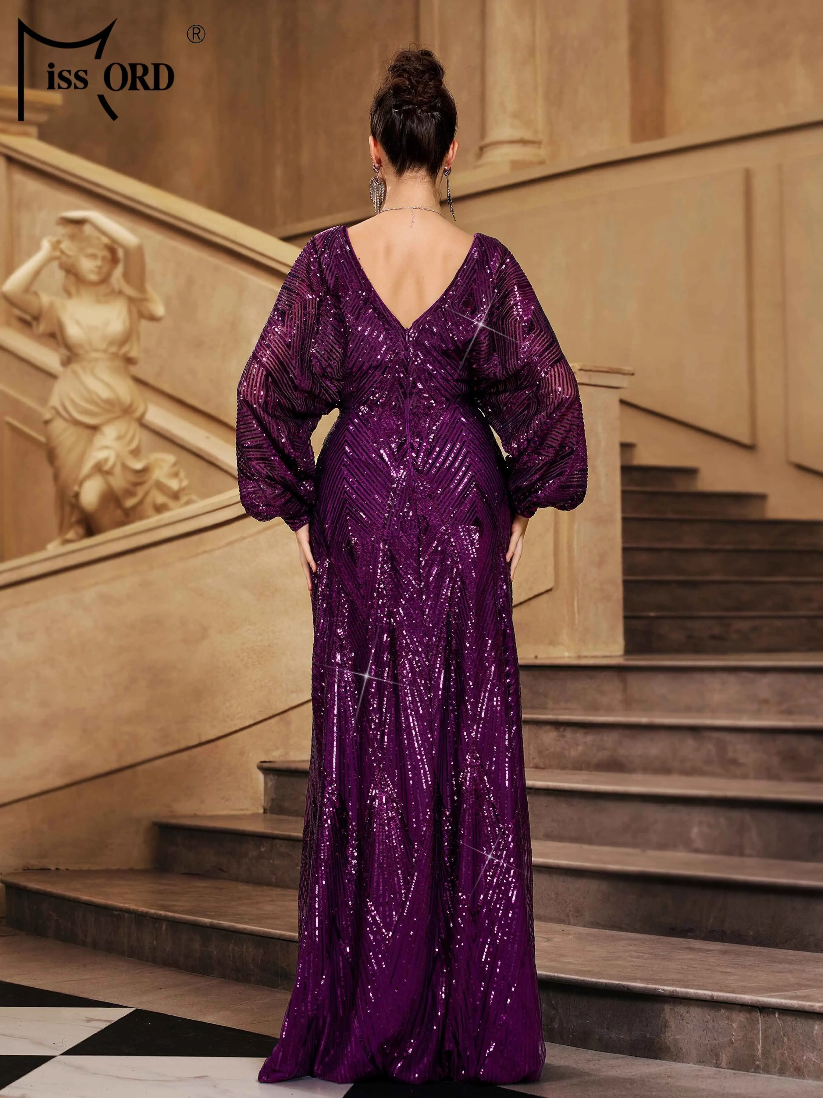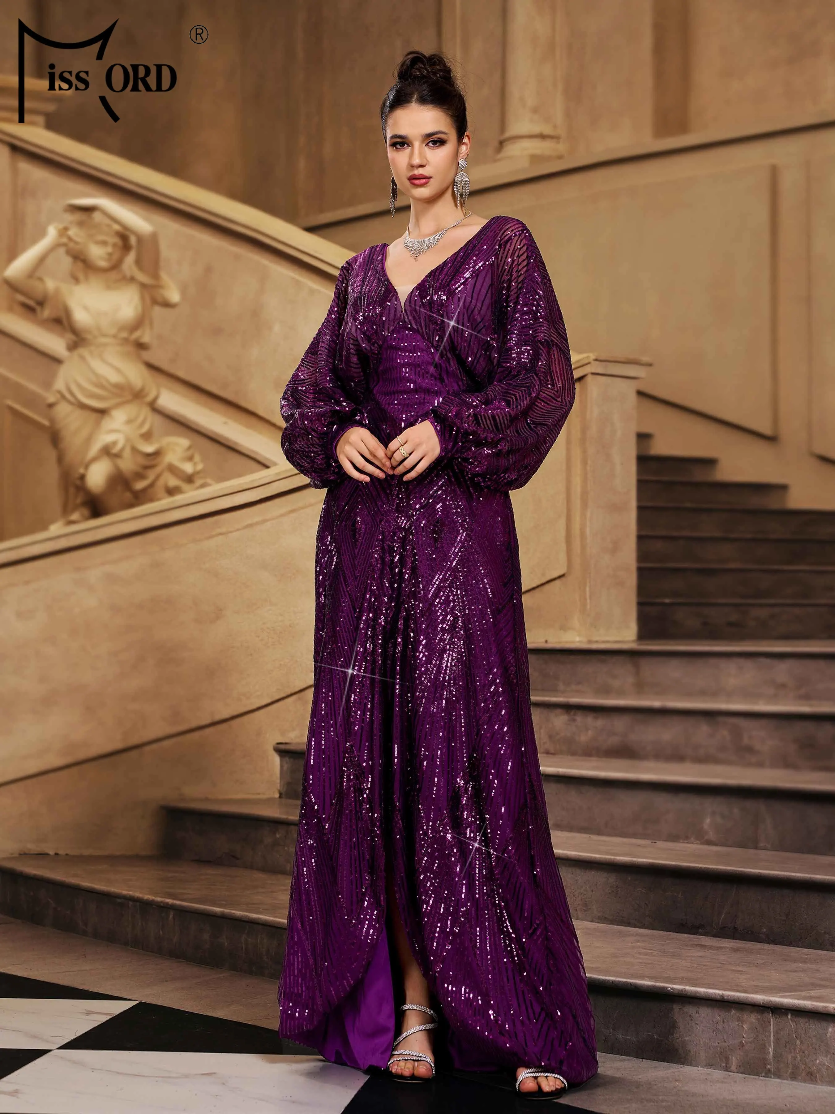 Missord Purple V Neck Lantern Sleeve Split Evening Gown Wedding Birthday Party Formal Occasion High Quality Luxury Maxi Dress