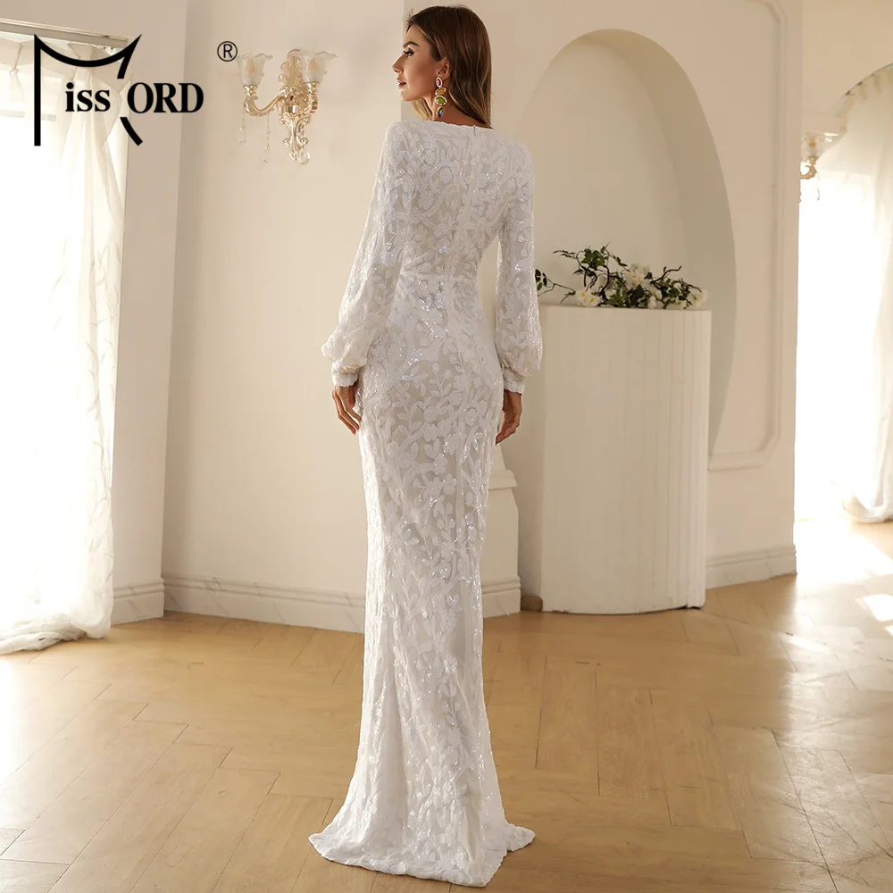 Missord White Long Evening Dresses Women Sexy Deep V Neck Lantern Sleeve Thigh Split Maxi Party Prom Dress Elegant Bodycon Gown