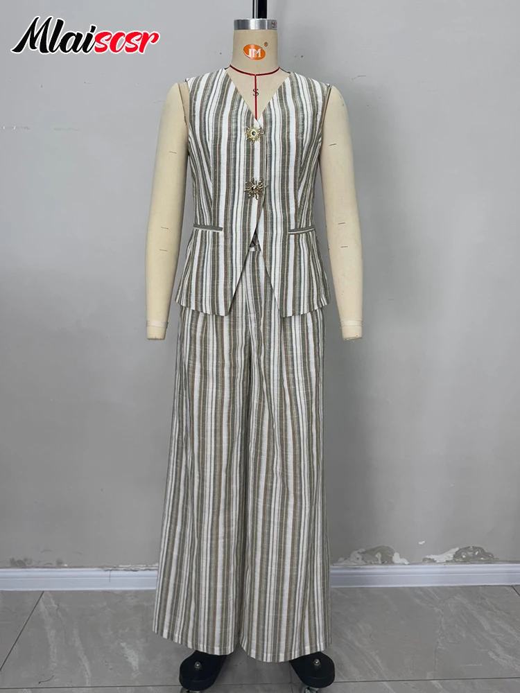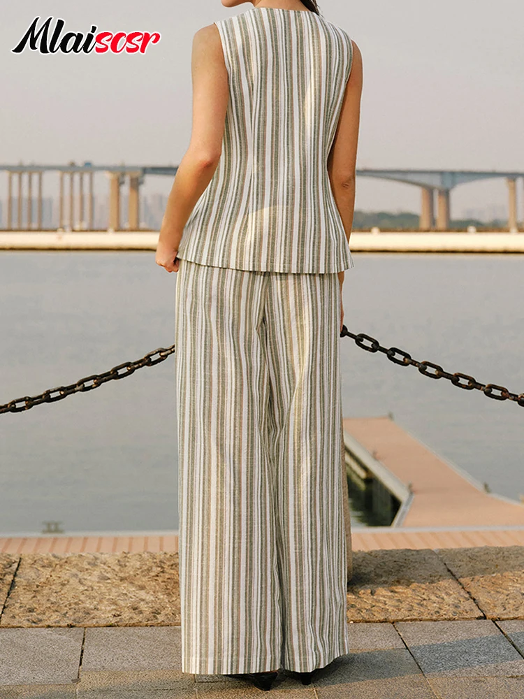 Mlaiscsr Women's Stripe Sleeveless V Neck Top and High Waist Wide Leg Pants 2 Piece Set Summer Office New Europe America Outfits