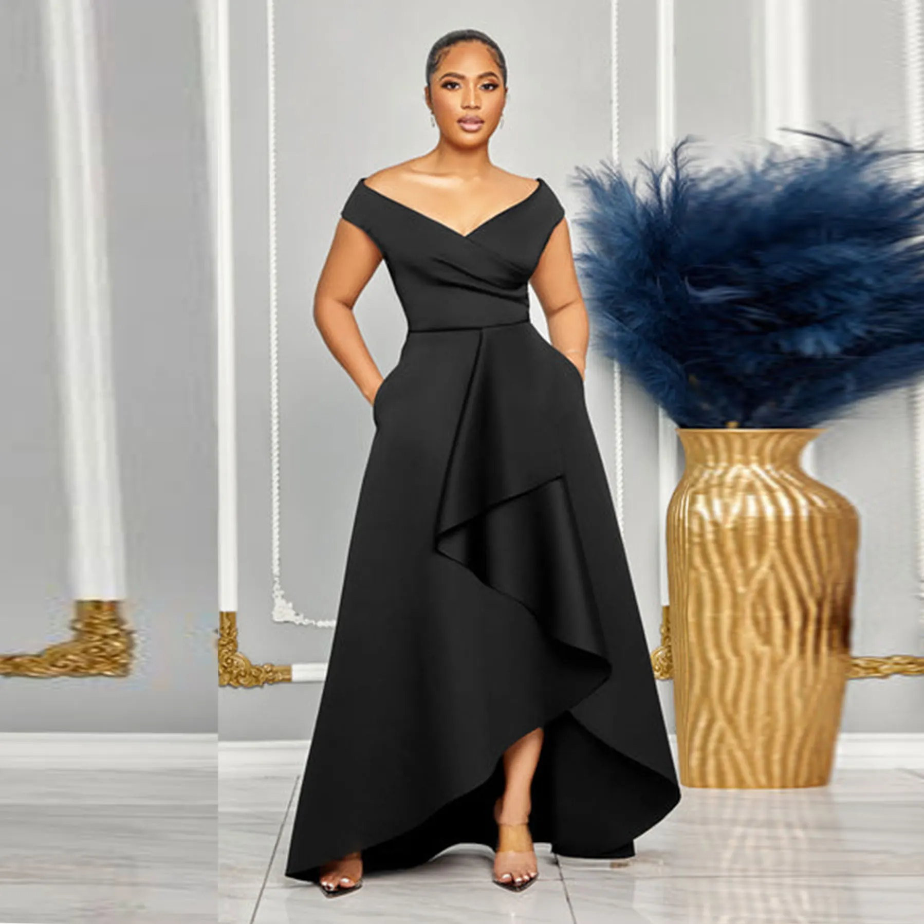 Modest asymmetrical hem maxi elegant dresses casual dresses with deep v neck