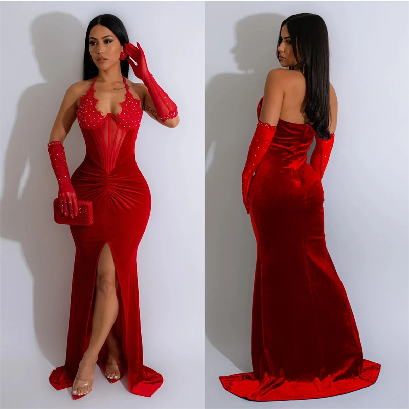 modest shiny elegant royal blue rhinestone bead halter women maxi long evening dress with rhinestones beads cape sleeves gloves