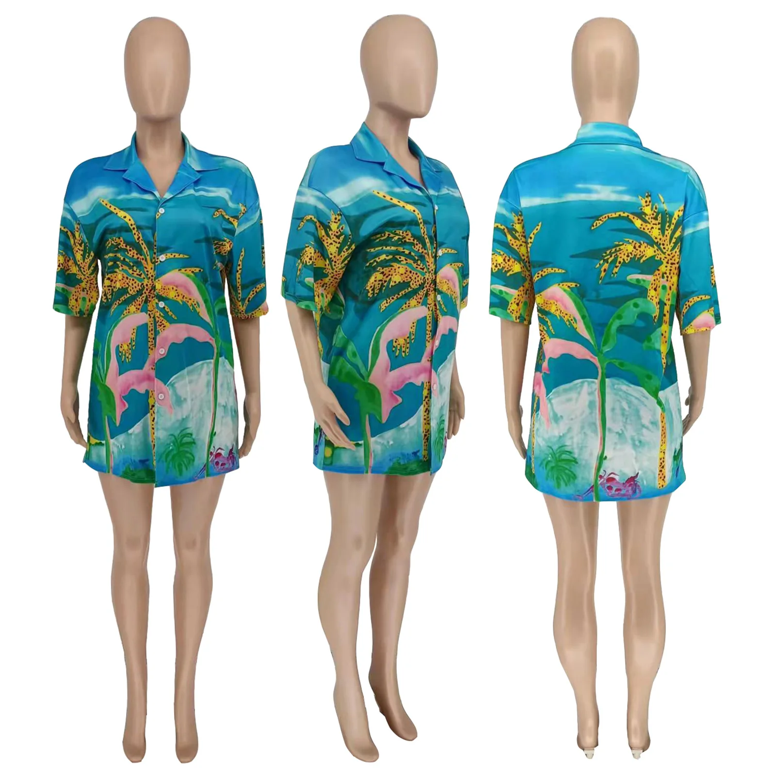Modest summer fashion lady beach casual women tops and blouses printed short sleeve long women's blouses & shirts