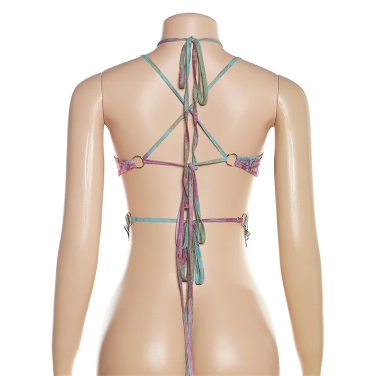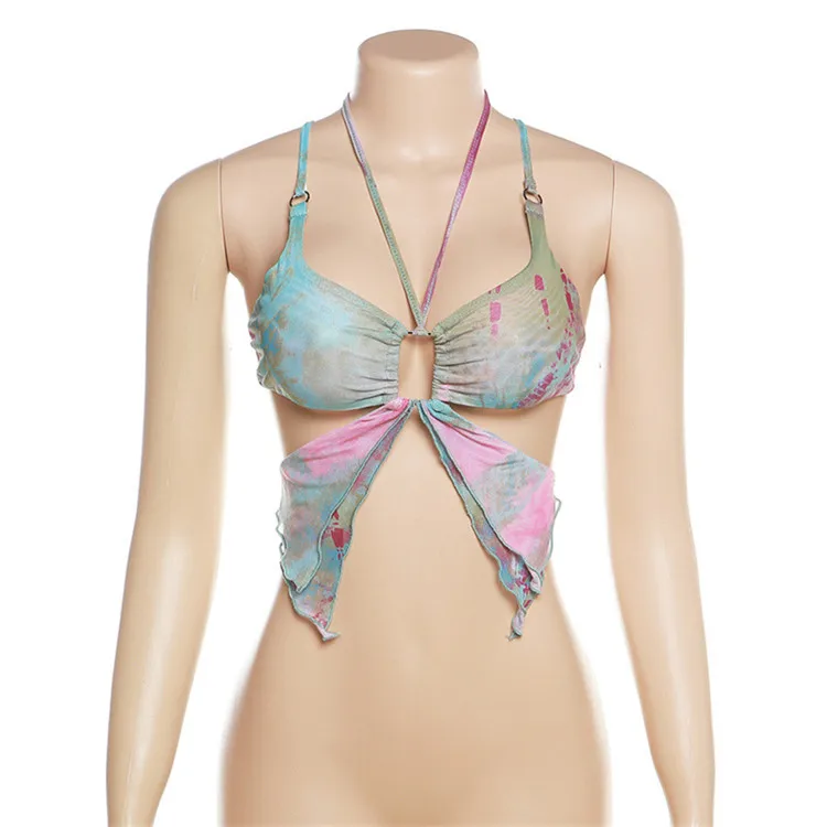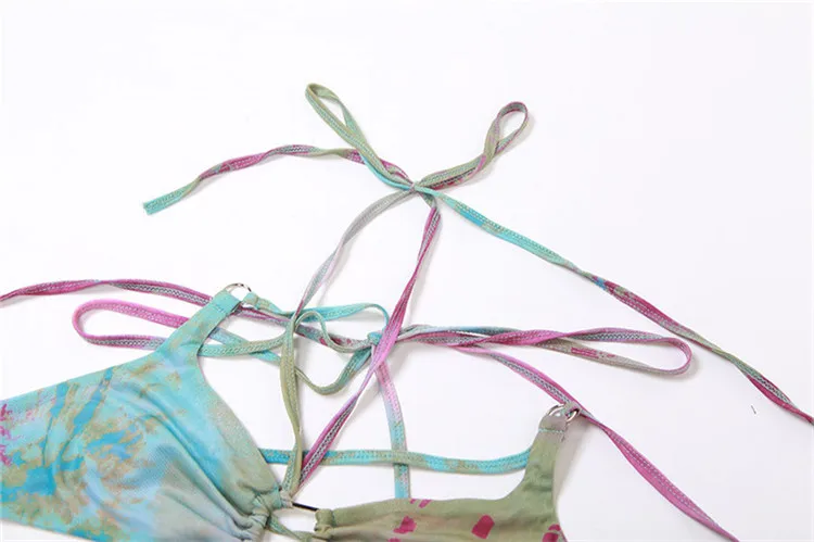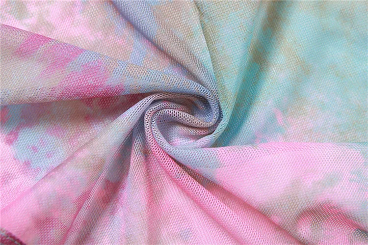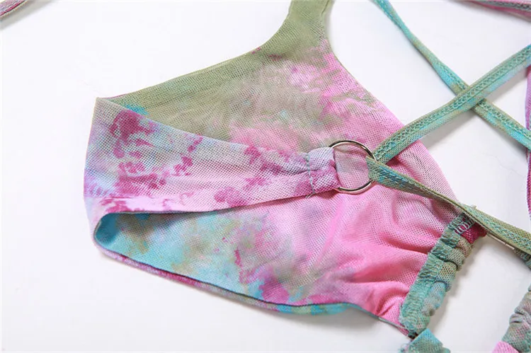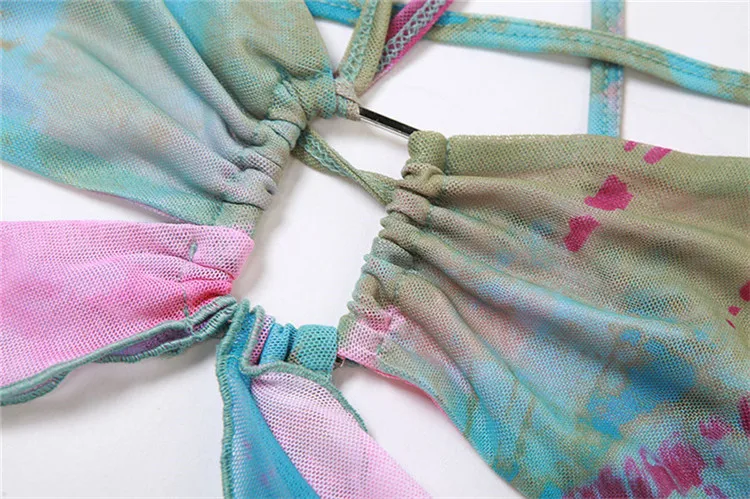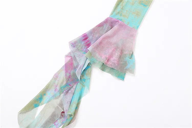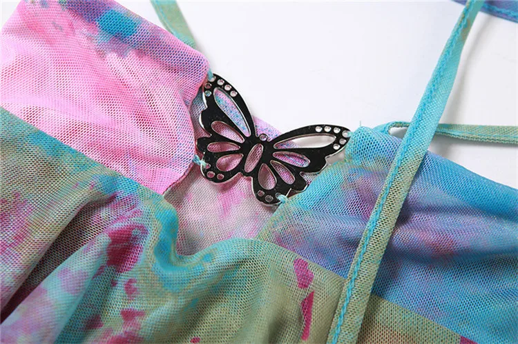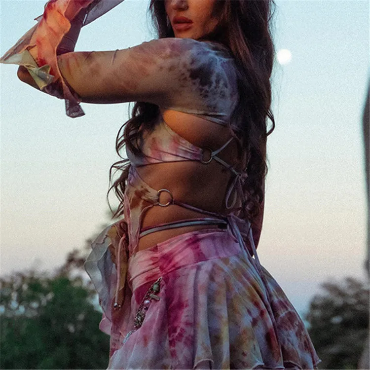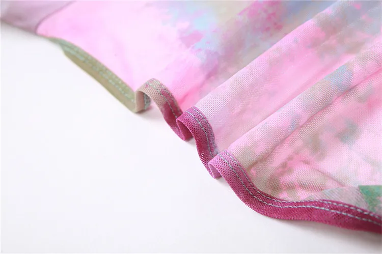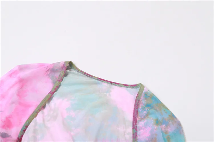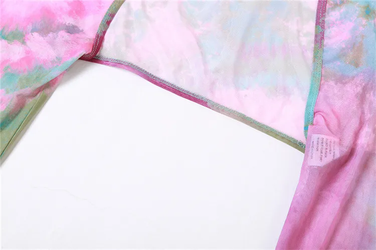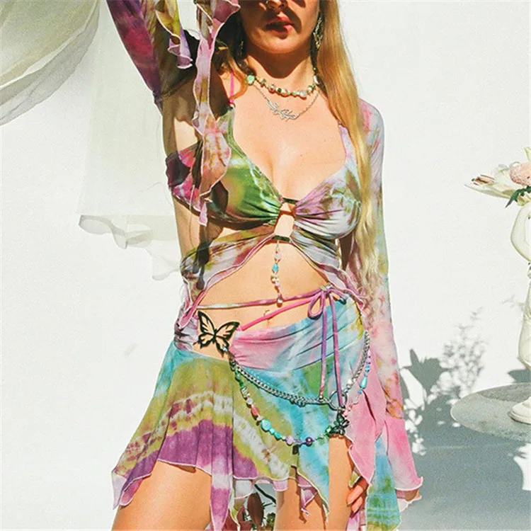 Multicolor Tie Dye Mesh Sexy Three Pieces Set Women Full sleeve Cardigan + Lace Up Vest + High Waist Skirt Streetwear Suit