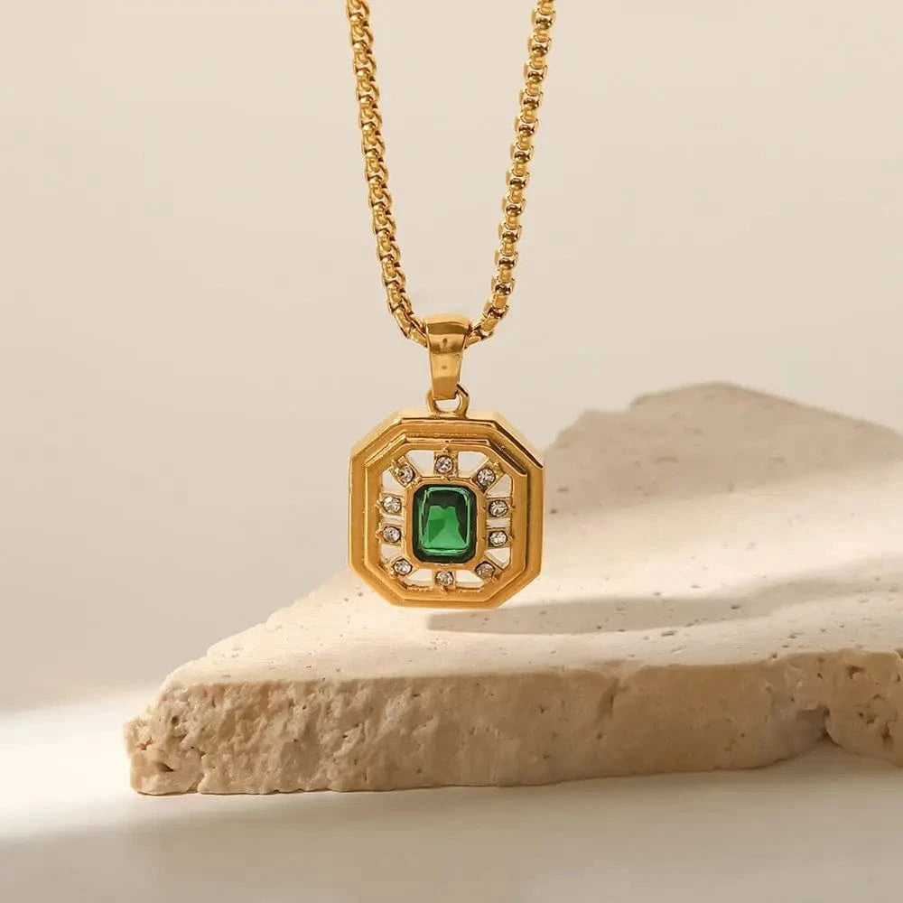 N2416 Vintage Jewelry 18K Gold Plated Box Chain Stainless Steel Hollow Green Zircon Pendant Necklace