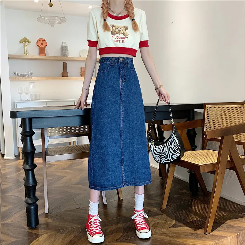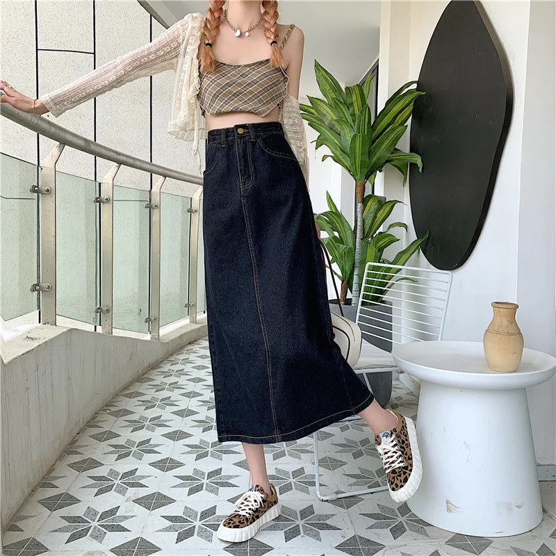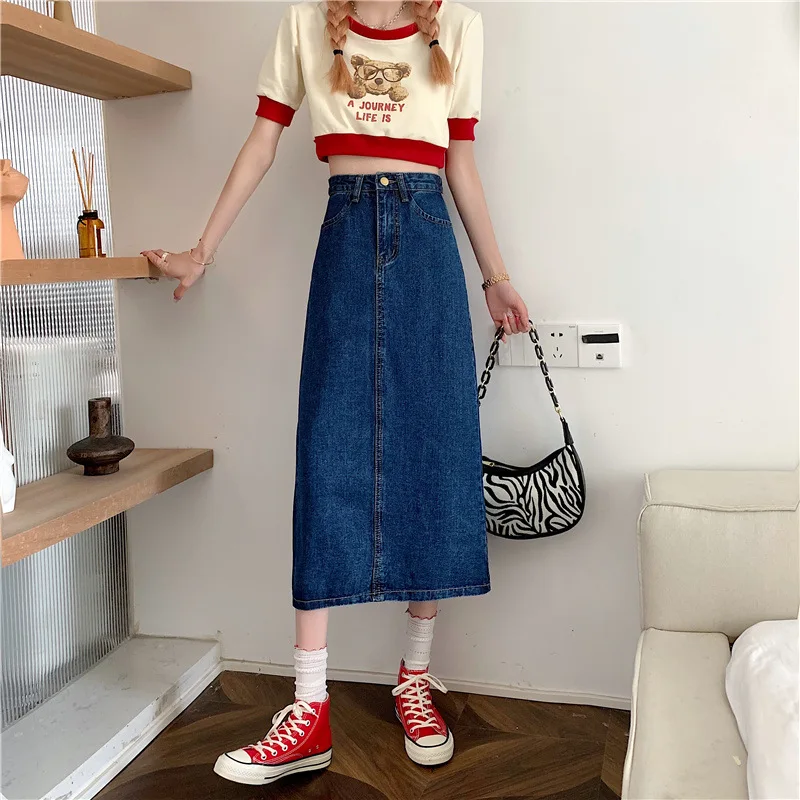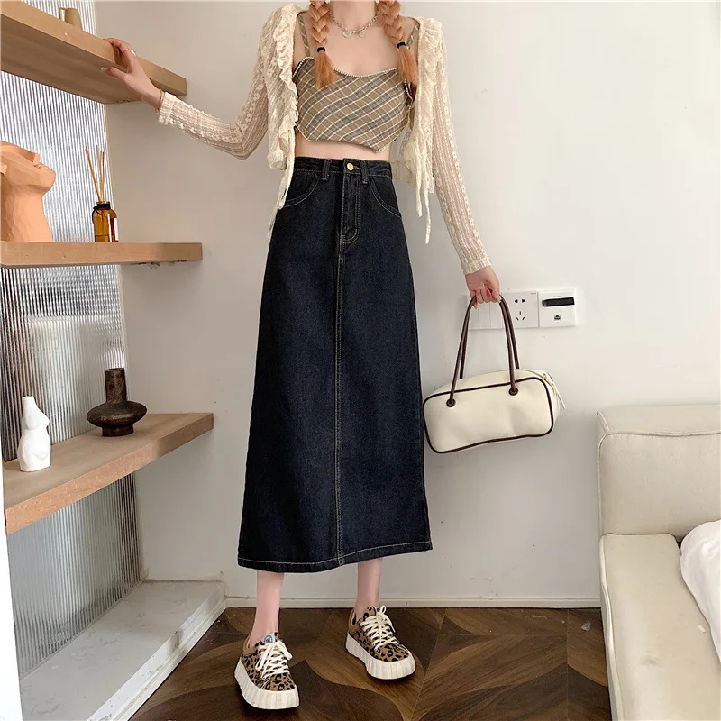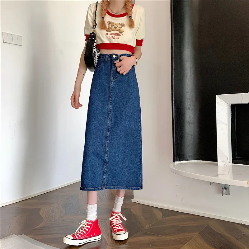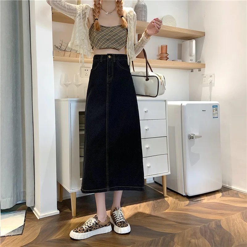 New 2022 Spring-Autumn Medium-Length Denim Skirt For Women High-Waisted Slimming Plus Size Curvy Girls A- Line Hip Covering Skir