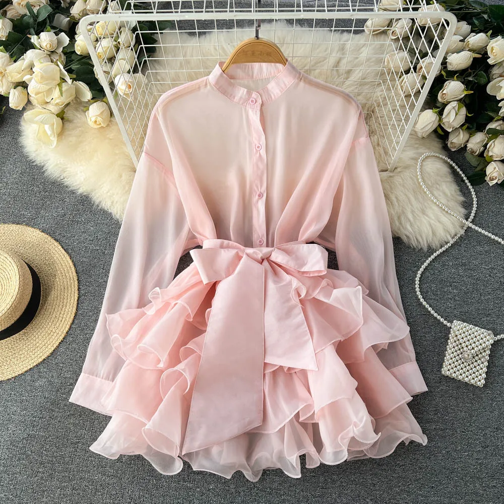 New Arrival Autumn Fashion Chiffon Shirt Solid Color Ruffles Dress Bow Tie Blouse