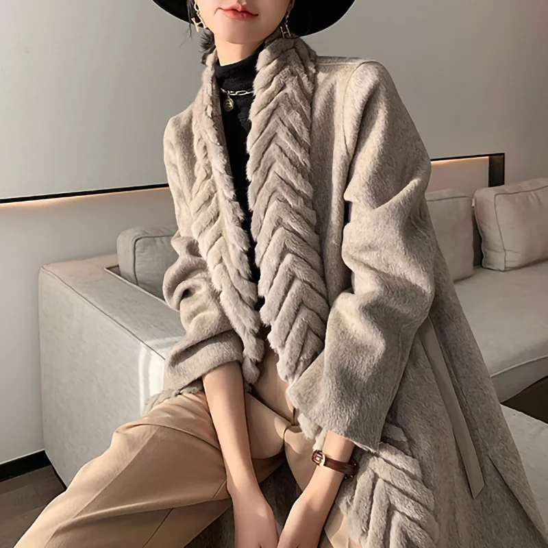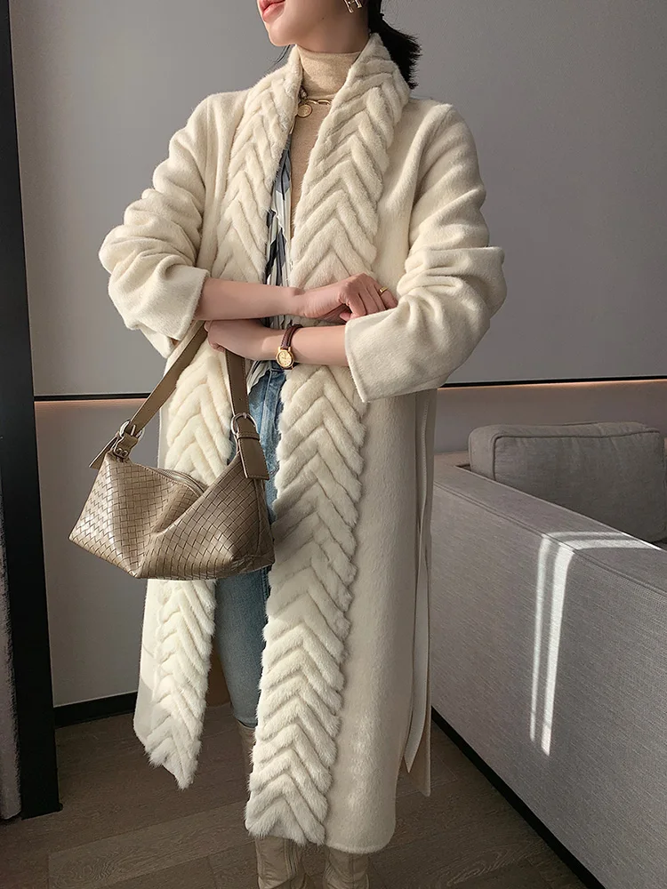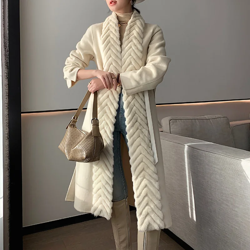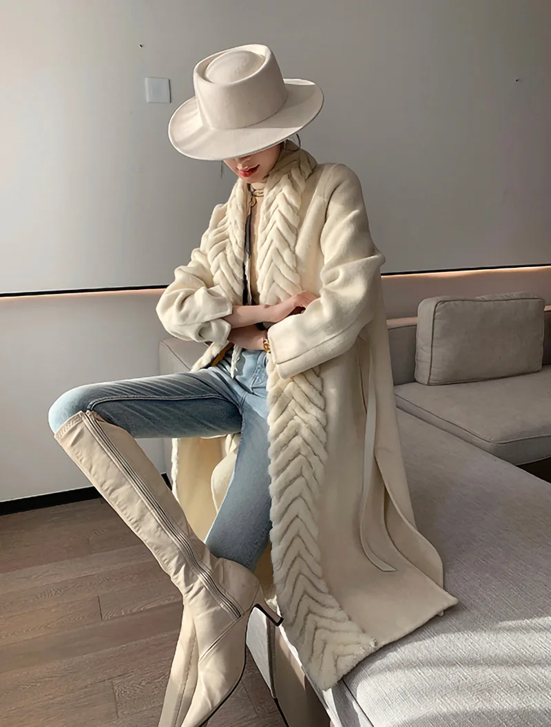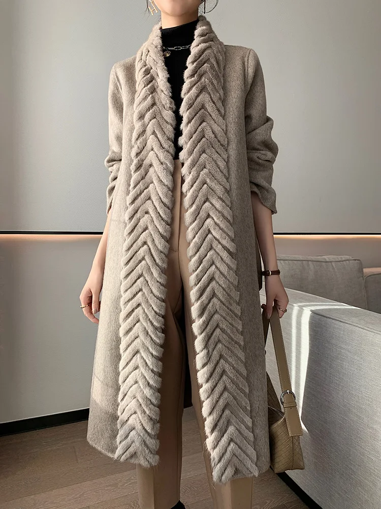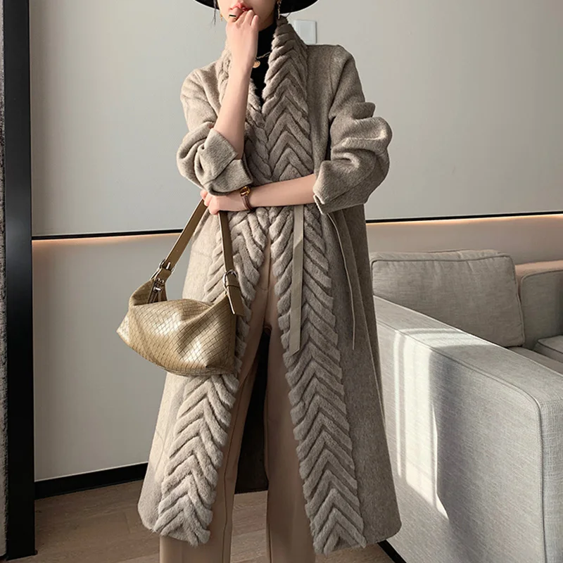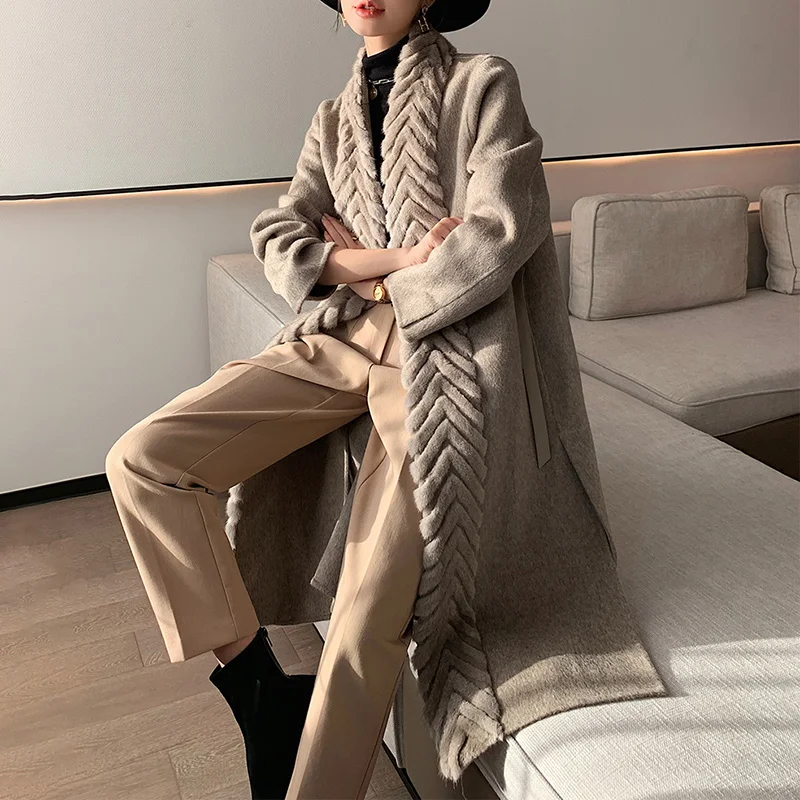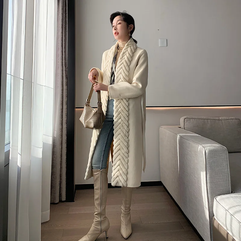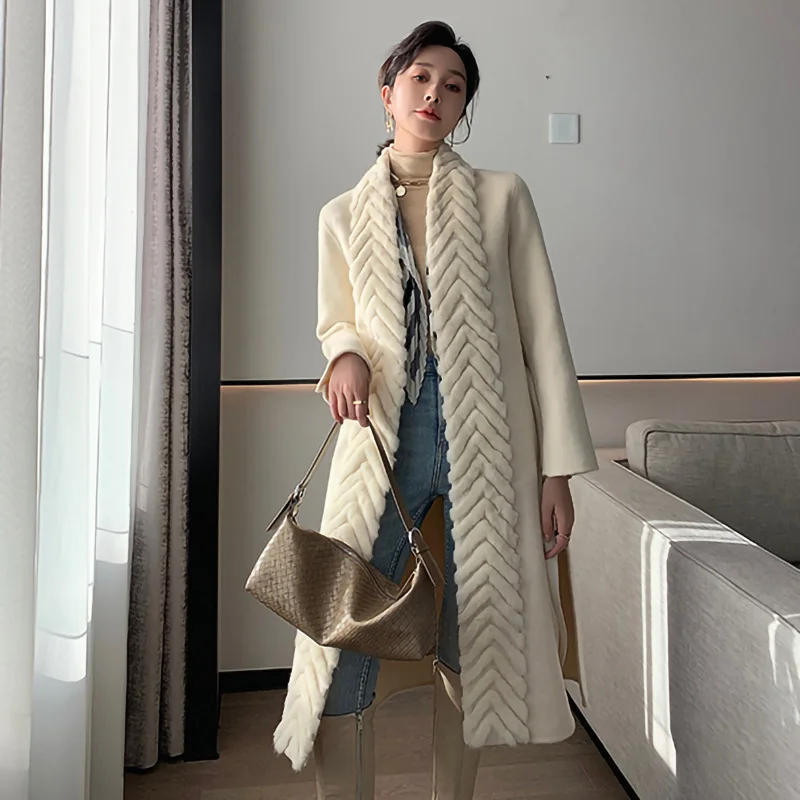 New Arrival Elegant Mink Fur Collar Winter Long Wool Cashmere Coats Women