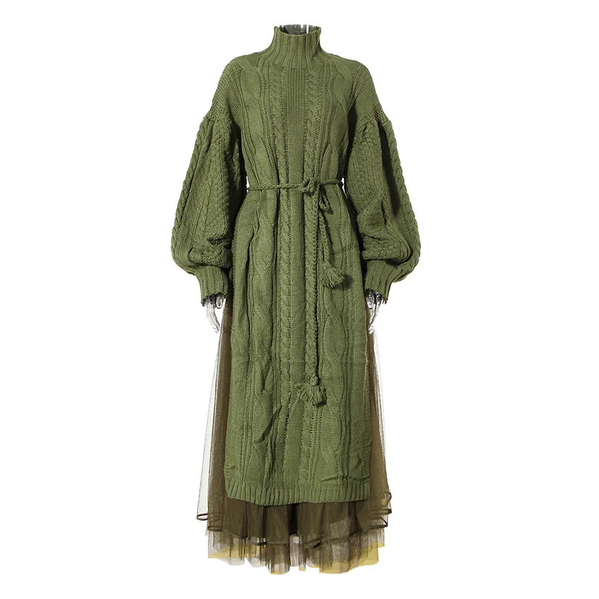 New Arrival Lady Elegant High Neck Long Sleeve Split Knit Sweater Women's Dress And Mesh Two Piece Skirt Set