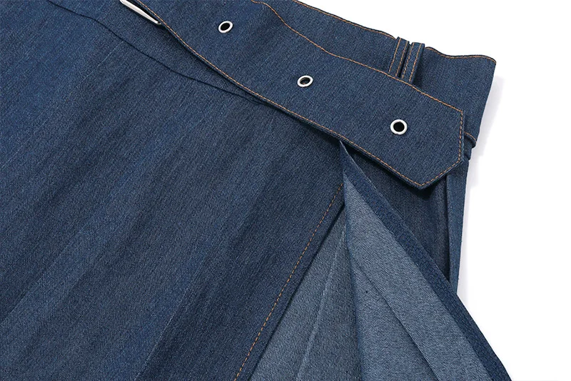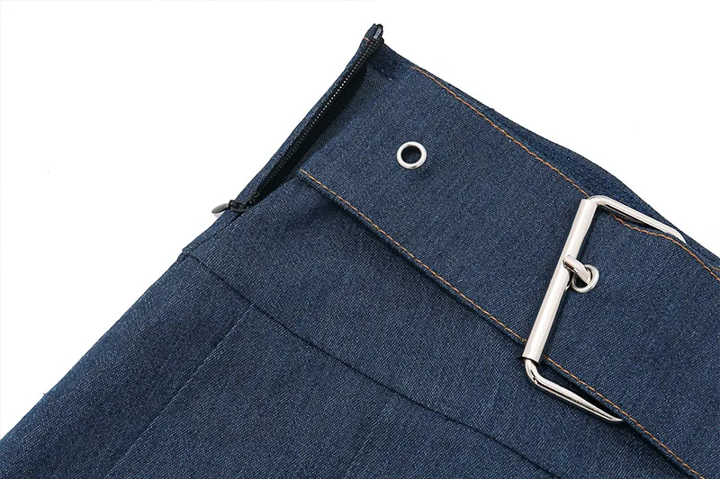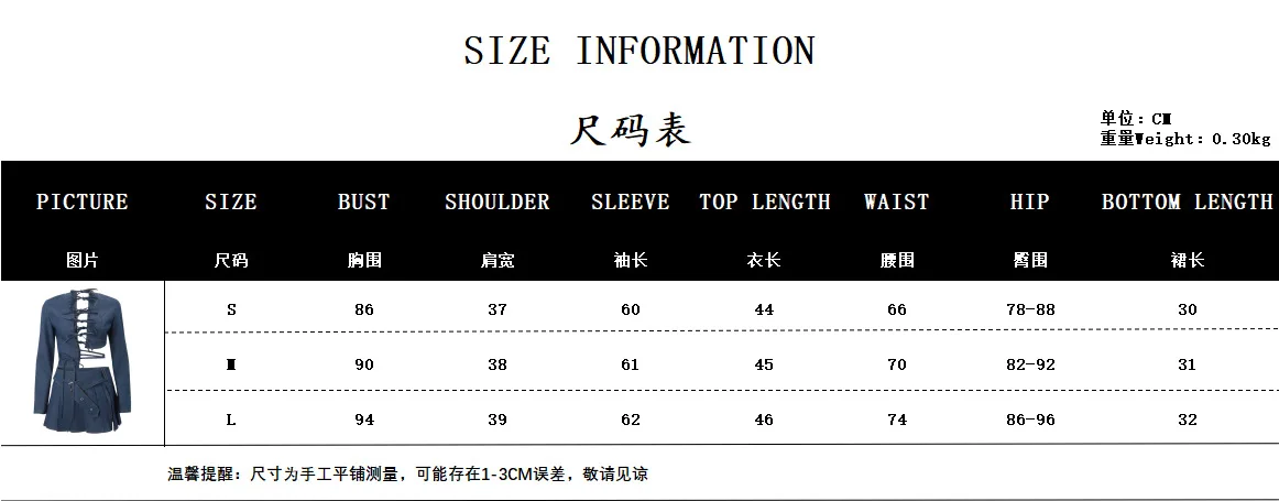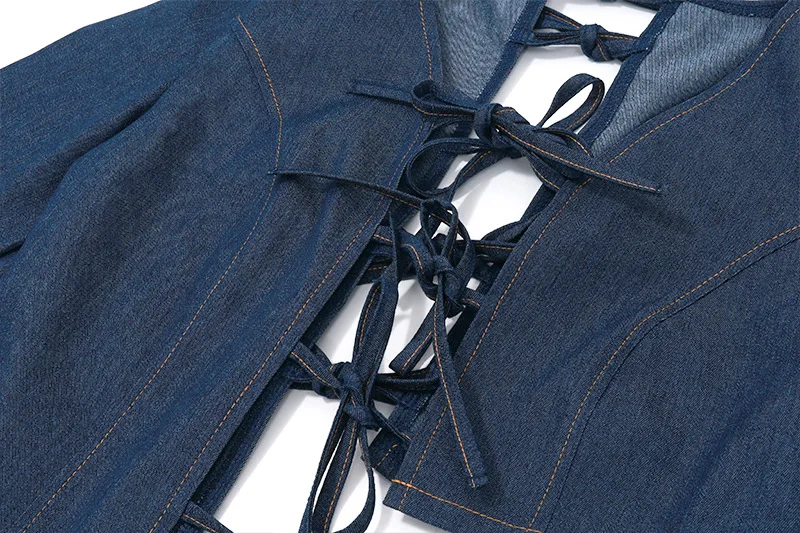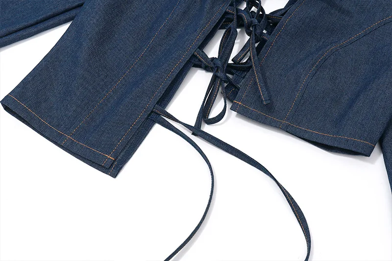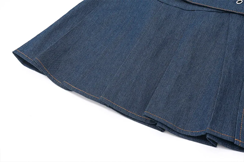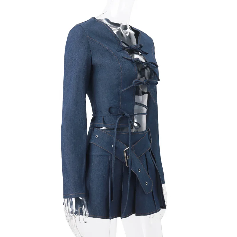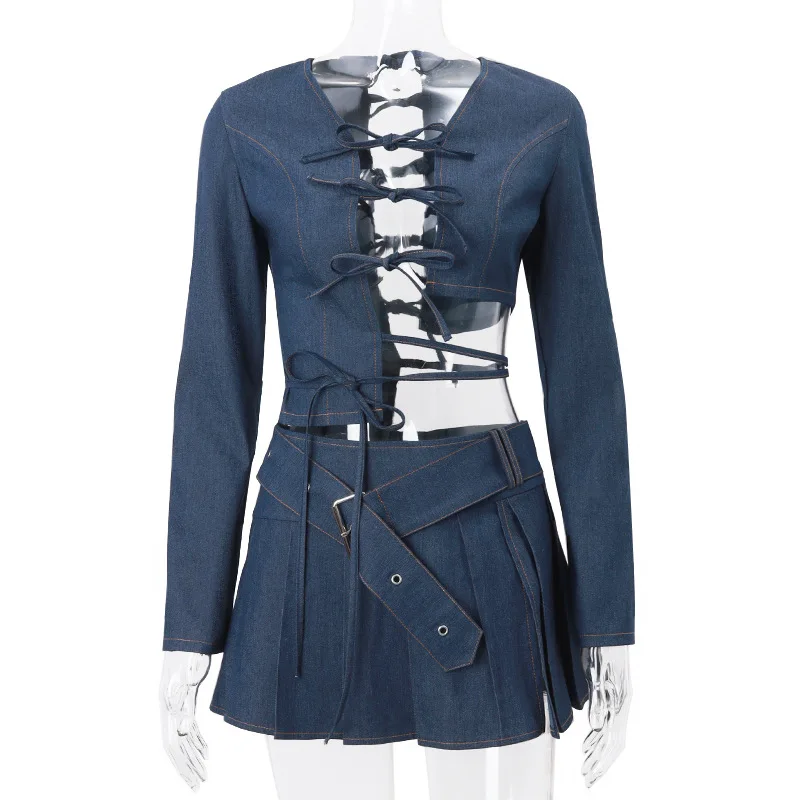 New Arrival Sexy Long Sleeve Bandage Hollow Out Crop Top Mini Pleated Skirt Denim Set Women Two Piece